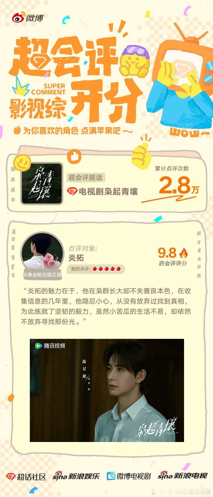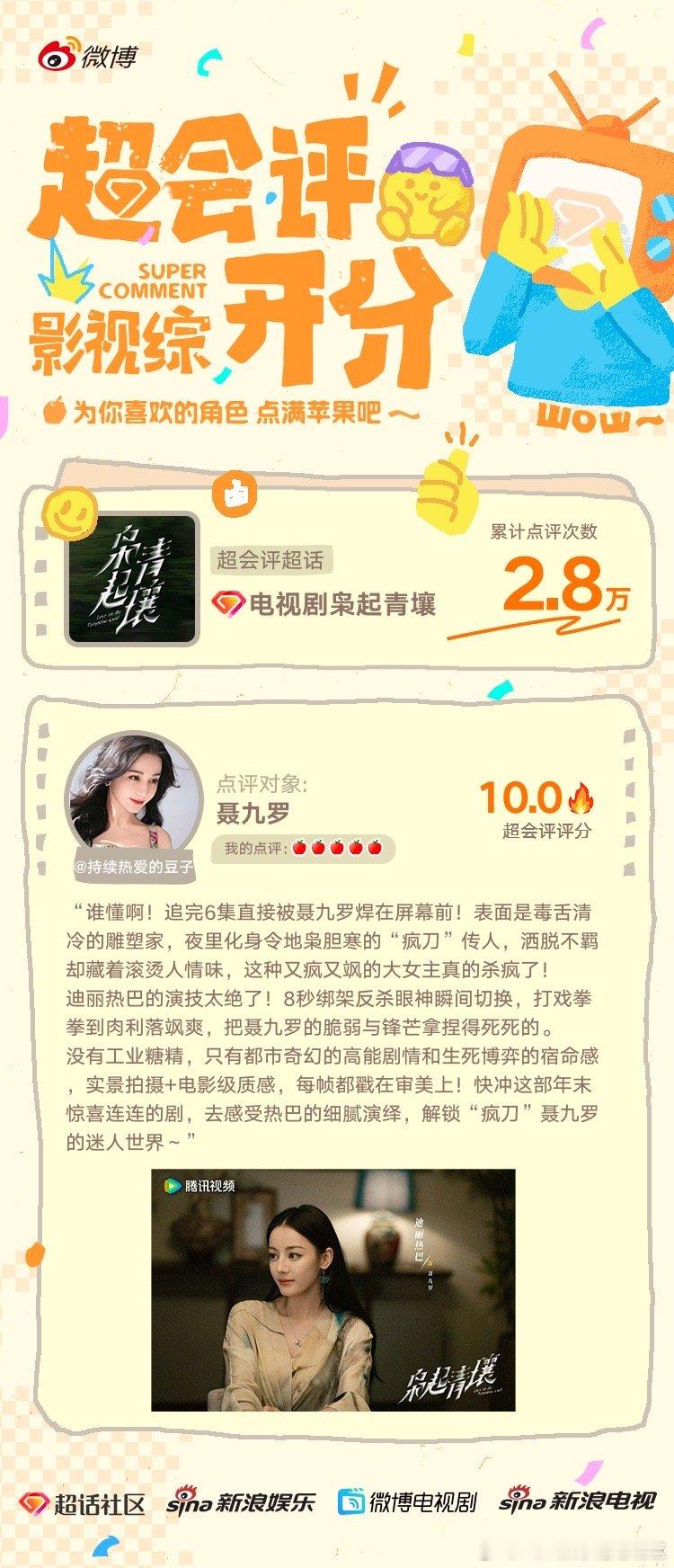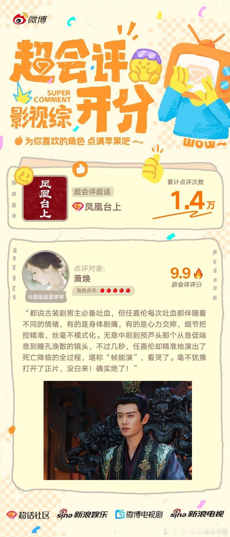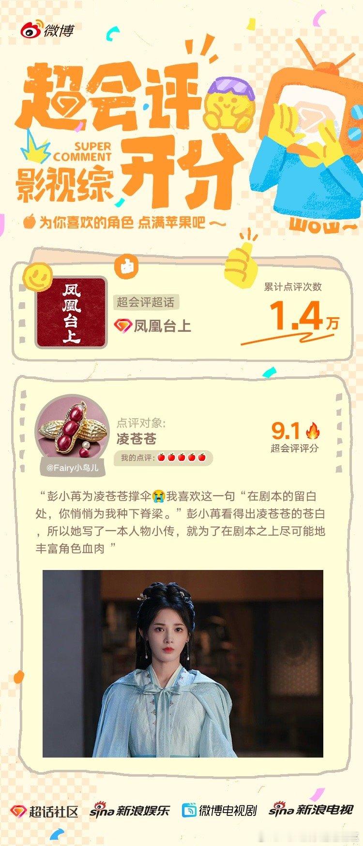 影视综超话超会评开分 恭喜以下uu们为影视综超会评贡献的优质内容,以下被公示的优质点评内容均可获得超话周边礼品一份(此排名不分先后顺序)~电视剧枭起青壤丨凤凰台上丨 电视剧大生意人丨 即刻上场丨 亦舞之城丨 天书黎明丨更多新剧超会评即将上线,欢迎uu们输出对角色的优质点评,活动发起请关注每月月初公布的活动PR!