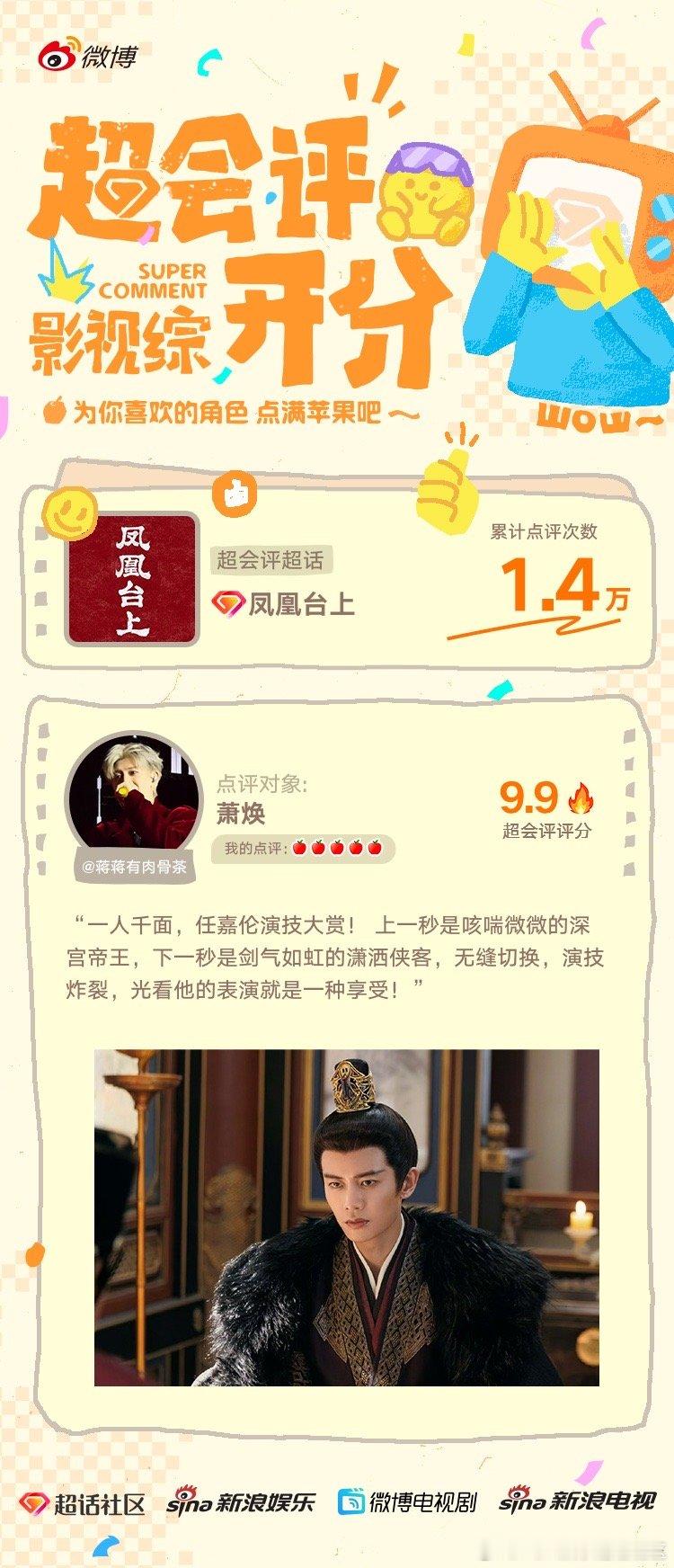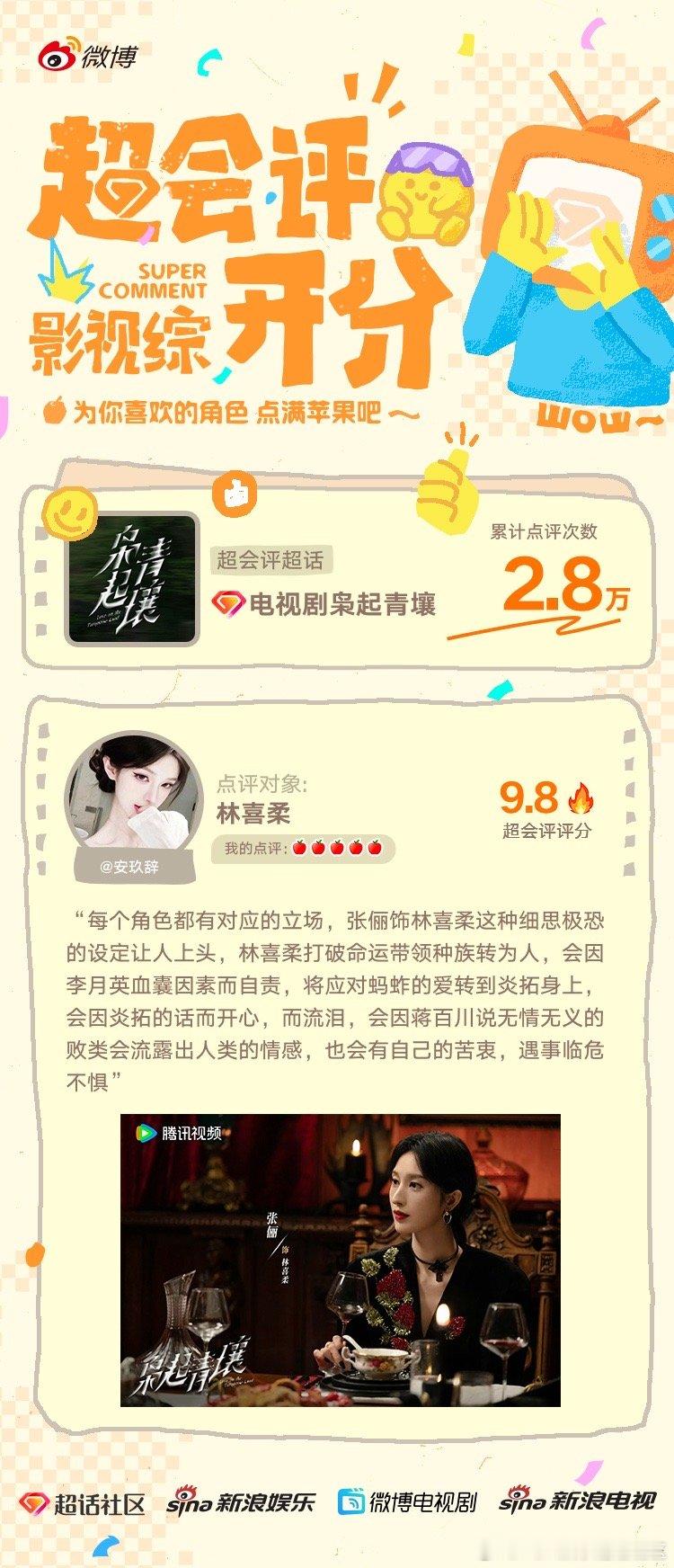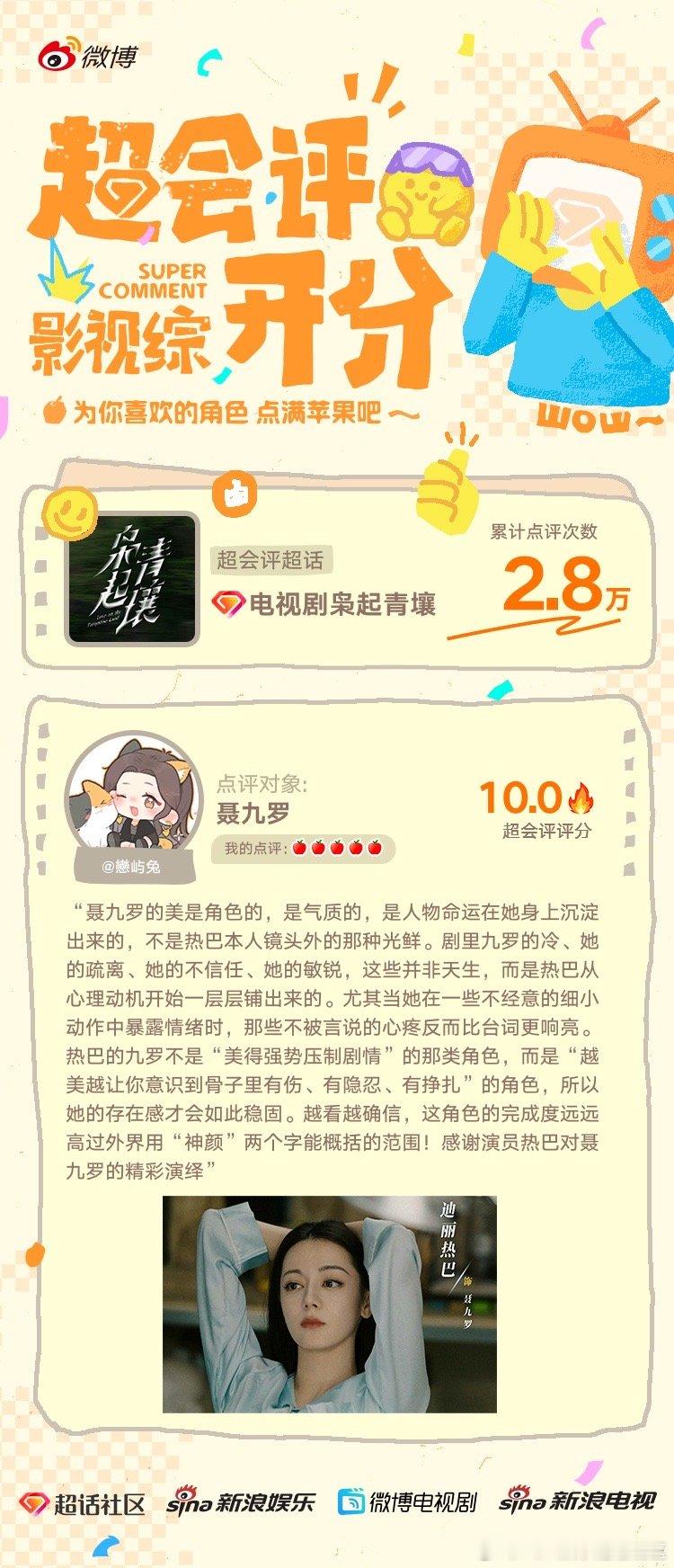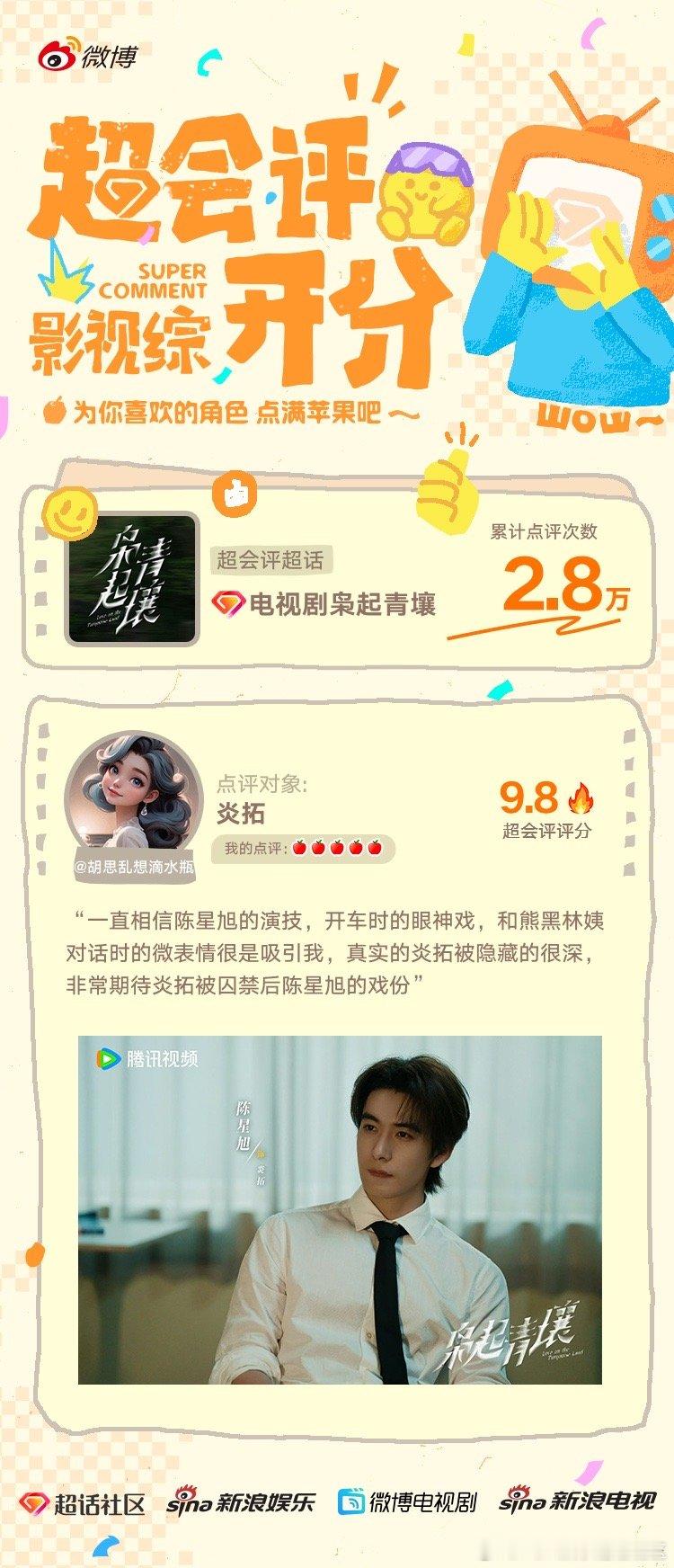影视综超话超会评开分 恭喜以下uu们为影视综超会评贡献的优质内容,以下被公示的优质点评内容均可获得超话周边礼品一份(此排名不分先后顺序)~电视剧枭起青壤丨凤凰台上丨 电视剧大生意人丨 即刻上场丨 亦舞之城丨 天书黎明丨更多新剧超会评即将上线,欢迎uu们输出对角色的优质点评,活动发起请关注每月月初公布的活动PR!