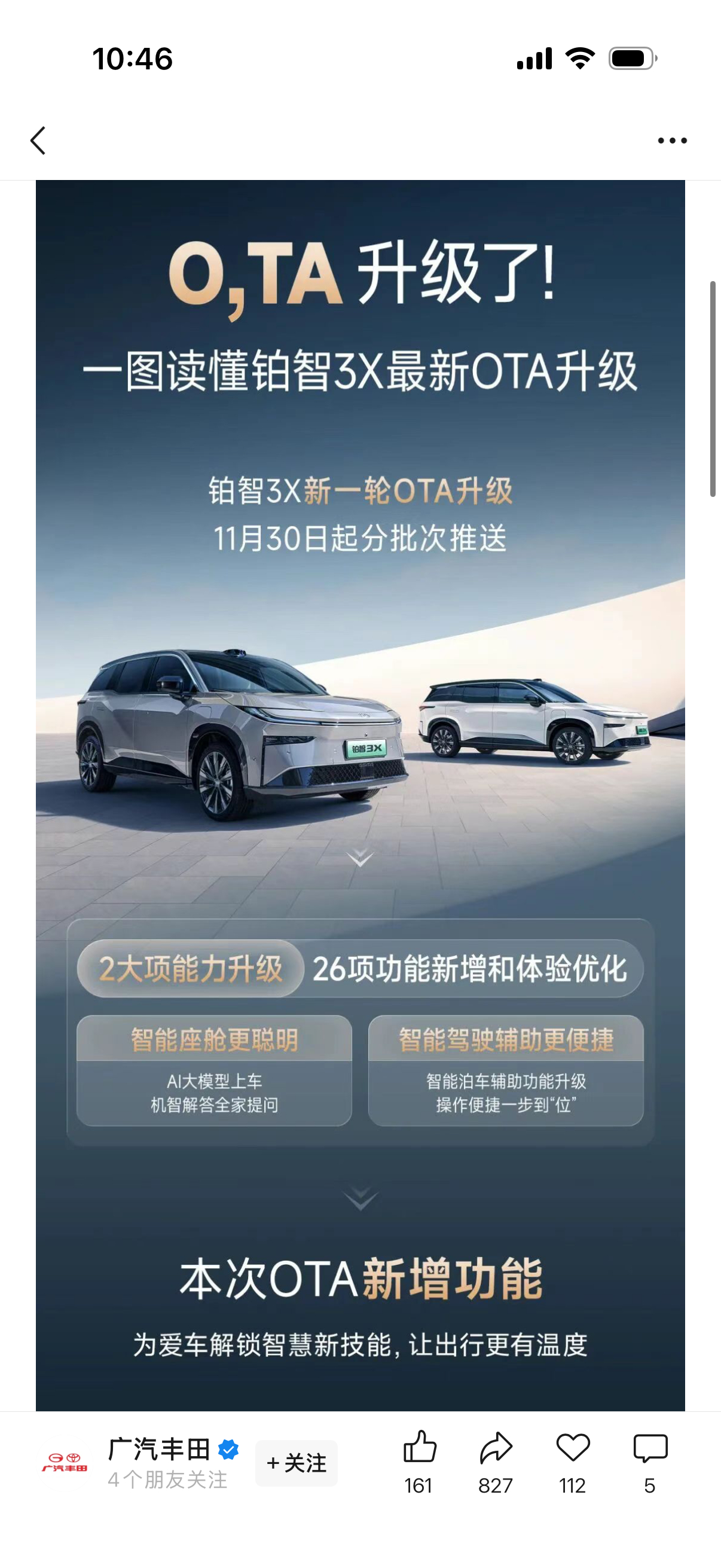 广汽丰田11月销量64905台铂智3X连续两个月销量破万 广汽丰田11月这份成绩单,说实话,有点“稳中带狠”。64905 台的月销量、全年前 11 个月累计 70 万+,在今年这样卷到发烫的车市里,还能保持同比正增长,这是实力,也是底气。尤其是铂智3X,这车连续两个月破万台,11月交付10010台,上市 8 个月累计交付 6.2 万台——这不是“撞大运”,是产品力硬撑出来的。用户热情没退,市场认可度还在涨,这是最难得的。更关键的是,广丰有望在 12 月完成全年 77 万辆的产销目标,传统大厂能把节奏控得这么精准,说明它们已经彻底适应了新能源时代的竞争方式。可以简单总结三点:1️⃣销量稳:整体盘子大,还在涨。2️⃣单车热:铂智3X是真火,不是虚火。3️⃣体系强:从产品到OTA迭代,都在向新势力看齐甚至反超。一句话:广汽丰田不只是“活下来”,而是“活得更硬气”。