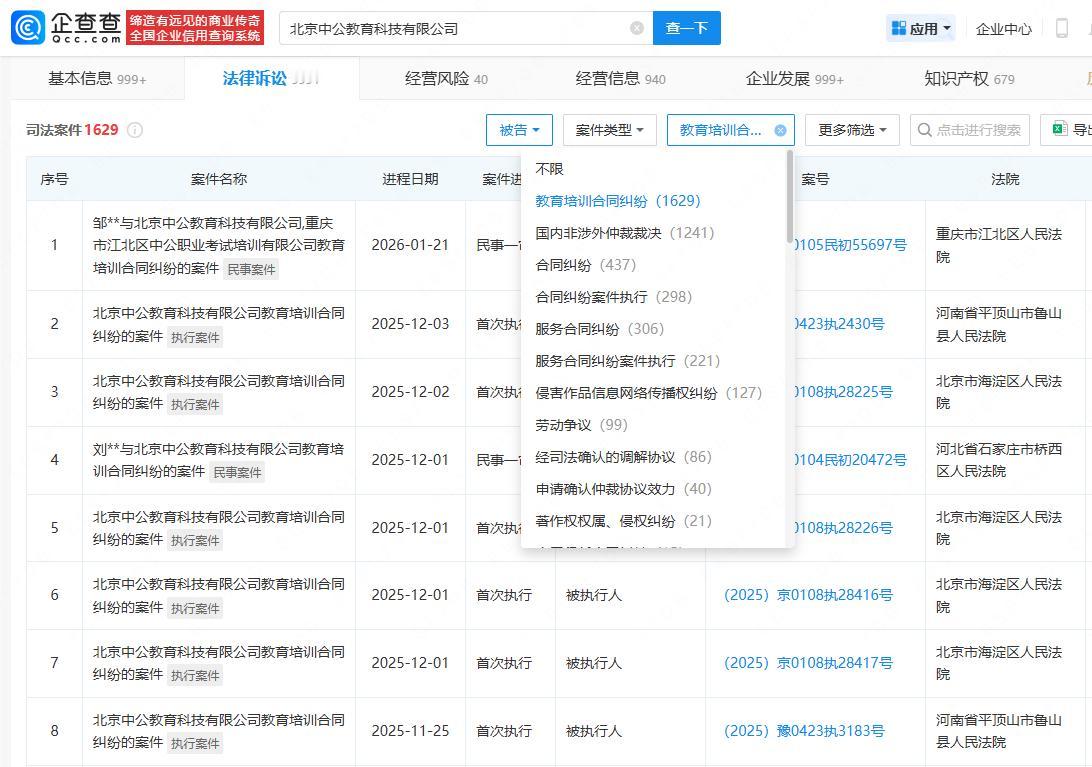 【中公教育以物抵债退落榜考生学费,中公教育被执行金额超4000万】 近日,“中公教育以物抵债退落榜考生学费”一事引发关注,中公教育“不过包退”的协议班爆雷已三年,胡小杰还没有收到全部待退的学费。据报道,漫长的退费拉锯战中,中公教育推出了退费的替代方式。学员可以在中公教育旗下的商城选择商品“以物抵债”,也可通过推荐亲友报名中公教育课程,将协议班退费抵扣学费。 企查查APP显示,北京中公教育科技有限公司当前关联千余起教育培训合同纠纷,已成失信被执行人。此外,目前该公司被执行总金额已超4200万。今年8月,中公教育发布的半年度报告显示,公司待退费的负债超过4.82亿元。