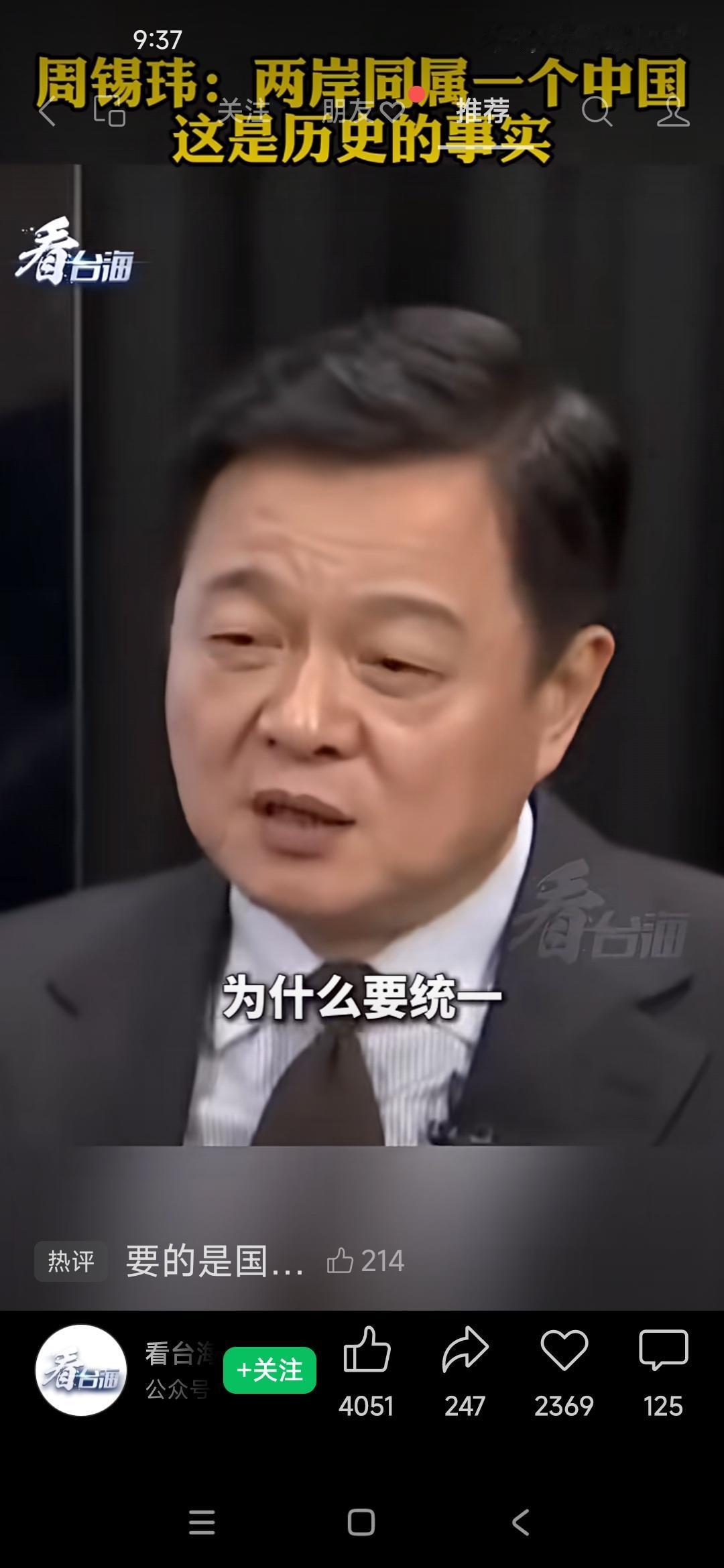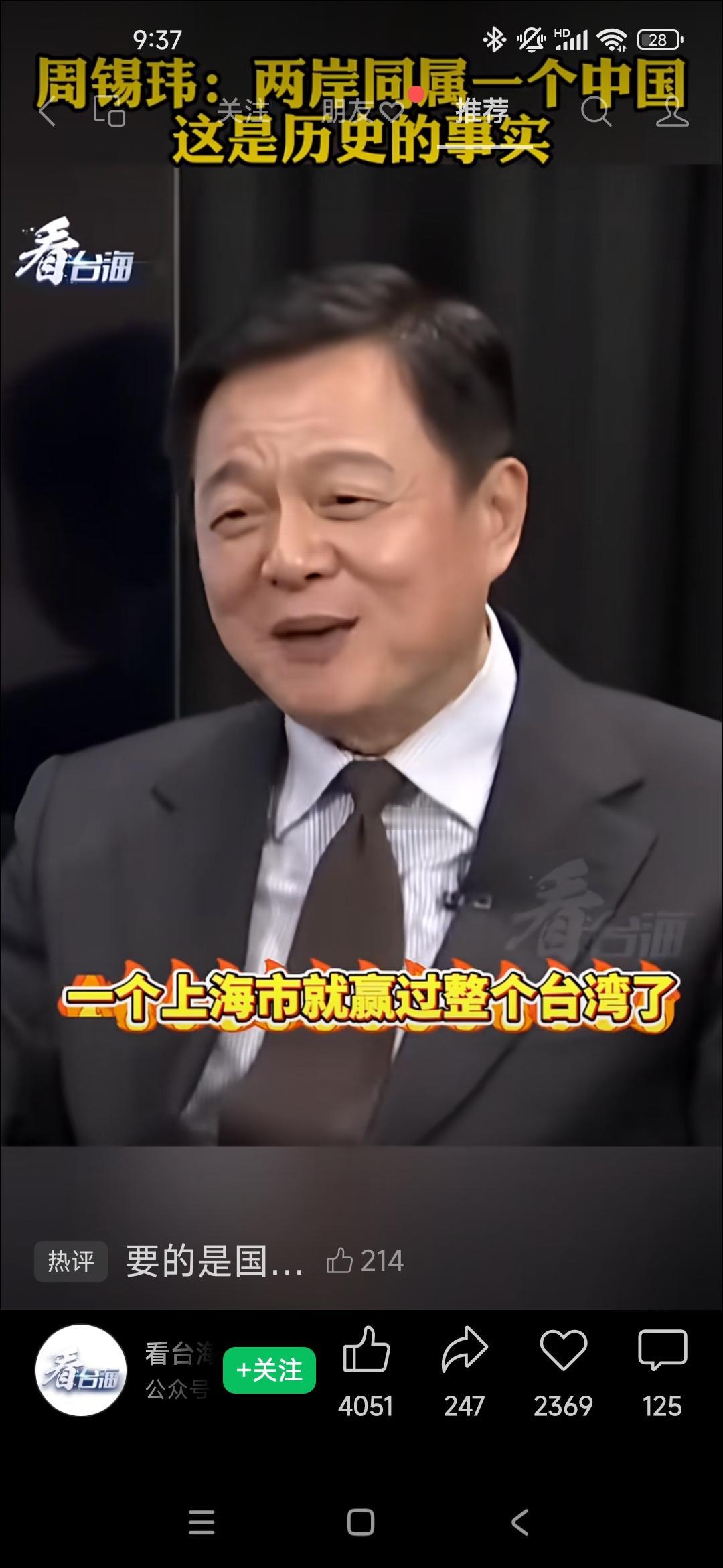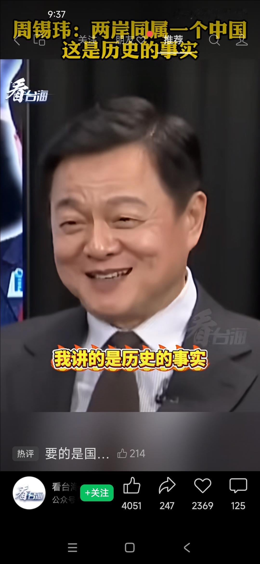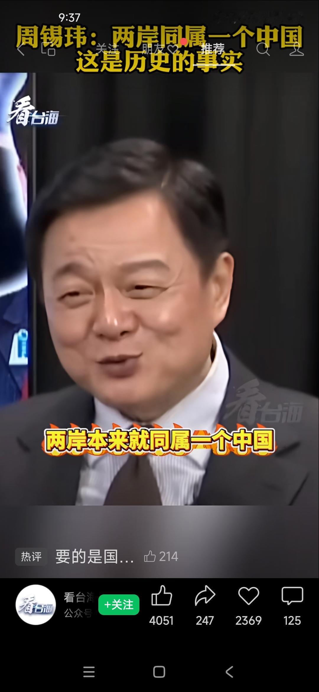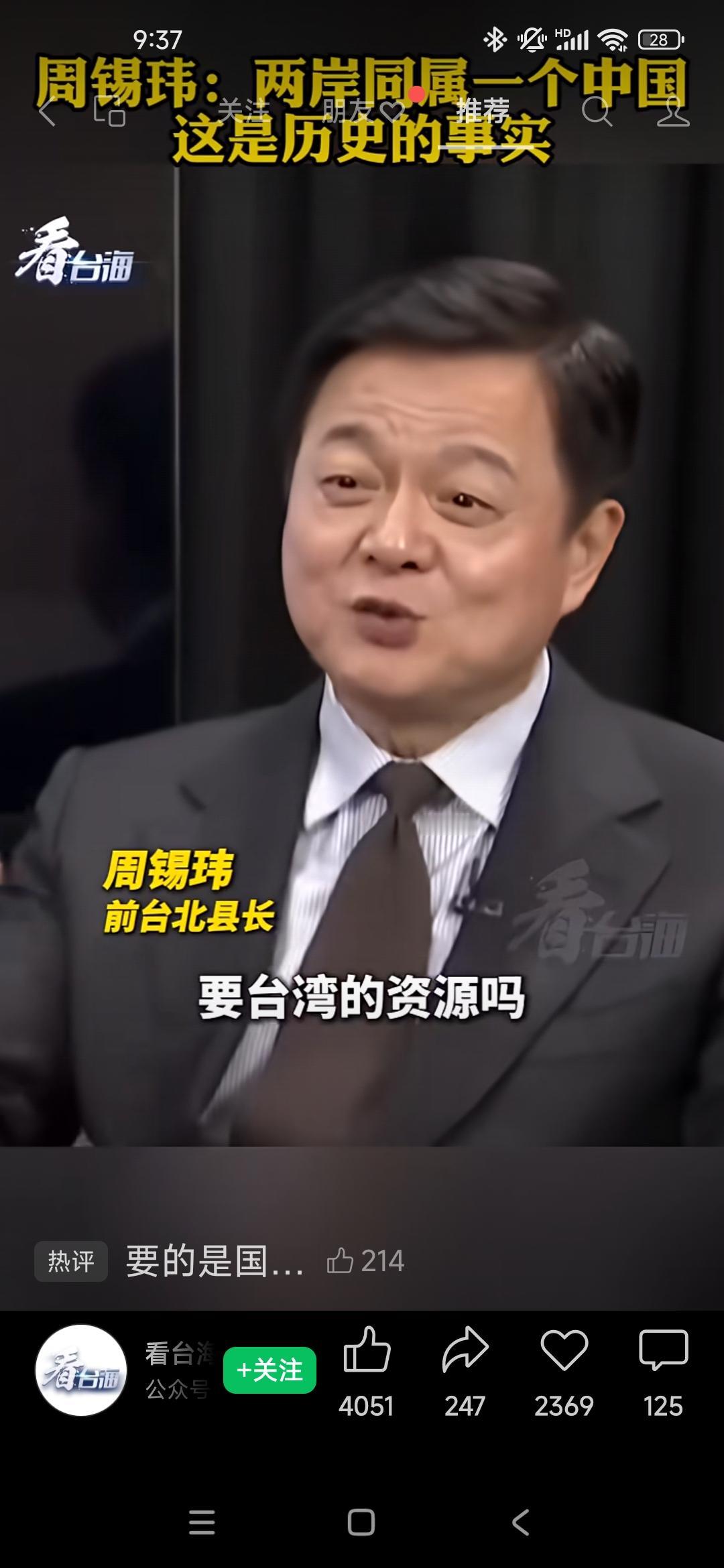 周锡玮:两岸同属于一个中国,这本来就是事实! 大陆要台湾什么?要台湾的资源吗?台湾有什么资源? 要台湾的钱吗?一个上海市的产值就赢过整个台湾了! 那为什么要和你统一呢?因为两岸本来就同属于一个中国。 我讲的是历史事实啊! 编者:大家有什么感想呢?