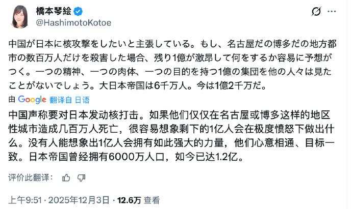 “中国声称要对日本发动核打击”了?这个名叫桥本琴绘的日本右翼女作家正在进行这样的误导和煽动。老胡不知道在日本有多少人在与她同样叫嚣。 不首先使用核武器,不对无核国家实施核威胁,这是中国核政策的基石。中国从没有对日本进行过核威胁,这是事实。中国民间有人出于义愤喊出“核平”日本,但我不记得任何有影响力的网络大v或公众人物做过同样主张。 但是如果日本在台海攻击解放军,将被视为对中国宣战,中国使用常规力量也能把日本打出屎来,而且一旦战争升级,整个日本都可能沦为战场。请桥本琴绘女士把这些信息传递给她的读者,准确引导他们想象力的方向。 中国不会对坚持无核三原则的日本实施核打击和核威胁,但是如果日本放弃无核三原则,制造或引进核武器,并且利用它们对华采取咄咄逼人的军事政策,那么日本堕入另一场核灾难的风险将大为增加。老胡的这个解读也请桥本琴绘传递给她的读者。 由于桥本琴绘宣扬的“中国声称要对日本发动核打击”本身就子虚乌有,她接下来叫嚣“很容易想象剩下的1亿(日本)人会在极度愤怒下做出什么”也就不值得细看了。但我想到,日本1945年挨了美国两颗原子弹之后,所采取的行动并非极端报复,而是无条件投降。这让我觉得桥本琴绘接下来想象的日本报复蛮可笑的。 中日应当和平共处,两国是搬不走的邻居。日本应放弃武力干预台海事态的计划,自我化解对中国和平发展的敌意,在中美之争中保持中立。那样的话,日本会很安全。 桥本琴绘作为日本作家,应当宣扬和平主义,而不应鼓动对抗,煽动战争。