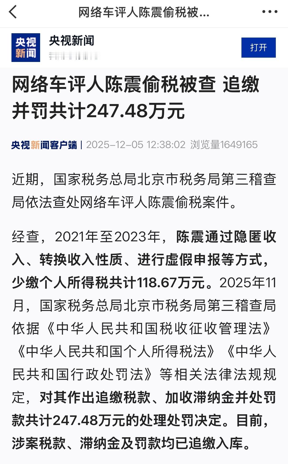 陈震偷税案偷税漏税是违法行为了,高收入群体合法合规纳税是理所应当的,怎么想到偷税漏税啊。不知道继全网账号封禁之后,接下来还会有什么处罚