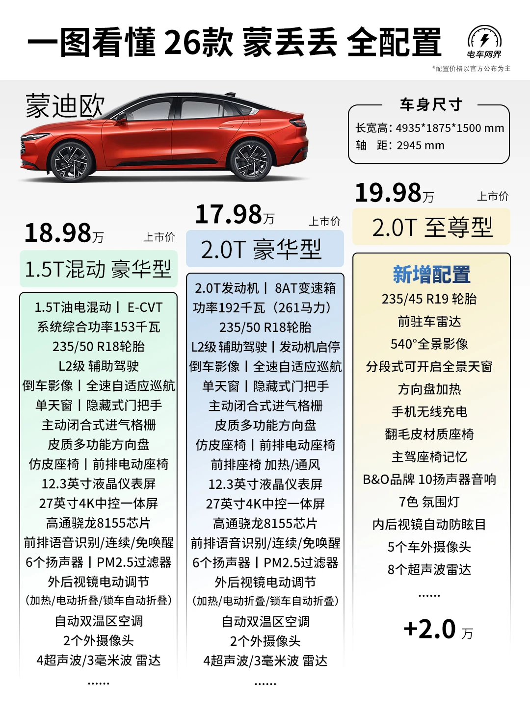 26款福特蒙迪欧来了,14.98万元起,共6个版本可选,具体配置(如上图)。 简单总结一下,主要升级集中在四个地方: 外观:前脸换了,八边形中网+新车灯,尾灯神似福特野马,同款三柱设计,新增赤霞红、沧海蓝车色。 内饰:换装悬浮中岛,车内材质提升,新增空调实体按键,储物空间升级到47.5L,后备厢空间520L。 智能:12.3英寸仪表+27英寸一体大屏,升级8155芯片、高德地图和Carplay(最低配除外)。 动力:提供1.5T、1.5T油电混动以及 2.0T EcoBoost发动机可选,2.0T版最大马力261Ps、408N·m,比现款稍微提升那么一丢丢,匹配8AT变速箱,零百加速达到6秒级。 大家觉得这个价格怎么样?哪个版本最适合你呢?