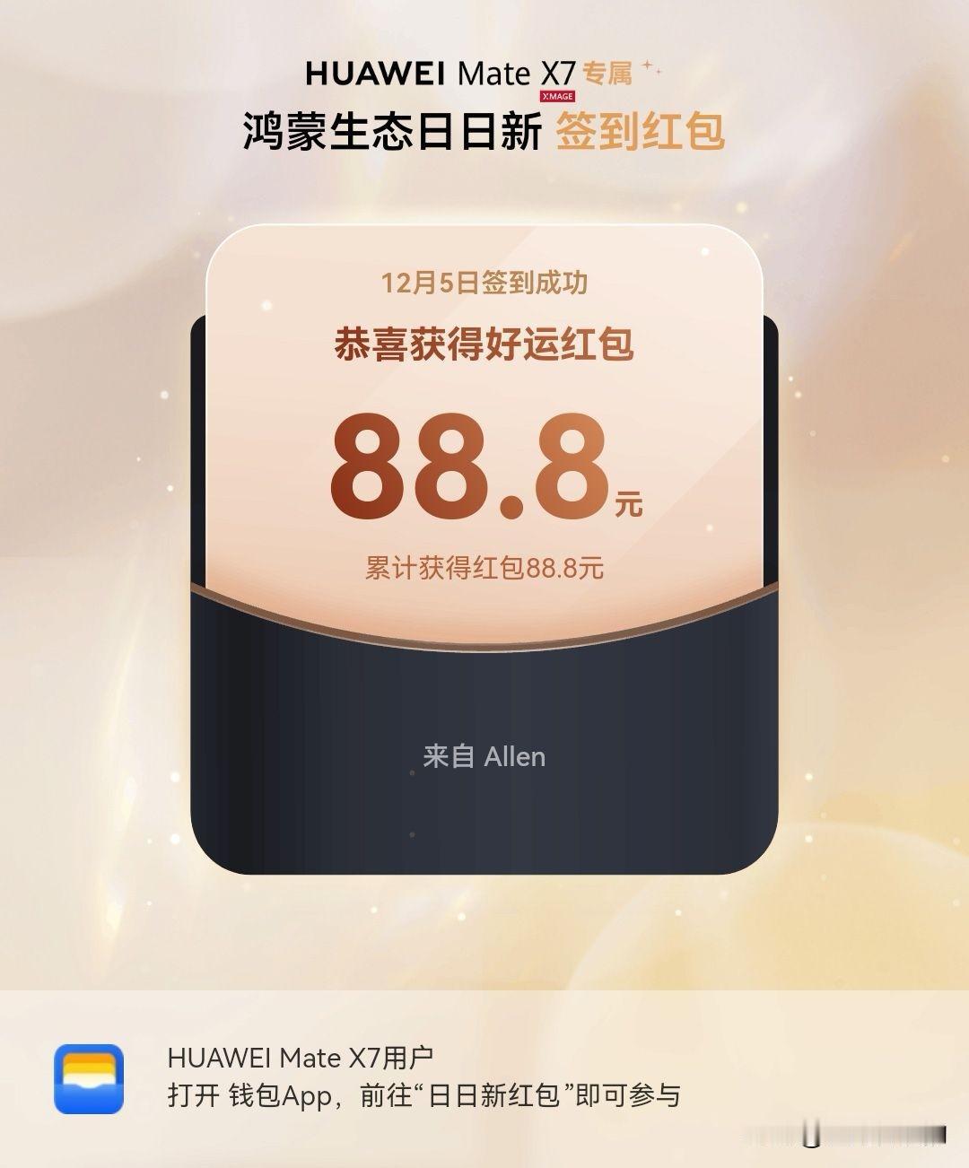 华为Mate X7在12月5日10:08正式开启销售大门,这一时刻,科技圈沸腾了!而更让人兴奋的是,鸿蒙日日新红包也同步来袭。 在华为Mate80系列丨Mate X7及全场景新品发布会上,华为Mate X7就凭借众多亮点吸引了无数目光。超可靠折叠玄武架构让手机更耐用,第二代红枫影像带来出色拍摄效果,首发搭载鸿蒙6更是开启了全新交互体验。如今开售,鸿蒙日日新红包成为了一大惊喜。 用户纷纷自发晒单分享自己领取的红包,那金额让人惊喜不已。这红包就像是一个个小惊喜,每天等待着用户去开启。对于购买华为Mate X7的用户来说,这无疑是一份额外的厚礼。 华为Mate X7的价格也很不错,不同版本从12G + 256GB的12999元到20GB + 1TB典藏版手写笔套装的17599元,满足了不同消费者的预算和需求。如果你也想拥有这款引领折叠屏行业潮流的华为Mate X7,同时享受鸿蒙日日新红包带来的福利,那就别错过这次机会! 华为新款折叠屏全色售罄 华为MateX7开售门店火爆 华为Mate X7开售即告罄