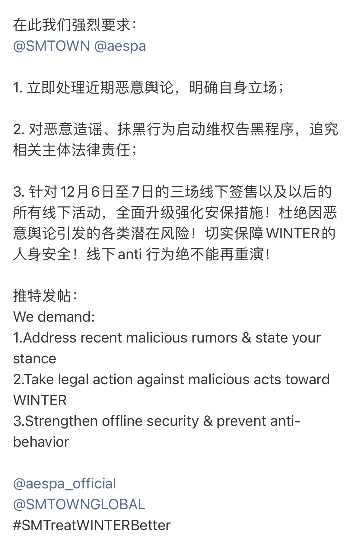 金玟庭粉丝发文 金玟庭粉丝发文维权,要求SM娱乐处理恶意舆论,对恶意造谣、抹黑行为启动告黑程序,同时升级安保措施,保护艺人安全。