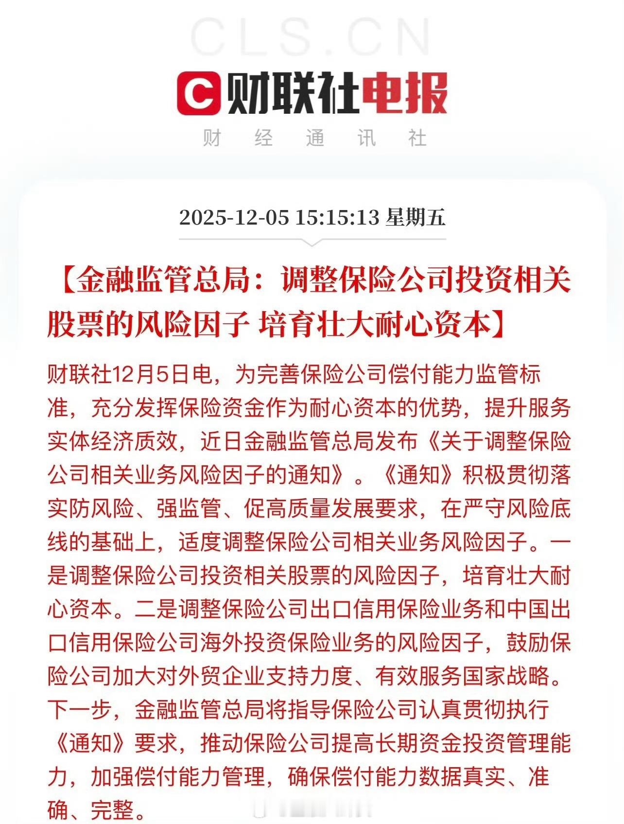 金融监管总局:调整保险公司投资相关股票的风险因子,培育壮大耐心资本
