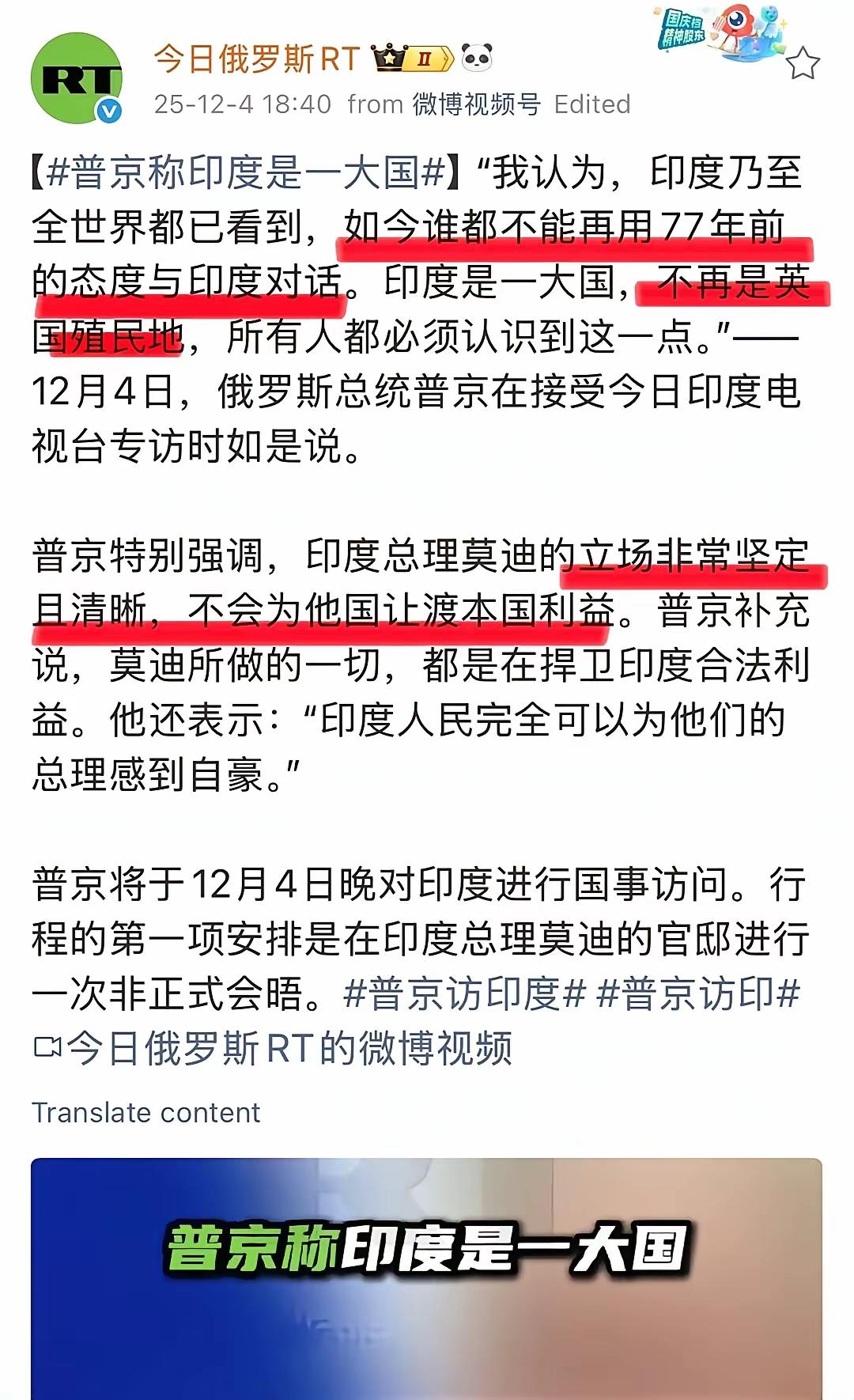 普大帝这招肯定让印度人心里乐开了花。 印度一直自诩大国,并且在他们眼中,他们仅次于美俄的世界第三强。 俄罗斯总统普京在印度访谈节目中表示,印度是一大国,顺便也吹捧了一下莫迪,称印度人应该为他们的总理感到自豪! 经普大帝这么一吹,印度人百分之百相信了,接下来,印度肯定又有惊人的操作,至于什么操作,正常国家和人民肯定想不到!