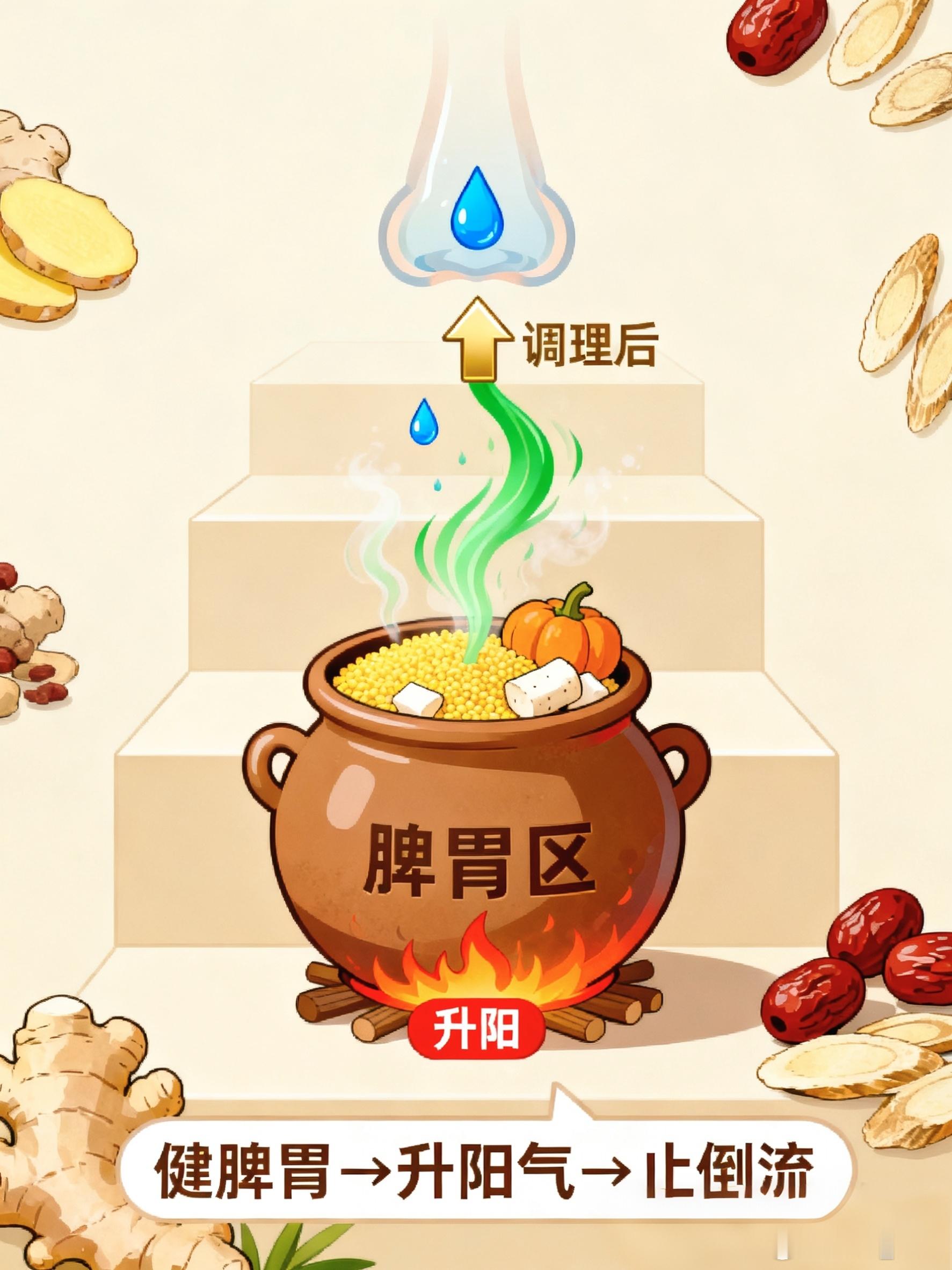 “健脾升阳是解决鼻涕倒流的唯一出路”,核心是中医“治病求本”思维——鼻涕倒流的表象在鼻、肺,根源在脾胃阳虚、痰湿内蕴,唯有健脾升阳能断痰湿源头,而非仅缓解表面症状。核心逻辑(极简懂)1. 鼻涕=中医“痰湿”,脾胃是痰湿生成的根源:脾胃弱则水液代谢失常,无法正常运化水湿,多余水分就会凝结成黏痰(鼻涕),持续涌向鼻窍、倒流咽喉,这是“源头问题”。2. 脾阳是身体“火力”的核心,升阳才能除寒化痰:脾胃阳气不足,身体“火力”不够,寒气就会盘踞鼻窍,导致鼻窍不固、鼻涕不止;健脾升阳能提升脾胃动力,一方面减少痰湿生成,另一方面能带动阳气上行,温通鼻窍、驱散寒气,让痰湿无法堆积。3. 脾肺相表里,健脾才能固肺:中医“脾为肺之母”,脾胃强则肺气足,鼻窍(肺的门户)才能牢固,避免鼻涕、寒气反复侵袭;只治肺(如喷鼻剂、止咳药),相当于“堵洪水不疏源头”,痰湿会持续生成,症状必然反复。结合案例佐证案例中患者“神疲乏力、大便偏溏、怕生冷”,是典型脾胃阳虚;“黏痰难咳、鼻涕倒流”是痰湿内蕴、鼻窍不通。用药核心不是治鼻,而是:- 补中益气汤→健脾升阳(补源头动力)- 二陈汤→清已生成的痰湿(治表象)- 辛夷散→通鼻窍(快速缓解不适)三者结合,既断痰湿来路(健脾升阳),又清现有痰湿、通鼻窍,再配合饮食调理,才能彻底根治,随访半年不复发,印证了“根源调理”的重要性。为何说“唯一出路”(非绝对化,是核心根本)并非否定治肺、通鼻的作用,而是:- 仅治肺(通鼻、止咳):只能暂时清掉现有鼻涕,无法阻止痰湿持续生成,停药必复发(如患者此前用西药的情况);- 仅化痰:只能清痰,不能补脾胃动力,痰湿会不断再生,治标不治本;- 唯有健脾升阳:既能断痰湿生成的根源,又能温通阳气、固护肺窍,从根本上解决“痰湿不断、鼻窍不固”的核心问题,是彻底治愈的关键。健脾升阳·缓解鼻涕倒流 日常实操清单(安全易坚持,适配鼻炎人群)核心原则:不依赖药物,通过「食疗+穴位+习惯」,温和提升脾阳、减少痰湿,辅助巩固调理效果,适配日常居家操作,无门槛。一、食疗调理(核心:温脾、祛湿、升阳,避开痰湿诱因)必吃(日常主打,每天可吃)1. 小米山药粥(首选):小米30g+干山药15g+大米20g,慢熬40分钟,不加糖。山药健脾固胃,小米温养脾阳,是最温和的“脾胃滋养剂”,帮脾胃提升运化能力,减少痰湿生成。2. 生姜红枣水(晨起喝):生姜3片(去皮,避免辛辣刺激鼻窍)+红枣5颗(去核),煮10分钟,温饮。生姜温脾散寒,红枣补气,快速唤醒脾阳,驱散脾胃寒气(寒气是痰湿的“帮凶”)。3. 炒薏米茯苓水(代茶饮):炒薏米10g+茯苓10g,煮20分钟,日常代水喝(不空腹)。炒薏米(比生薏米温和,不寒凉)祛湿不伤脾,茯苓健脾渗湿,帮身体代谢多余水分,减少黏痰。必避(重中之重,比吃什么更关键)- 寒凉类:冰饮、冰淇淋、冰箱刚拿的食物、西瓜、梨(生吃)、苦瓜、冬瓜(生炒),会直接损伤脾阳,加重痰湿。- 黏腻/油腻类:油炸食品、肥肉、甜食(蛋糕、奶茶)、糯米制品(粽子、汤圆),脾胃难运化,会直接催生痰湿,导致鼻涕增多。- 辛辣刺激类:辣椒、花椒、生蒜,避免刺激鼻窍和咽喉,加重反流不适。二、穴位按摩(每天5-10分钟,温脾升阳、通鼻窍)1. 健脾升阳核心穴(重点按,酸胀感为宜)- 足三里(双侧):膝盖下3指,胫骨外侧1指处。用拇指按揉,每侧1分钟,每天2次。健脾益气、升发阳气,是脾胃的“黄金穴位”,提升脾胃动力。- 中脘穴:肚脐上4指(胸骨下端与肚脐连线中点)。用手掌顺时针揉按2分钟,每天1次(饭后1小时),温养脾阳,促进消化,减少痰湿堆积。2. 辅助通鼻窍(缓解鼻涕倒流、鼻塞,配合按)- 迎香穴(双侧):鼻翼外缘中点旁,鼻唇沟里。用食指轻按+揉动,每侧1分钟,每天2次,辛温通窍,快速缓解鼻塞、鼻涕倒流的黏腻感。- 印堂穴:两眉头中间。用食指按压1分钟,每天1次,温通鼻窍,减轻鼻腔寒气,减少鼻涕分泌。三、日常习惯(细节助力,巩固脾阳,避免复发)1. 不熬夜:23点前入睡,熬夜最伤脾阳(脾胃“休息”不好,运化能力会持续下降),熬夜后第二天大概率会感觉鼻涕、黏痰增多,务必规避。2. 适度运动(升阳不耗气):每天15-20分钟,选温和的运动,比如快走、八段锦(第一式“两手托天理三焦”,重点练,升发阳气),避免剧烈运动(耗气伤脾)。运动能带动阳气上行,帮脾胃运化水湿。3. 腹部保暖:不穿露脐装,晚上睡觉盖好腹部,脾胃怕凉,腹部保暖能直接保护脾阳,减少寒气入侵,从源头减少痰湿。4. 饭后不立即躺下:饭后坐15-20分钟再平躺,避免脾胃运化受阻,痰湿上涌至鼻窍,加重鼻涕倒流(尤其晚上,饭后别马上卧床)。四、注意事项1. 食疗和穴位按摩,需坚持1-2个月(和中药调理周期匹配),脾胃调理是“慢功夫”,不可急于求成,坚持才能巩固脾阳,杜绝痰湿复发。2. 若本身有反酸、胃炎,生姜红枣水和炒薏米茯苓水可减量喝(先咨询专业人士),优先以小米山药粥为主。3. 日常可多晒太阳(后背为主),阳光是最天然的“升阳剂”,每天10分钟,帮身体提升阳气,辅助驱散寒气和痰湿。 淄博·广成中医