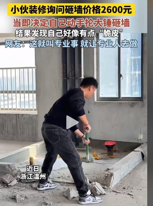 “笑不活了!”浙江,一男子装修房子,嫌砸墙2600元太贵,于是买了把铁锤亲自上阵,没想到抡了2小时大锤,墙没砸多少,还把自己手给扭伤了,后来才发现,人家师傅用的根本不是大锤! “砸个墙2600,咋不去抢呢!”打算装修婚房的小李,看着师傅传给他的报价单,顿时皱起了眉头,说什么也理解不了砸个墙为什么这么贵。盯着客厅里那堵计划要打通的墙,越看越觉得这钱花得冤。 “不就是抡大锤砸吗?这我也能干!”小李随手点开几个砸墙短视频,看着画面里尘土飞扬的场面,越看越觉得简单。他心想这不就是力气活嘛,当即打定主意,这墙非得自己砸出个名堂来。 工欲善其事,必先利其器,小李没去工地用具店,而是直奔五金市场,豪气地买了一把最大最沉的铁锤,掂在手里沉甸甸的,感觉特别踏实。 周末一早,他戴着不知从哪找来的安全帽和口罩,满怀雄心壮志地开工了。他学着视频里的样子,扎好马步,气沉丹田,抡圆了胳膊,将全身力气灌注到锤头,猛地砸向墙面。 “咚!”一声闷响,墙皮簌簌掉下一些,墙上留下一个白点,但反震的力道让他虎口发麻。 此时也顾不得那么多,他开始默默给自己打气,紧接着第二锤、第三锤……时间一分一秒过去,汗珠从他额头滚落,背心也湿透了。 不知不觉,两个小时过去了,理想中墙体应声而倒的场面并没有出现,那堵墙只是顽固地露出里面的红砖,进度慢得可怜。但小李已经累得气喘如牛,胳膊酸得抬不起来,更糟的是,在一次特别用力的挥击后,他感到右手腕传来一阵尖锐的刺痛。 虽然手痛的止不住抖,但小李还是没太在意,以为只是用力过猛,歇歇就好。他咬牙坚持到中午,直到吃饭时,才发现自己连筷子都握不稳了。右手腕又红又肿,稍微一动就疼得直冒冷汗。在家人催促下,他才不情不愿地去了医院。 经过X光检查,手腕好在没有骨折,只是简单的扭伤。从诊所出来,他越想越不对劲,忍不住给一个懂装修的朋友打了个电话诉苦。 “我的哥,你这电视剧看多了吧!现在谁还用蛮力抡大锤砸整墙啊?人家专业的都是用电锤的。”朋友说完,在电话那头都笑得直不起腰。 小李用他的失败经历告诉我们,该花的钱得花,该让专业人做的活儿得让专业人来做。自己动手的乐趣和节省值得鼓励,但前提是正确评估事情的复杂度和自身的真实能力。否则,就不是勤俭持家,而是费时费力还赔本的“自我折腾”了。 信源:滨海新闻《小伙装修询问砸墙价格2600元 当即决定自己砸》 文|晓晖 编辑|南风意史