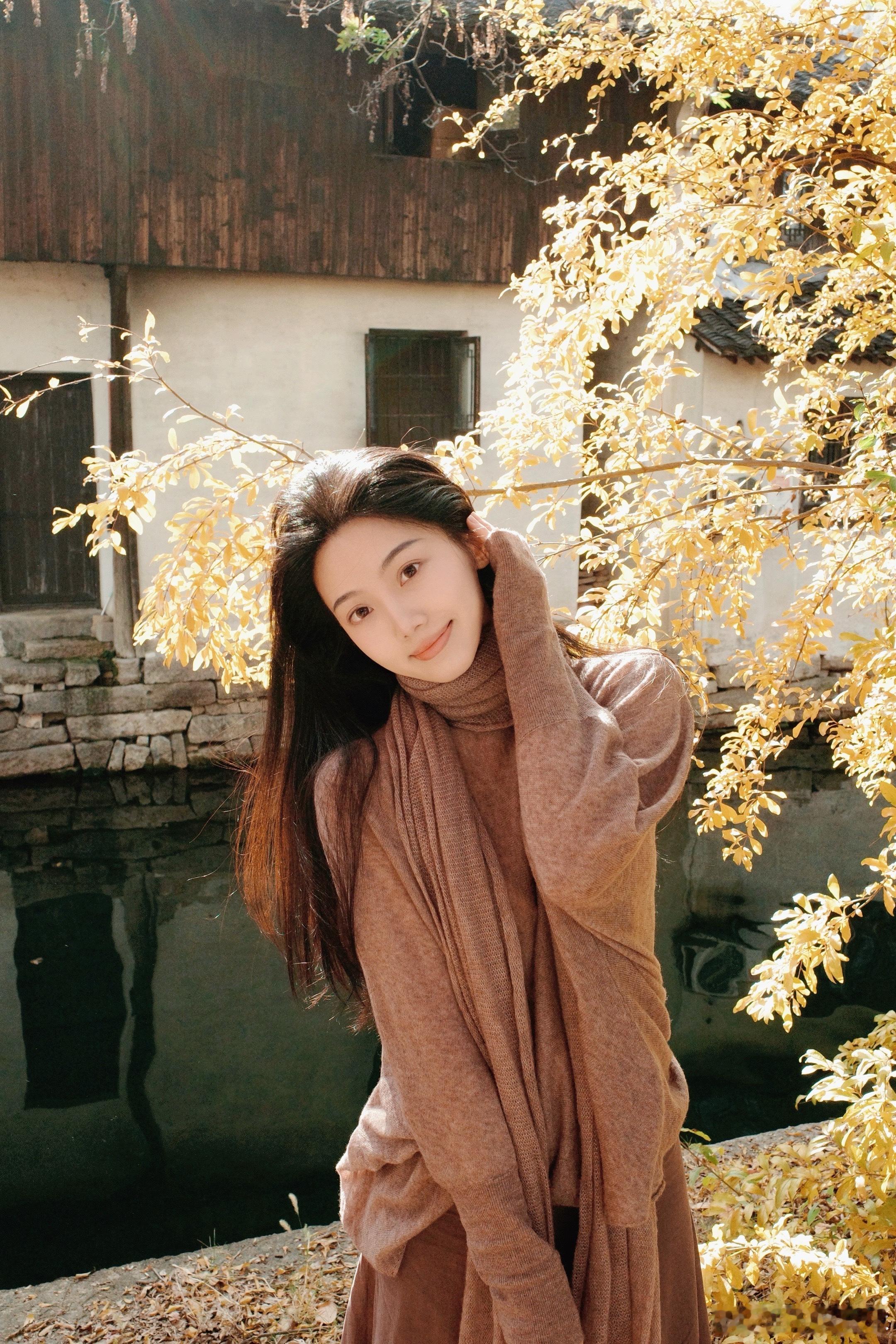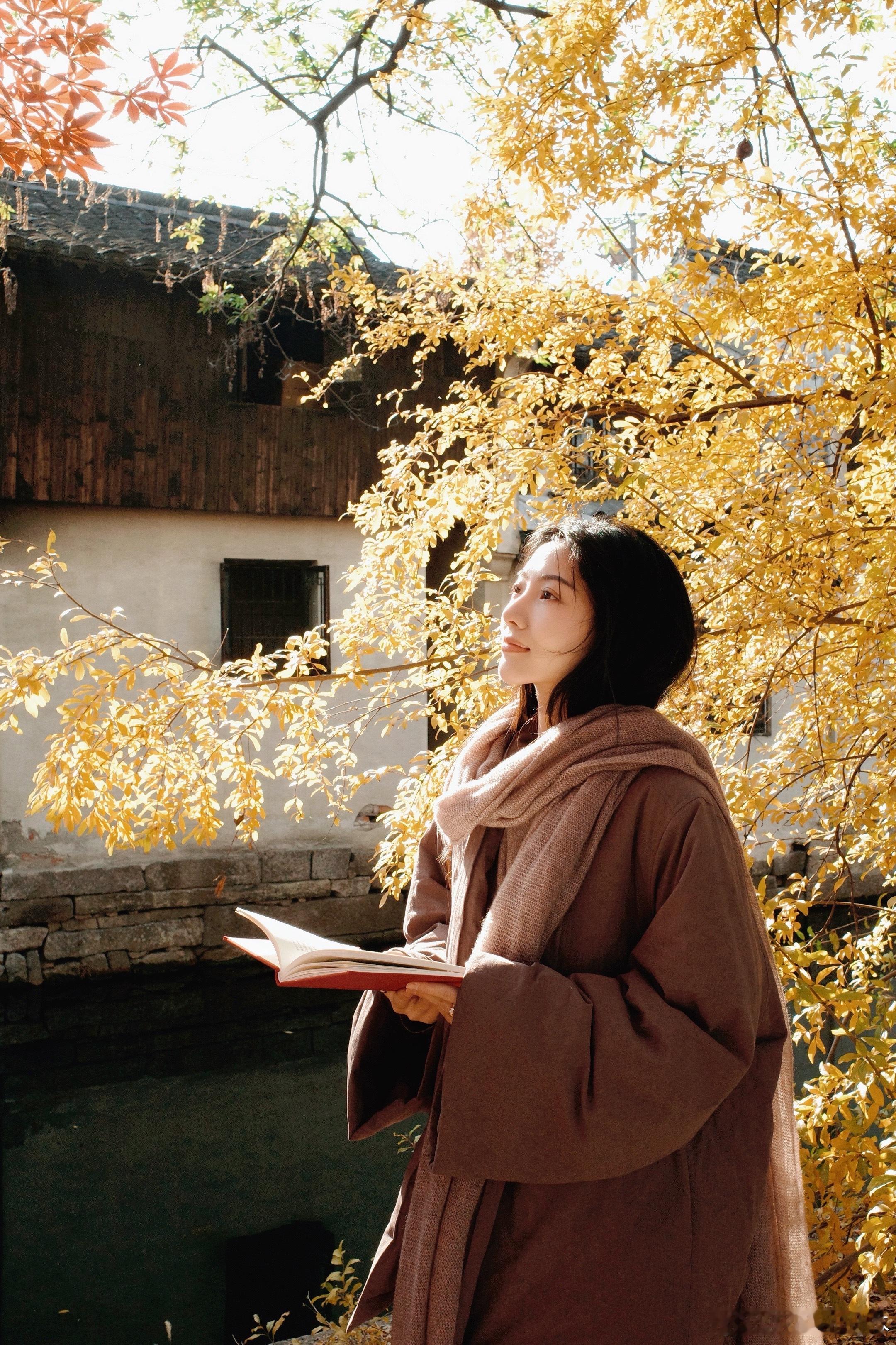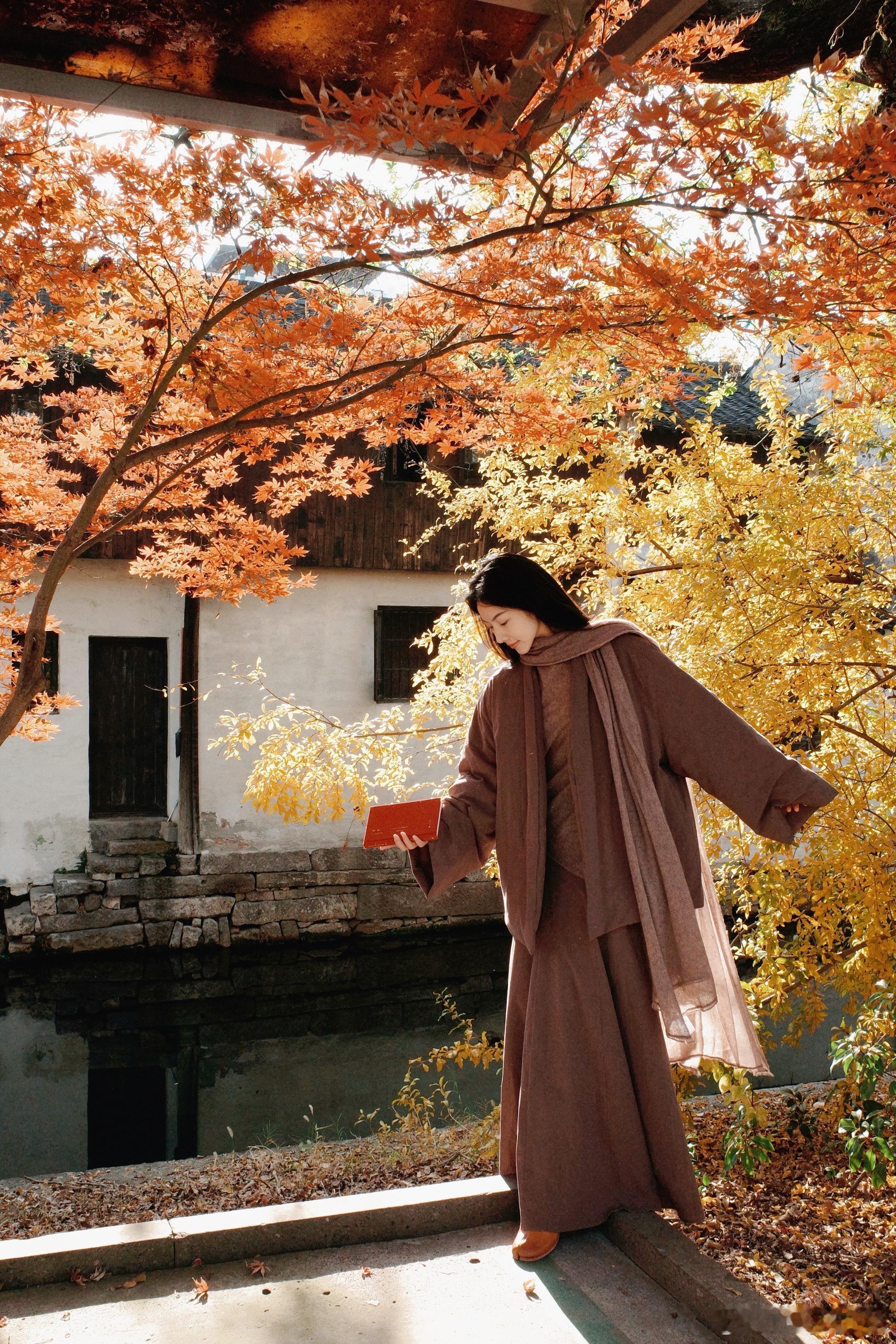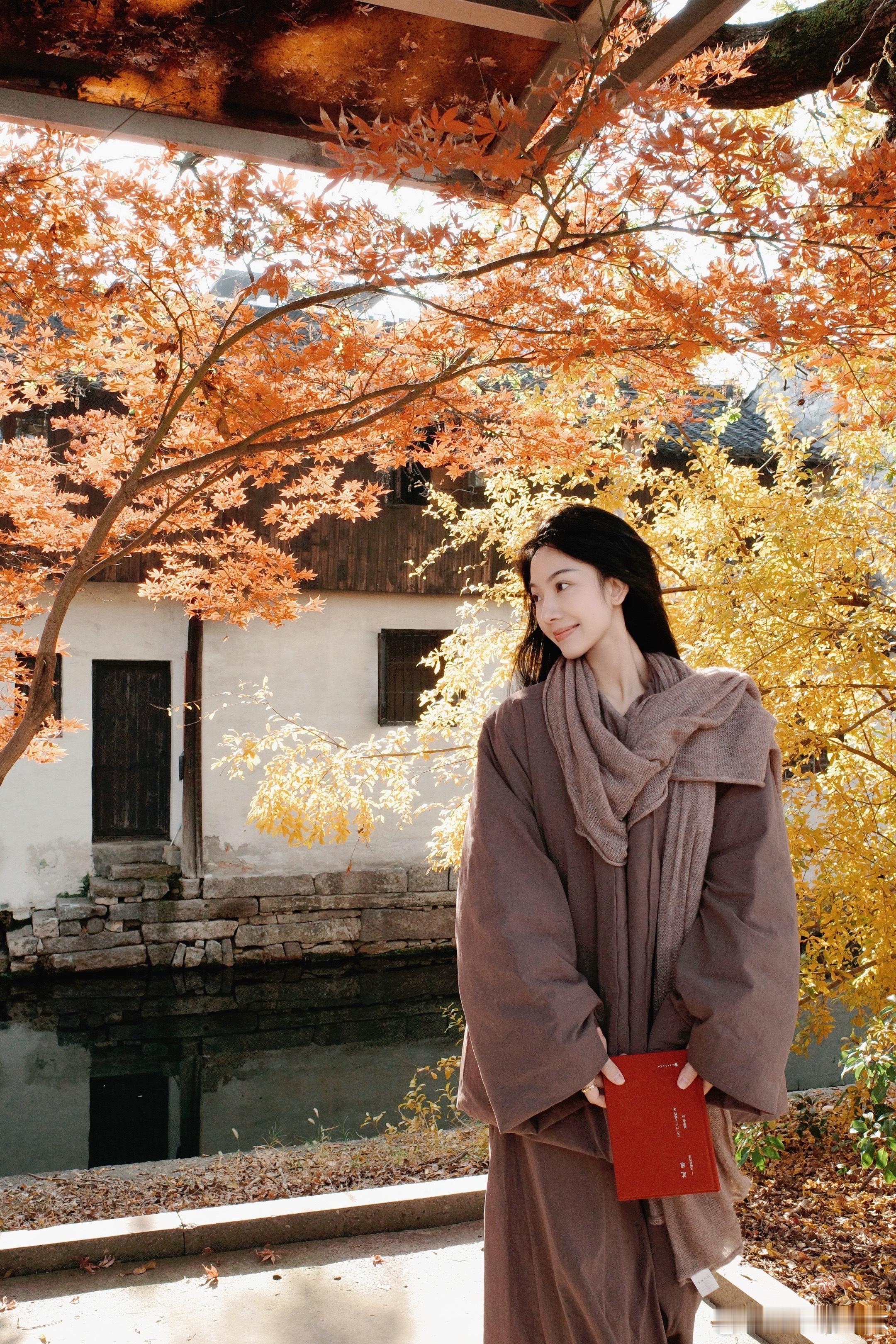 秋光绯色风卷着桂香漫过公园长椅,她一身暖红撞进秋的柔黄里。不是灼眼的