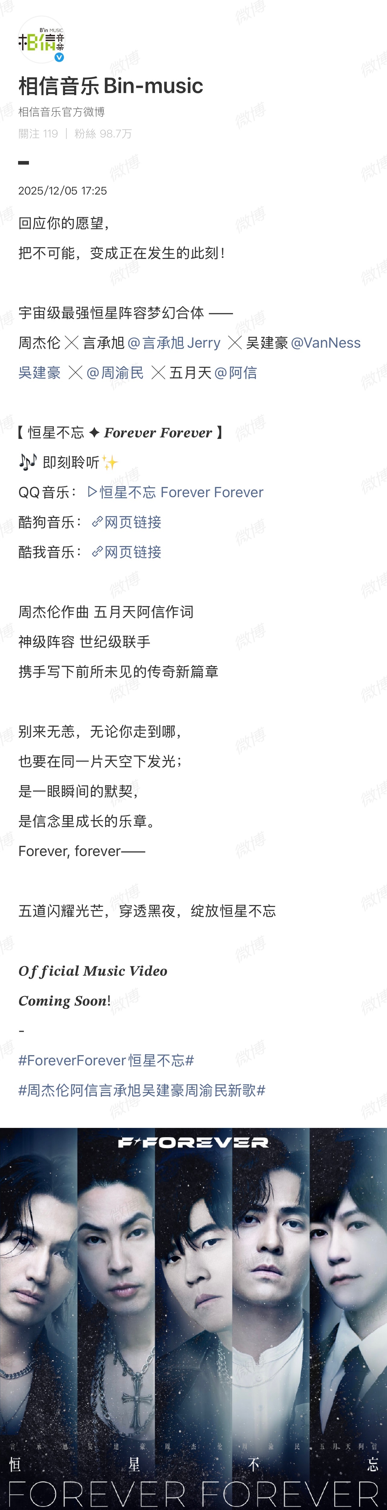 周杰伦阿信言承旭吴建豪周渝民新歌恒星不忘五大男神合体!!!一整个大震惊🤯,“有生之年系列”的终极期待,周杰伦&言承旭&吴建豪&周渝民&五月天阿信,天王+天团+三位时代偶像,不知道把多少人的“青春拼图”拼完整了,今天发布的数字单曲《恒星不忘Forever Forever》我更是直呼好家伙!好听爱听请在F✦FOREVER上海演唱会继续产出LIVE版!