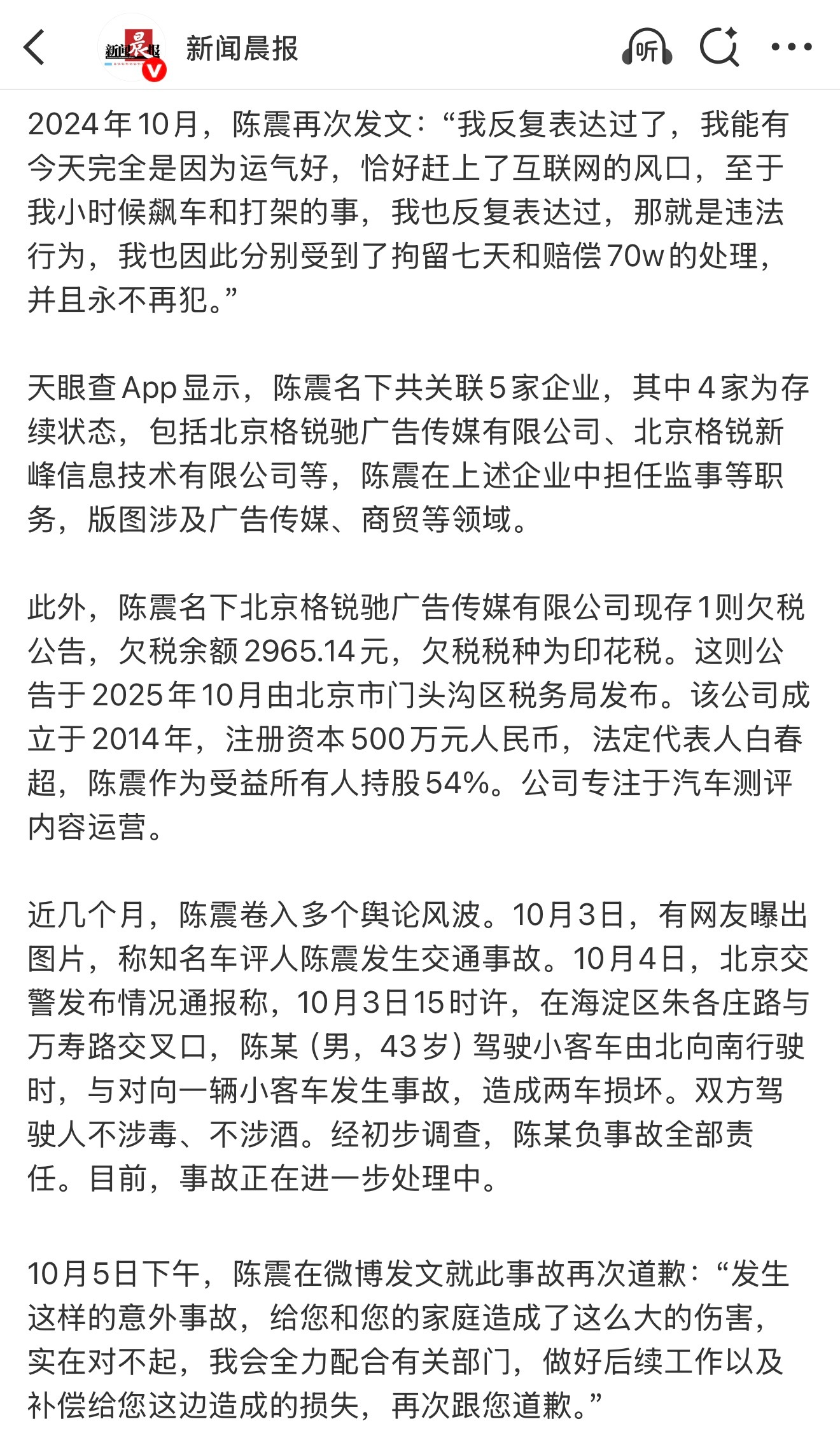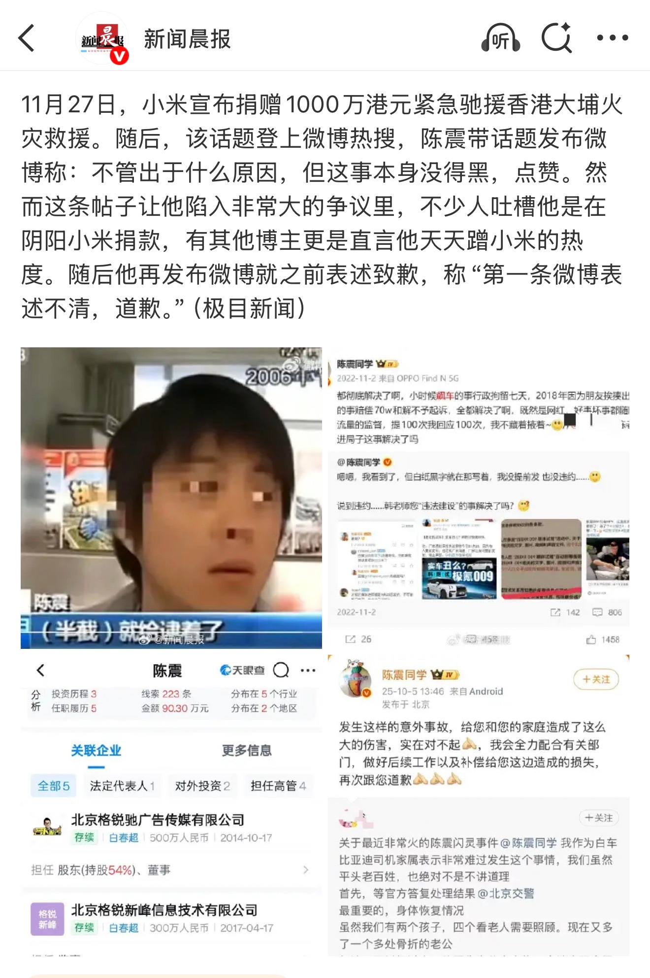 新闻晨报扒了一堆陈震的黑历史,好多我也不知道。飙车、打架、开车玩儿手机、逆行,还挺多次违反保密协议。不管出于什么目的,这些在偷税漏税面前不值一提了。公众人物,又是车圈大 V,还是应该严于律己的。起底陈震陈震曾因飙车被行政拘留7天