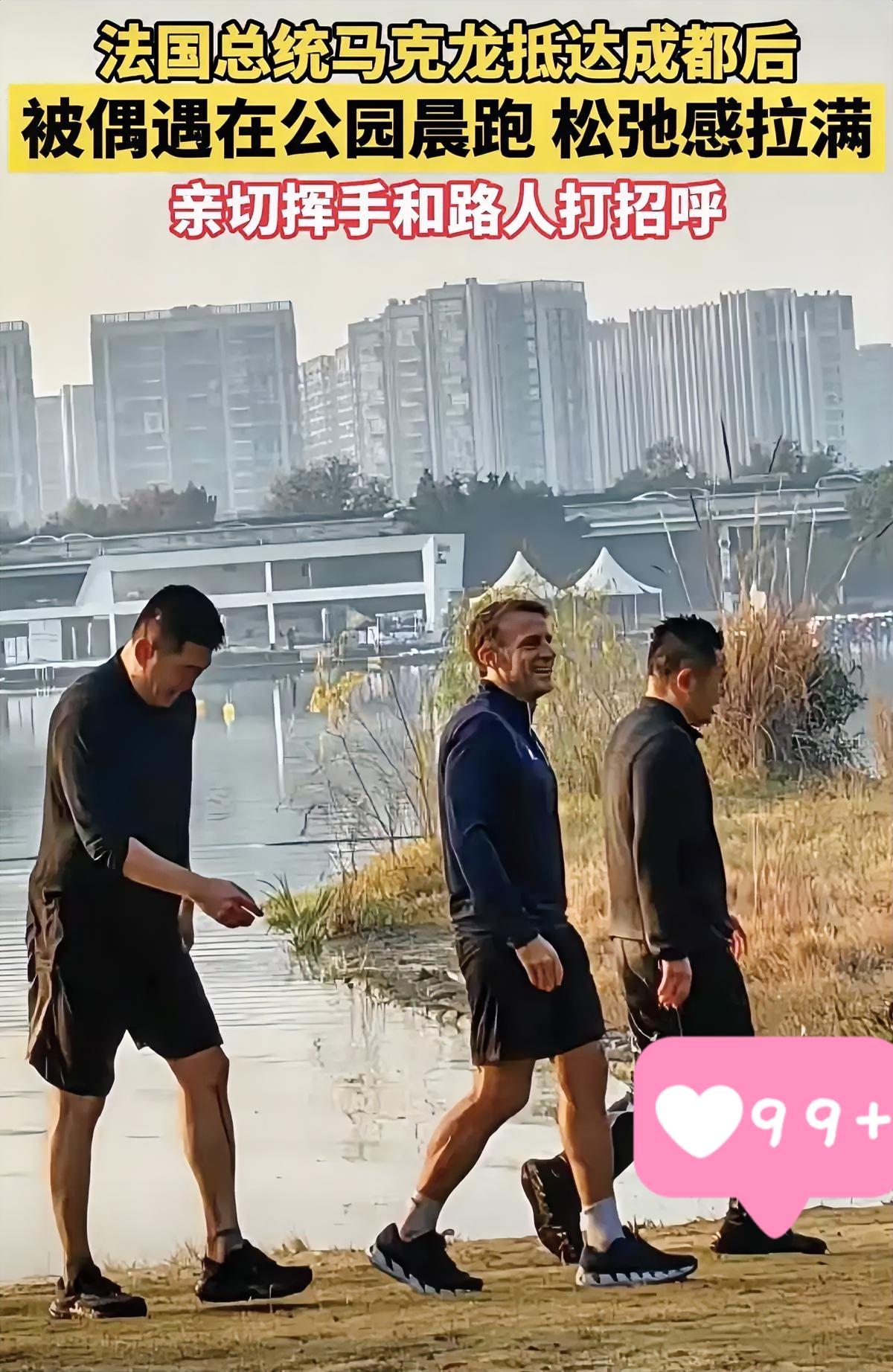 马克龙成都之行彻底“放飞”, 晨跑击掌大爷、冬泳秀肌肉, 这波操作太圈粉! 谁能想到一国总统访华,直接在成都公园开启“市民模式”? 清晨7点锦城湖晨跑,用中文喊“你好”,和健身大爷击掌、陪学生自拍,保镖团还跳进10℃湖水冬泳,这接地气的画面直接刷屏! 熊猫基地撸“圆梦”、火锅配红酒解锁混搭吃法,逛杜甫草堂、看都江堰,马克龙全程笑容就没停过。 网友调侃“这哪是访问,分明是沉浸式打卡成都”! 你觉得马克龙是不是被成都彻底圈粉?如果他再来,该带他体验川剧变脸还是采耳?来评论区聊聊~