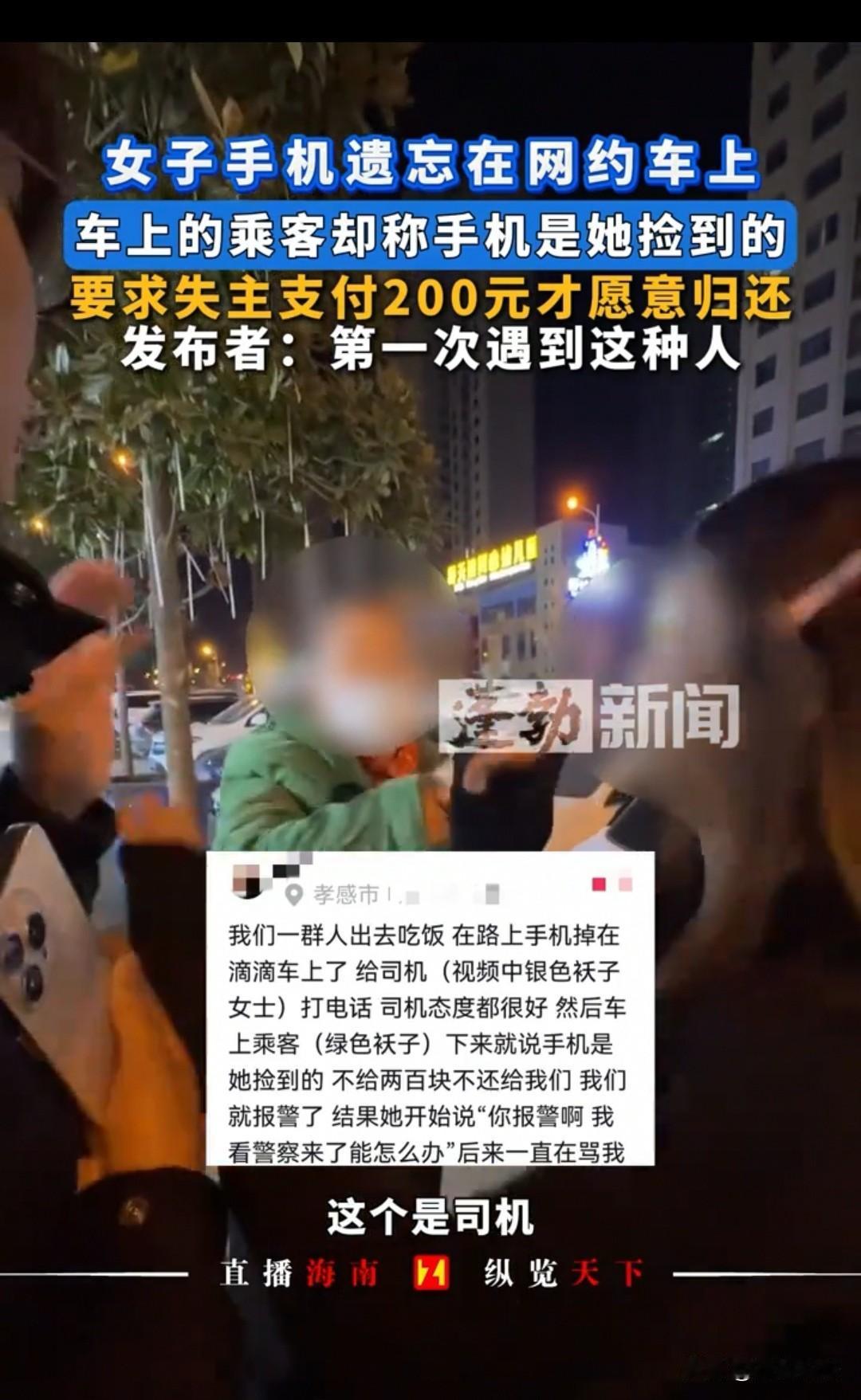 湖北孝感,女子的手机掉在了滴滴车上,车上的大妈称是自己捡到了手机,要求女子给200元才愿意归还。女子则表示,你只是乘客,手机是我掉在车上的,司机都没有说要钱,你凭什么要让我花钱来赎回?最后,双方僵持不下,大妈还说,你们以多欺少,有本事就打我呀,反正就是拿着手机不肯归还。 女子当天是和朋友约好一起去吃饭,地点比较远,所以他们提前预约了滴滴车。 坐上车后,几人想着要去的美食店,心情格外开心,你一言我一语说个不停。 到了目的地,女子为了方便下车,把手机揣进了衣兜,谁知手机揣得比较浅,下车时从衣兜里滑了出来,掉在了车上。 最开始女子没发现手机丢失,走了一段路后,习惯性去拿手机才发现不见了。她赶紧用朋友的手机联系司机,此时司机已经接到了车上的大妈,便询问大妈,您看到车上有手机吗? 其实大妈一上车就看到了手机,当时悄悄把手机揣进了自己衣兜,没想到女子的电话来得这么快——自己还没下车,对方就找来了。她只能把手机亮给司机看,问,是不是这一部? 司机连忙说,您把手机给我吧,失主再问,我得给人家送过去。 大妈却不肯给,称这是自己捡到的手机,到时候对方给报酬也该给我,不是给你。 司机见状有些无奈,这位大妈显然不讲道理,但他没和大妈争执,直接联系女子,约好了见面地址。司机心想,先把大妈载到目的地,再看怎么处理,现在不能让大妈下车,万一她把手机带走就麻烦了。 到了约定地点,司机说明情况后,大妈毫不客气地说,手机是我捡到的,你们得给我200元,不然我不会给你们。 女子有些生气,司机都没开口要钱,你凭什么要200?你只是车上的乘客,我的手机掉在车上,就算捡到也该是司机捡到,怎么轮到你拿我的手机? 大妈反驳,称自己坐在后排,上车就看到了手机,自然是自己捡到的,怎么成司机捡到的了? 同行的朋友也加入争辩,你只是车上的大妈,这是女子掉在车上的物品,你拿走就属于侵占了——车上的遗失物本就该由司机保管,什么时候成你的了? 大妈觉得对方人多、以多欺少,又见他们不肯给钱,情绪有些失控,你们有本事就打我呀,今天我就是不给手机。 司机也帮女子说情,人家小姑娘工资不高,年轻人买手机也不便宜,您干嘛捏着手机不放呢?这手机不是您的,拿着能心安吗?您要200元的理由是什么?难不成坐上车看到旁边的手机,拿在手里就是自己的了,还能向别人要钱? 大妈见所有人都针对自己,又听说对方要报警,担心民警会判定自己没理,还可能留下不好的记录,这才心不甘情不愿地把手机还给了女子。 女子将事情的前因后果拍成视频发布出来,避免大妈回去恶人先告状。她表示,就算要给钱,我也是给司机,不会给这位车上的大妈——这种人不能惯着。 一、女子的手机掉在了滴滴车上,司机作为车内遗失物的临时保管人,有义务协助大妈将手机返还给女子。 《民法典》第三百一十六条:拾得人在遗失物送交有关部门前,有关部门在遗失物被领取前,应当妥善保管遗失物。因故意或者重大过失致使遗失物毁损、灭失的,应当承担民事责任。 网约车司机对车内遗失物负有法定保管义务,需主动协助核实、促成返还。本案中司机控制现场、联系失主、约定见面地址,已尽到合理义务;若司机未尽责导致物品丢失,需承担民事赔偿。 二、手机不是谁捡到就是谁的,拾得人必须物归原主,也可以适当向对方索要因保管、返还手机产生的必要费用(如合理交通费、误工费)。 《民法典》第三百一十七条第一款:权利人领取遗失物时,应当向拾得人或者有关部门支付保管遗失物等支出的必要费用。 拾得遗失物返还权利人是法定义务,不得私自占有或索要无依据报酬。本案中大妈未产生任何必要支出却索要200元,不符合法律规定;其拒不返还的行为还可能构成不当得利,需承担返还责任。 对于此事,大家如何看待?素材来源于蓬勃新闻,2025年12月5日