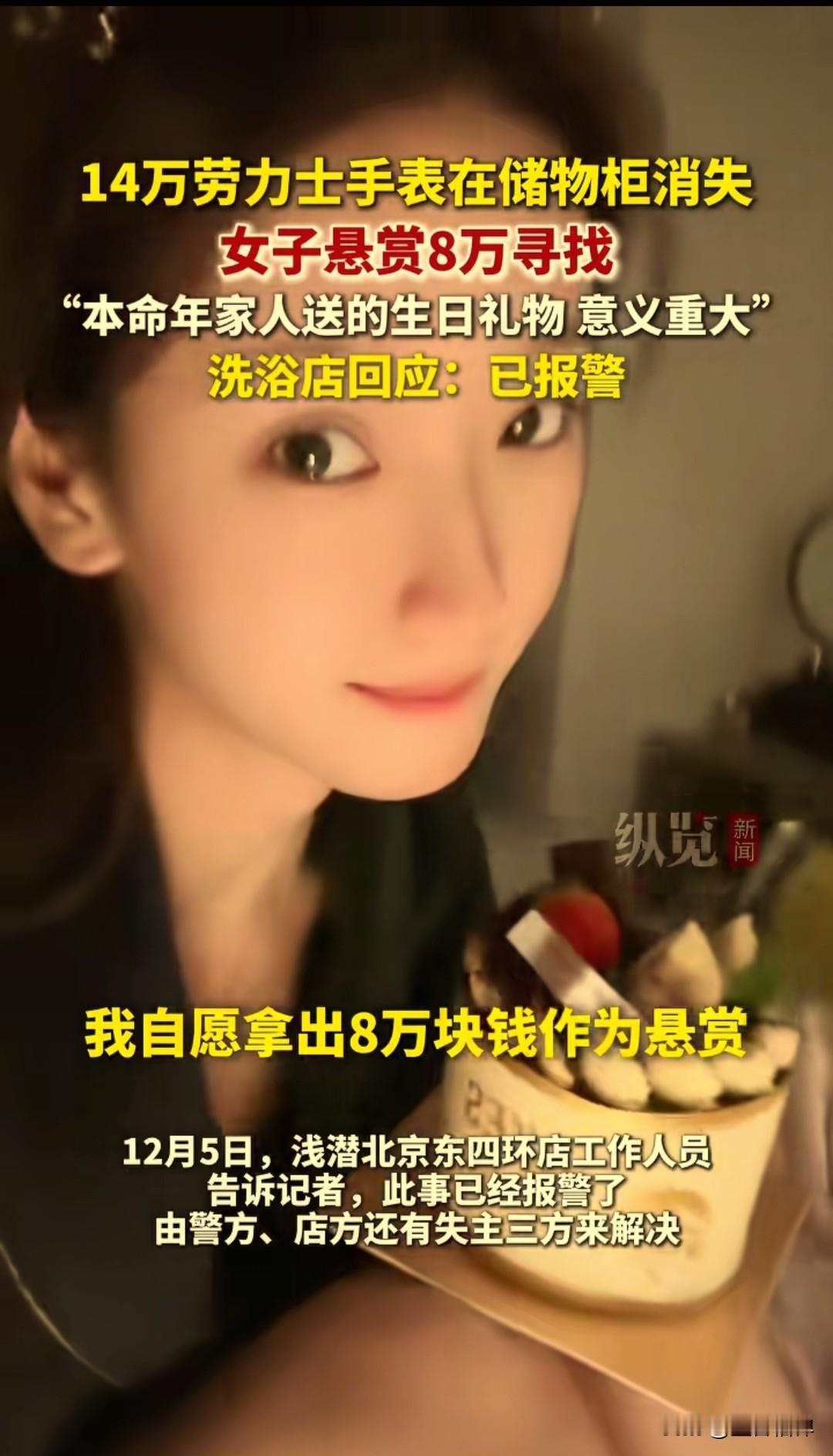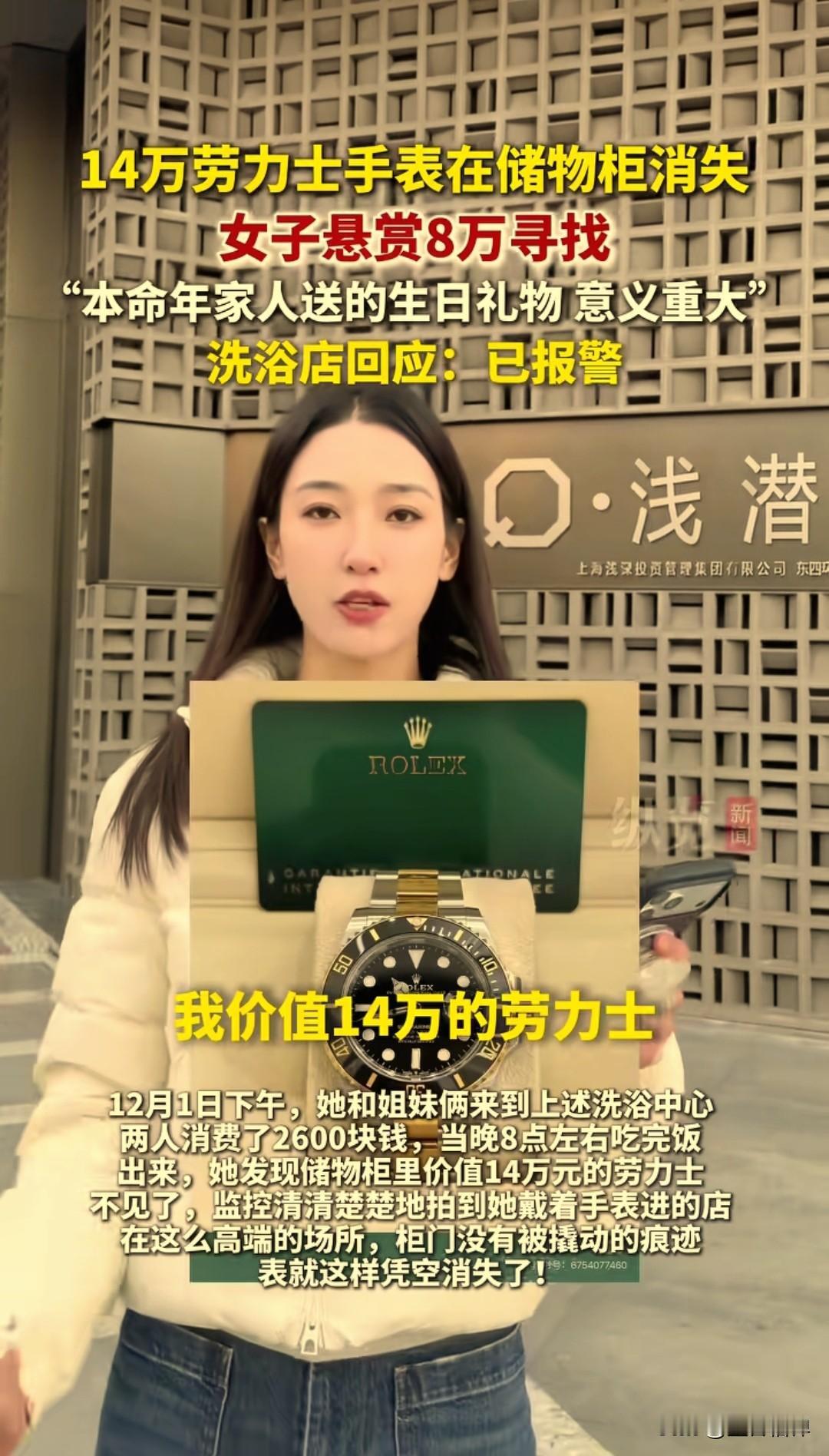 一名女子在北京旅游期间,去了一家洗浴中心消费,在搓澡时眼睛被蒙住,手牌被服务员拿走,事后发现她存放在储物柜中的价值14万元的劳力士手表不翼而飞,但柜门完好无损。 12月4日,女子发视频说她一块价值14万的劳力士手表,在一家洗浴中心不翼而飞,谁能够提供线索并能够帮她把手表找回来,她愿拿出8万块钱作为悬赏,如主动归还的话也不会追究他的法律责任。 12月1日下午三点左右,她和姐妹两去了这家洗浴中心,两人消费了2600块钱,当晚8点左右吃完饭出来,她发现手表不见了,柜门也没有撬动的痕迹,表就无缘无故的消失了。 她说在搓澡的时候,当时眼睛被服务员用眼罩蒙住,用来开储物柜的手牌被服务员取走,手牌也没在她的视线范围之内,怀疑这时候有人拿着手牌去偷了手表。 女子说她已经报了警,拿到了立案通知书,北京市公安局朝阳分局八里庄派出所证实已接到警情,目前警方、店方与失主三方正在处理中,洗浴中心工作人员说,他们也就此事做了报警处理。