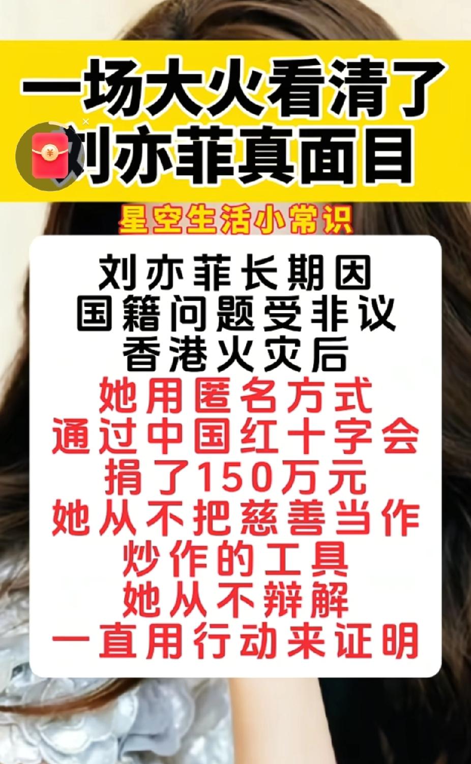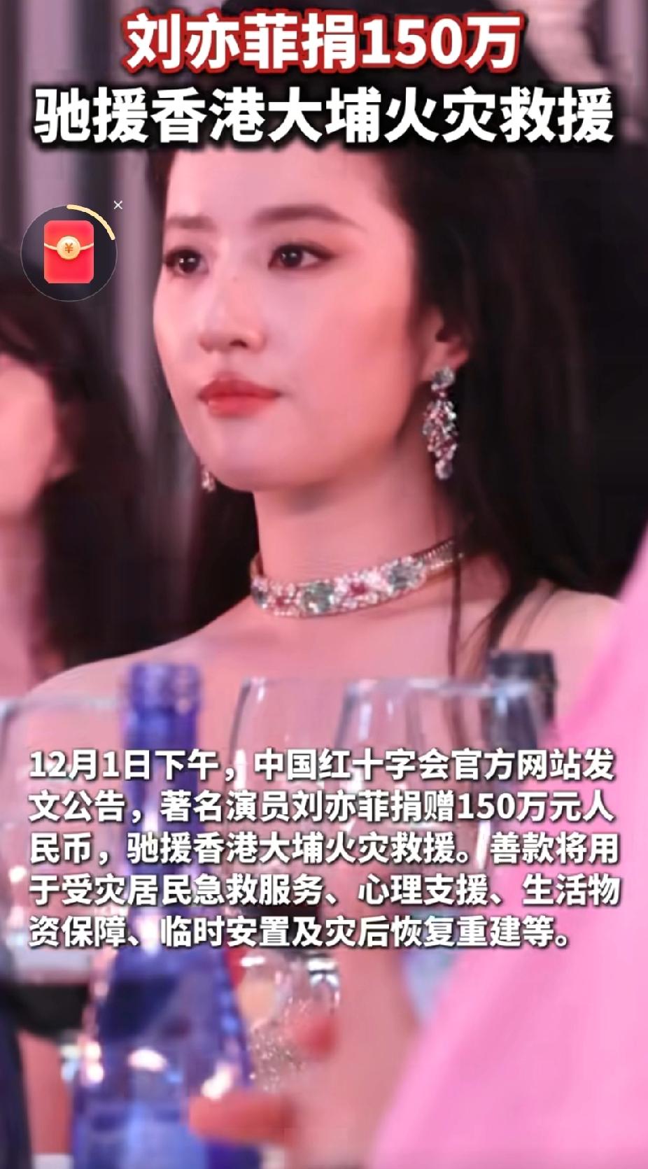香港这场突发的大火, 简直像一面镜子,照出了世间的各种人情冷暖。38岁的刘亦菲这次又悄悄捐了150万,用实际行动再一次让大家看到她骨子里的那份善良。在这场突如其来的灾难面前,有人选择悄悄做好事不留名,也有人却借着机会高调表演,看了真让人有点不是滋味。 大火发生后,像周深、成毅这些明星,也都是默默捐了款,连自己的名字都没留下。相比之下,刘亦菲这次更是用实实在在的行动,把那些传了好多年的谣言彻底给澄清了。从之前的汶川地震到这次香港的大火,她一直都是这样默默做好事,从来不会把自己做的事挂在嘴边。 赵立坚之前就评价过刘亦菲是“真正的中华儿女”,现在再看,这话真是一点不假。在现在这个到处都是“表演型”捐款的娱乐圈里,还能一直守着自己初心的人,真的不多见了。这场大火啊,不光是在考验大家的良心,更让我们看清楚了,到底谁才是真的有责任有担当的人。 天灾无情,但人心是暖的,可做好事真不该变成“秀场”啊。你们觉得明星捐款,到底应不应该公开呢?低调默默做好事和高调出来表演,这两种,你们更想给哪种点赞?