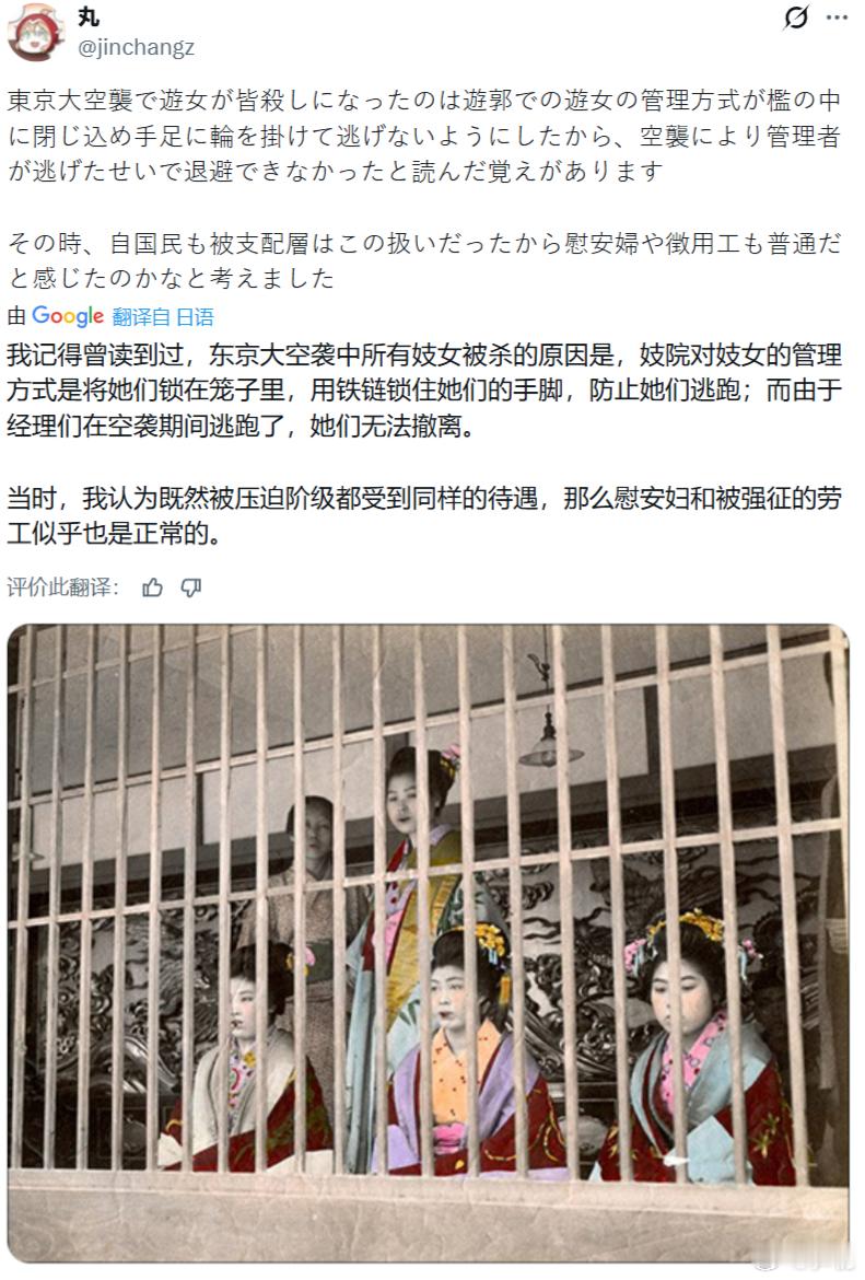 你可能不知道的历史 为什么在美国对日本进行的东京大轰炸中,日本妓女的死亡率是最高的?因为当时日本妓院对妓女的管理方式是将她们锁在笼子里或者铁栅栏封闭的房间,用铁链锁住她们的手脚,防止她们逃跑;而由于妓院管理人员在空袭期间都逃跑了,她们只能等死。 全网热点共创计划