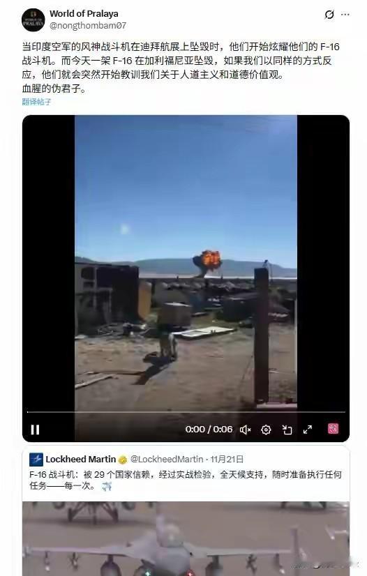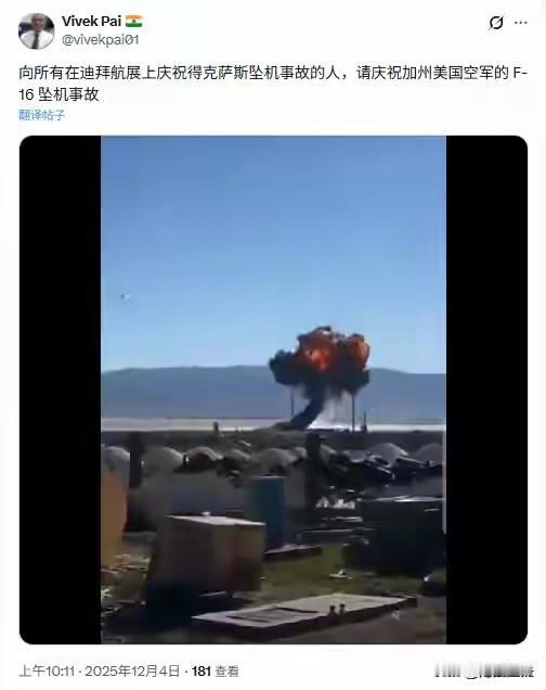 美国战机坠毁,印度网友高度兴奋! 当地时间2025年12月3日,美国空军雷鸟飞行表演队的一架F - 16C战斗机在加州坠毁。从画面看,飞机落地后爆炸成残骸,呈扇形分布,飞行员成功弹射且仅受轻伤。 美国空军自1992年就用F - 16C,现在还有600多架在服役,对他们来说摔机只要人没事就不算大事。 但这事儿在印度网上可炸锅了。此前迪拜航展LCA“光辉”出事故,外网冷嘲热讽。 如今F - 16坠毁,印度网友纷纷翻旧账,辛辣评论“你们那叫正常损失,我们那就被判不合格?”还说美国人双标,倒霉时讲技术,自己摔机讲人道。 只能说,这一摔让印度网友狠狠出了口恶气。