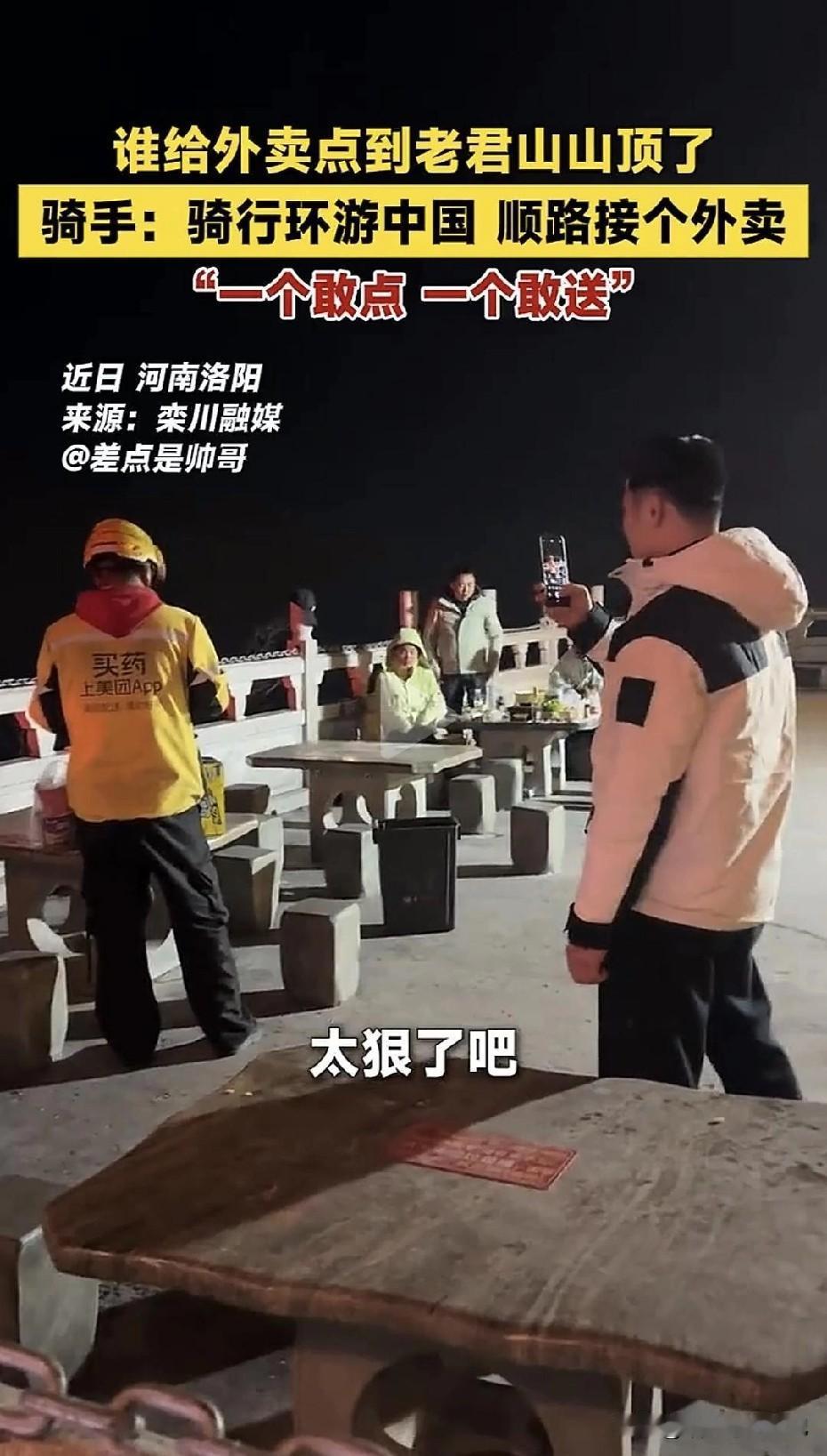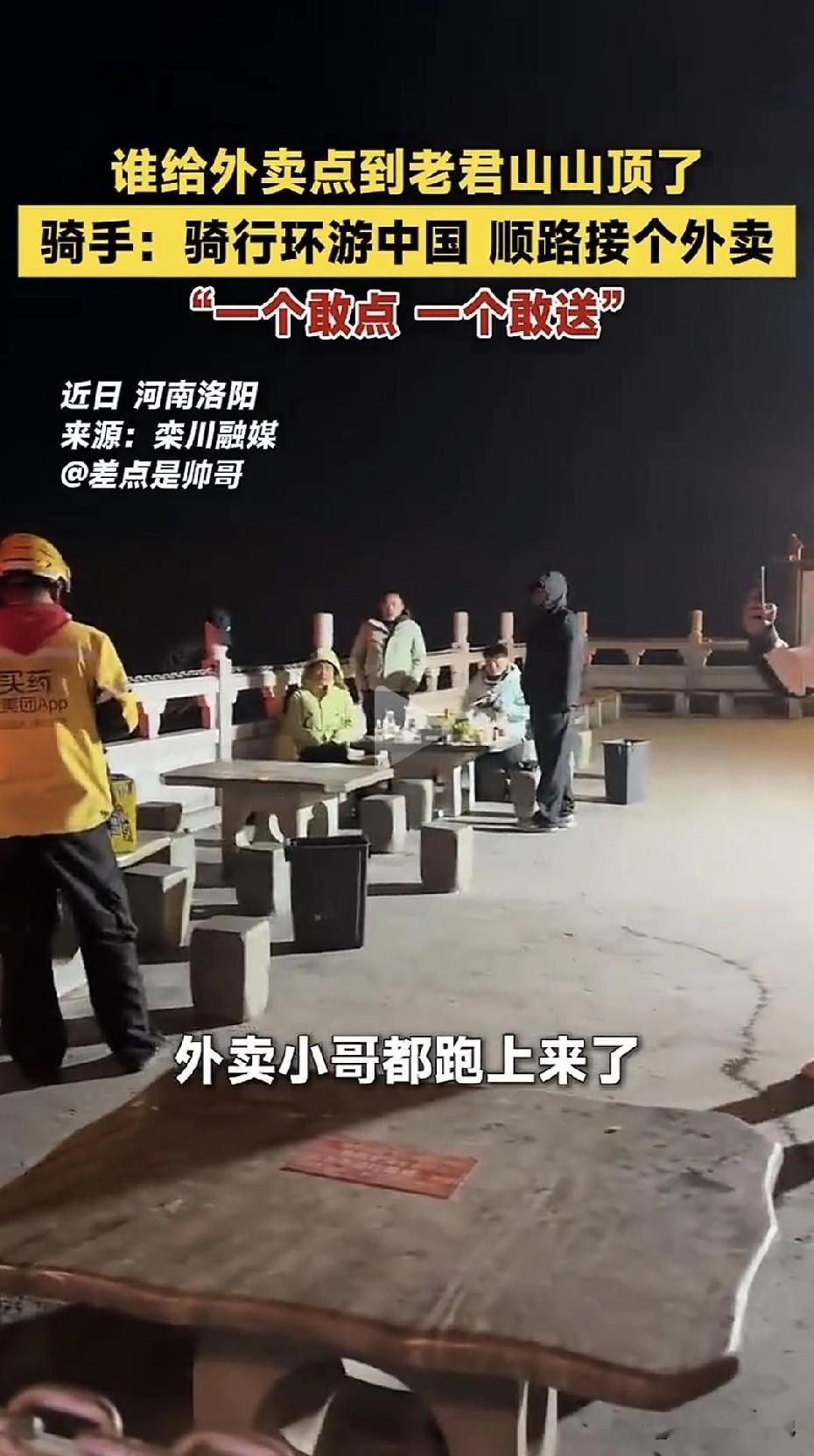 我的妈呀,谁把外卖点到老君山山顶?真·狠人遇上真·狠人。今天刷到一个视频,手上的手机差点掉今晚的外卖里。有游客在老君山金顶,海拔2200米,点了份外卖!系统是真派给了一位外卖小哥,配送费整整300块! 小哥本来在洛阳城区遛弯,一看“300米”距离,秒抢单,结果导航一展开:直线距离是“米”,垂直距离是“千米”…… 得,门票100先贴上,再吭哧吭哧爬了40分钟,嘴都累白了,终于登顶。 终于登顶,却发现: 客人!不!见!了! 订单显示“已送达”,(客户还买了准时达)山顶只剩呼呼北风和小哥怀疑人生的背影。后来,小哥一脸落寞把外卖原路拎回商家,边走边嘟囔着:“人家是生活,我是活着。” 我是一边心疼小哥,一边给这位“山顶吃货”鼓掌:他把“世界那么大,我想点点看”玩出了新高度;让全国网友知道了老君山不仅能看云海,还能“云点餐”;再次证明,只要佣金到位,没有外卖小哥到不了的远方! 不过笑归笑咱也留个思考: 当无人机能在景区空投物资时,我们为什么仍愿意为人力买单? 今天山顶外卖事件,看似滑稽,却像一场“随堂测试”:科技可以送饭上山,却送不来挑山工扁担上的故事,也送不来小哥汗水里的江湖。 下次去老君山,如果咱碰到气喘吁吁的外卖员,或者鬓角花白的挑山工,别光顾着拍照,递瓶水、让个道,就是最好的“五星好评”。 [图源网络]