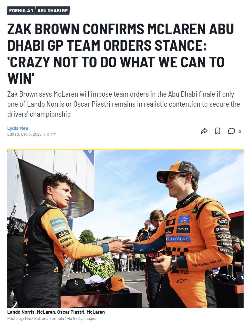 迈凯伦车队CEO扎克·布朗已确认,如果赛季收官战出现只有一位迈凯伦车手有机会夺冠的局面,车队将考虑实施车队指令。扎克·布朗面对Sky采访时表示,若正赛中仅剩一位车手保有争冠希望,他们若不采取行动那才真是疯了。当被问及如果皮亚斯特里不在竞争行列,车队是否会要求他为诺里斯让车时,扎克·布朗说:“是的,当然,我们很现实。我们想要赢得车手总冠军。我们是以两者机会均等的心态进入这个比赛周末的,尽管目前积分差距明显。”“你不知道排位赛会如何发展,可靠性也存在变数,但如果我们在正赛中发现其中一位车手有机会而另一位没有,我们会竭尽全力争取车手总冠军。不争取那才是疯了。”“我们想赢得车手冠军。所以,我们会看看比赛如何进展,但不会因为试图保住第三和第四或者第六和第七这样的位置而错失夺冠机会,无论最终局面如何发展。”“这是一项团队运动,对吧?因此,我们以团队之力争取赢得制造商(冠军),也正在以团队之力争取赢得车手总冠军。”“我知道这听起来可能有点奇怪,但如果其中一位车手无法夺冠,他们会希望另一位夺冠。这也是车队的目标。他们都是具有团队精神的选手,去年我们已经见证过这一点,对吧?”“你在巴西冲刺赛和卡塔尔站都看到了这种情况。所以我认为在任何体育项目中,队友之间为达成车队目标而相互做出牺牲都不足为奇。”F12025F1阿布扎比大奖赛