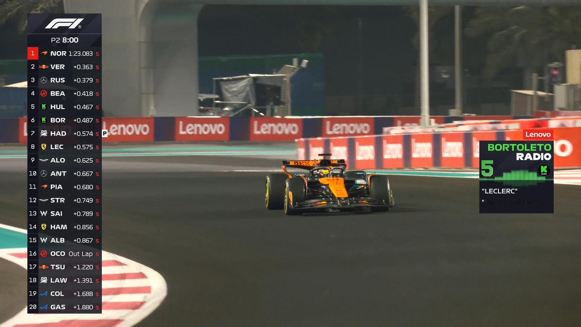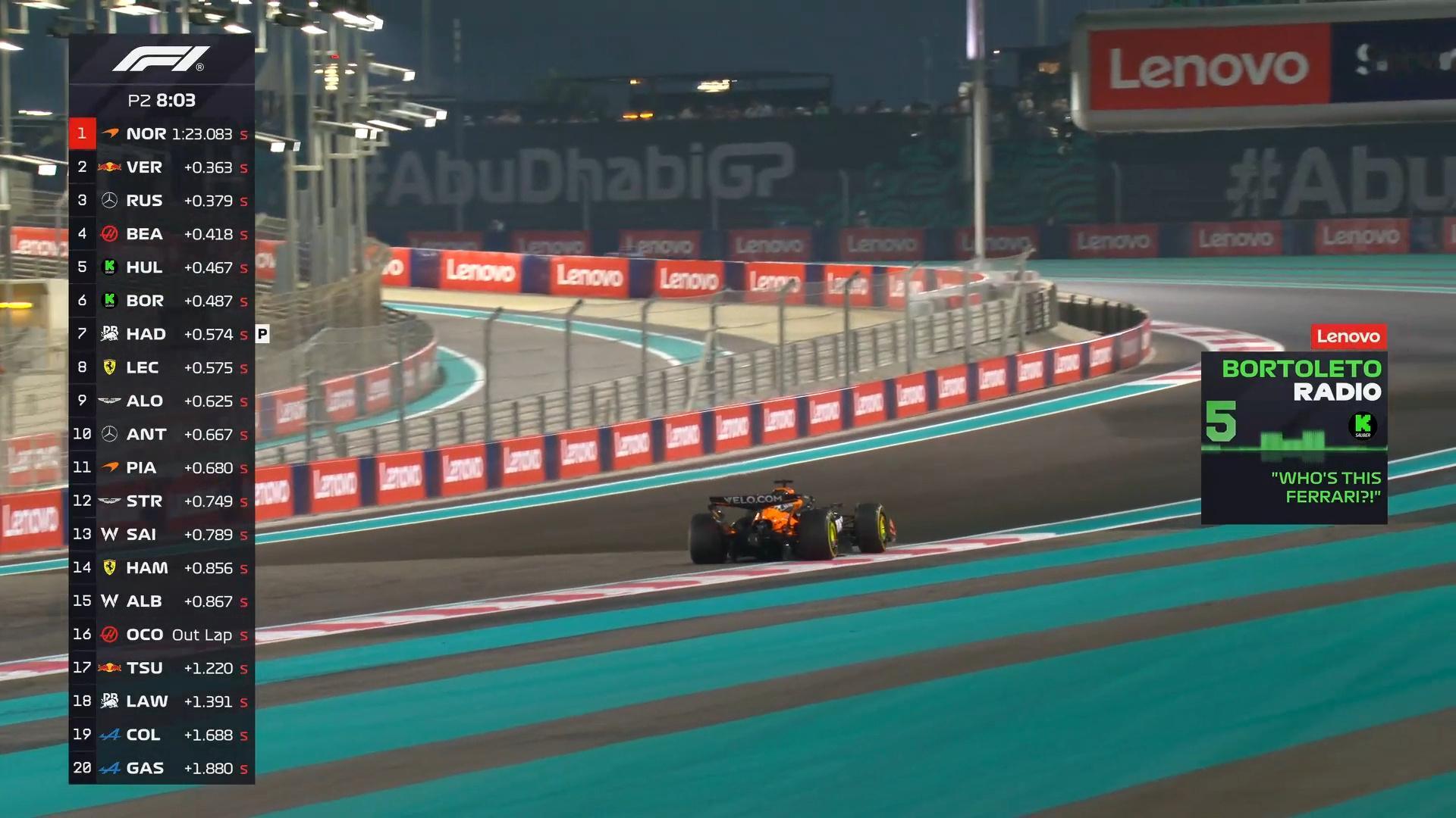 博托莱托:那台法拉利里的是谁?!比赛工程师:勒克莱尔,大的那个。今天早些时候,夏尔·勒克莱尔的弟弟——阿蒂尔·勒克莱尔曾参加了一练。F12025F1阿布扎比大奖赛
