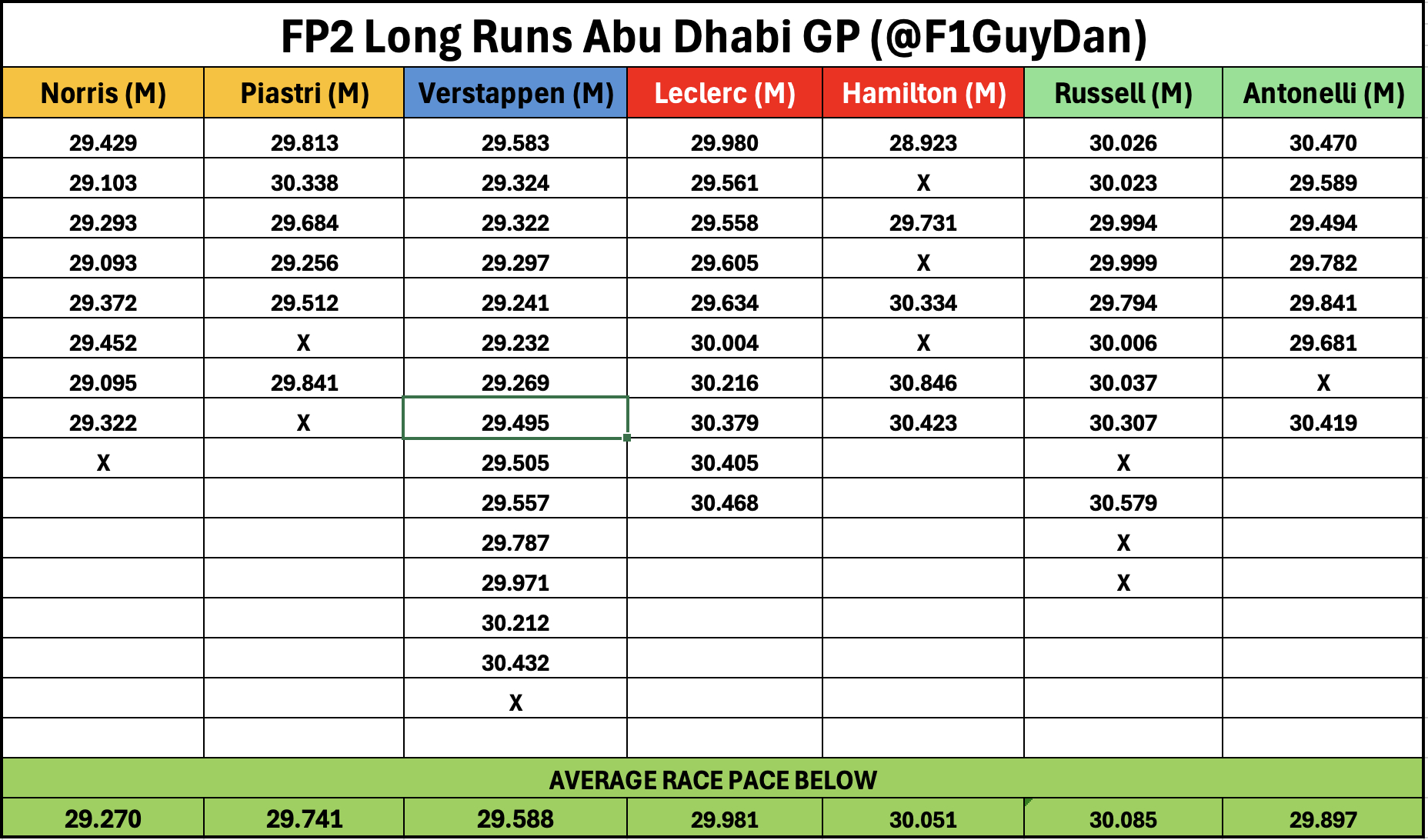 阿布扎比大奖赛FP2长距离平均节奏(via Daniel Valente)2025F1阿布扎比大奖赛