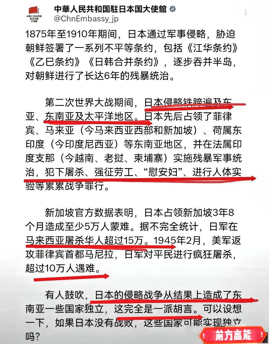 这个招式好! 中国驻日本大使馆今天(12月5日)发文写道:“1875年至1910年期间,日本通过军事侵略,胁迫朝鲜签署了一系列不平等条约,包括《江华条约》、《乙巳条约》、《日韩合并条约》,逐步吞并半岛,对鲜进行了长达6年的残暴统治。 1875年这个关键节点,把朝鲜半岛到东南亚9国的受害史扒得明明白白,新加坡5万冤魂、马来西亚15万遇难华人,每笔血债都历历在目。更绝的是戳穿“侵略促独立”的鬼话——没战败哪来的独立?纯属颠倒黑白! 1875年可不只是吞并朝鲜的起点,更是日本切断琉球与中国关系的关键年,这暗示再明显不过。如今高市早苗勾结北约、鼓噪新军国主义,使馆这招就是联合所有受害国,用共同历史戳破日本的虚伪面具。 这不是翻旧账,是给想忘痛的国家敲警钟:历史记忆才是遏制军国主义的最好武器。你觉得这波喊话能让日本收敛吗?评论区聊聊~