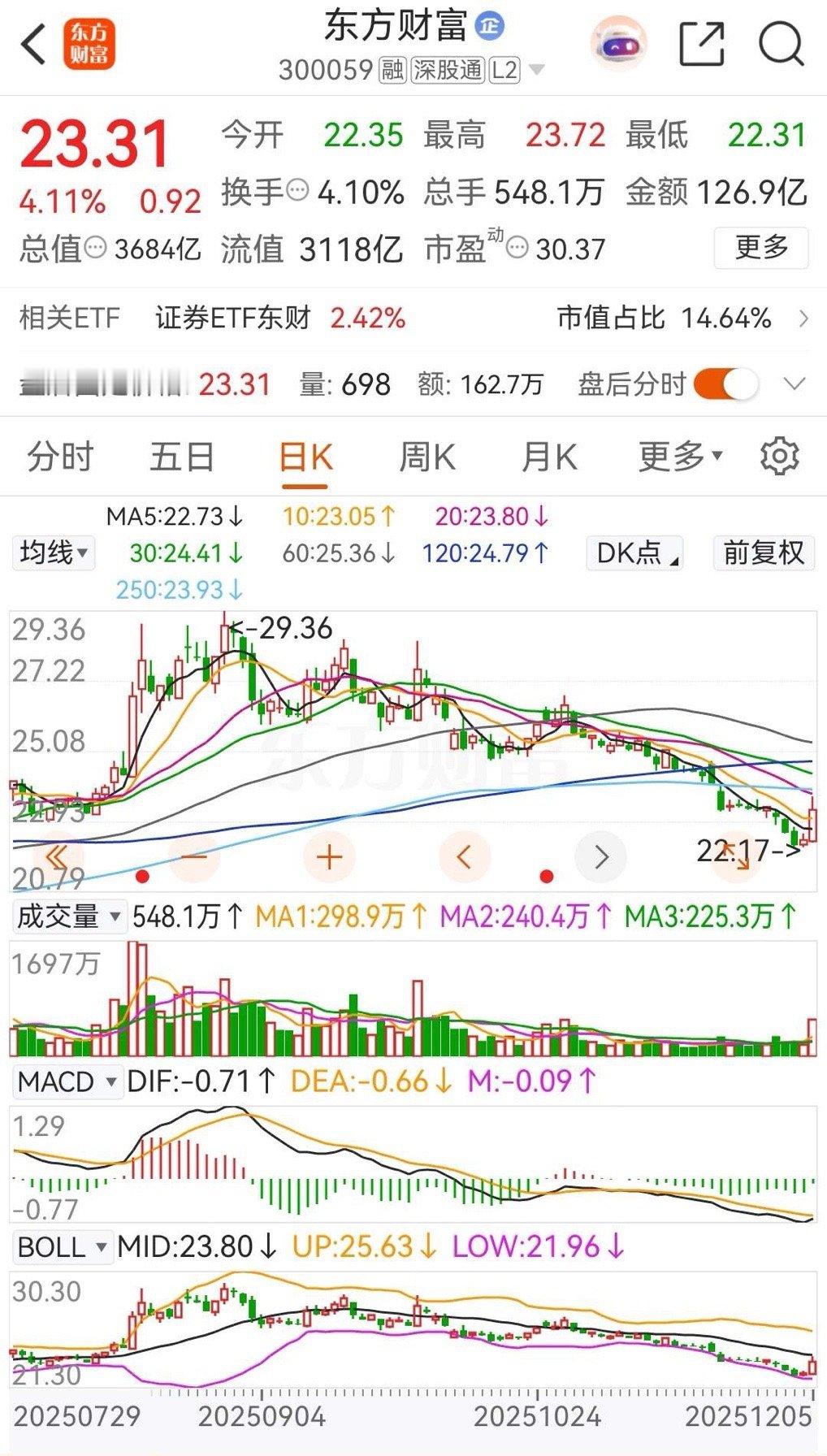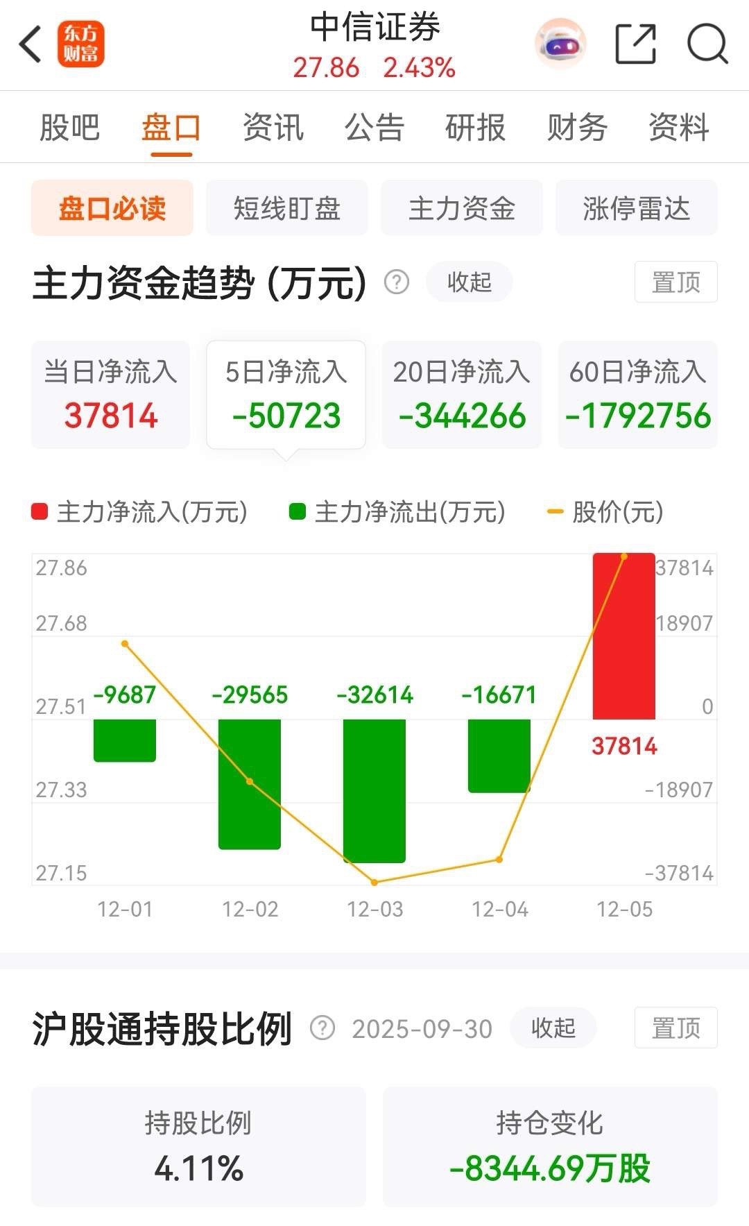 东方财富今天低开高走,大涨4.11%,连续2天被主力资金净买入;中信证券今天则是平开高走,上涨了2.43%。东方财富今天早盘低开后横盘整理,到了下午突然放量拉升,盘中最大涨幅曾一度达到了5.94%,收盘时回落到了4.11%,报价为23.31元,全天的成交金额为126.90亿元。在资金流向上,今天被主力资金净买入了5.3247亿元,目前已是连续两天被主力资金净买入了,近五个交易日则是合计被净卖出了 20.9718亿元。从走势上看,随着今天在低位的大涨,股价一举收复了五、十日均线,盘中差点就摸到了20日均线;周线则是连续两周收出十字星线,上周为缩量小十字星,本周则是放量大十字星线。中信证券今天的走势同东财差不多,早盘平开后横盘整理,到了下午突然放量拉升,最高涨幅曾一度高达 3.27%,回落后则收报于2.43%,收盘报价为27.86元,全天的走势金额为 45.36 亿元。在资金流向上,今天被主力资金净买入了约3.7814亿元,近五个交易日则是被主力资金合计净卖出了5.0723亿元。从走势上看,中信证券连续两天上涨,股价也收复了五、十日均线,盘中最高价时曾一度上穿过了20日均线;周线则是连续两周收出小阳线。至于更详细的技术分析,可以查看上一篇中关于今天券商概念板块走势的分析。下面简单说说券茅和券商一哥的估值情况,对于东方财富来说,存在着高估值风险: PE 37倍(行业平均20倍),股东数超 101万散户加剧波动,成交缩量即触发抛压。而中信证券则是有着防御属性:PE 17.58倍+股息率2.6%(分红率30%+),但信用减值损失陡增(Q3计提50亿)引发风控质疑。此外,目前券商概念板块的PB仅为1.52倍(历史40%分位),ROE预期70%分位,估值剪刀差存修复空间。