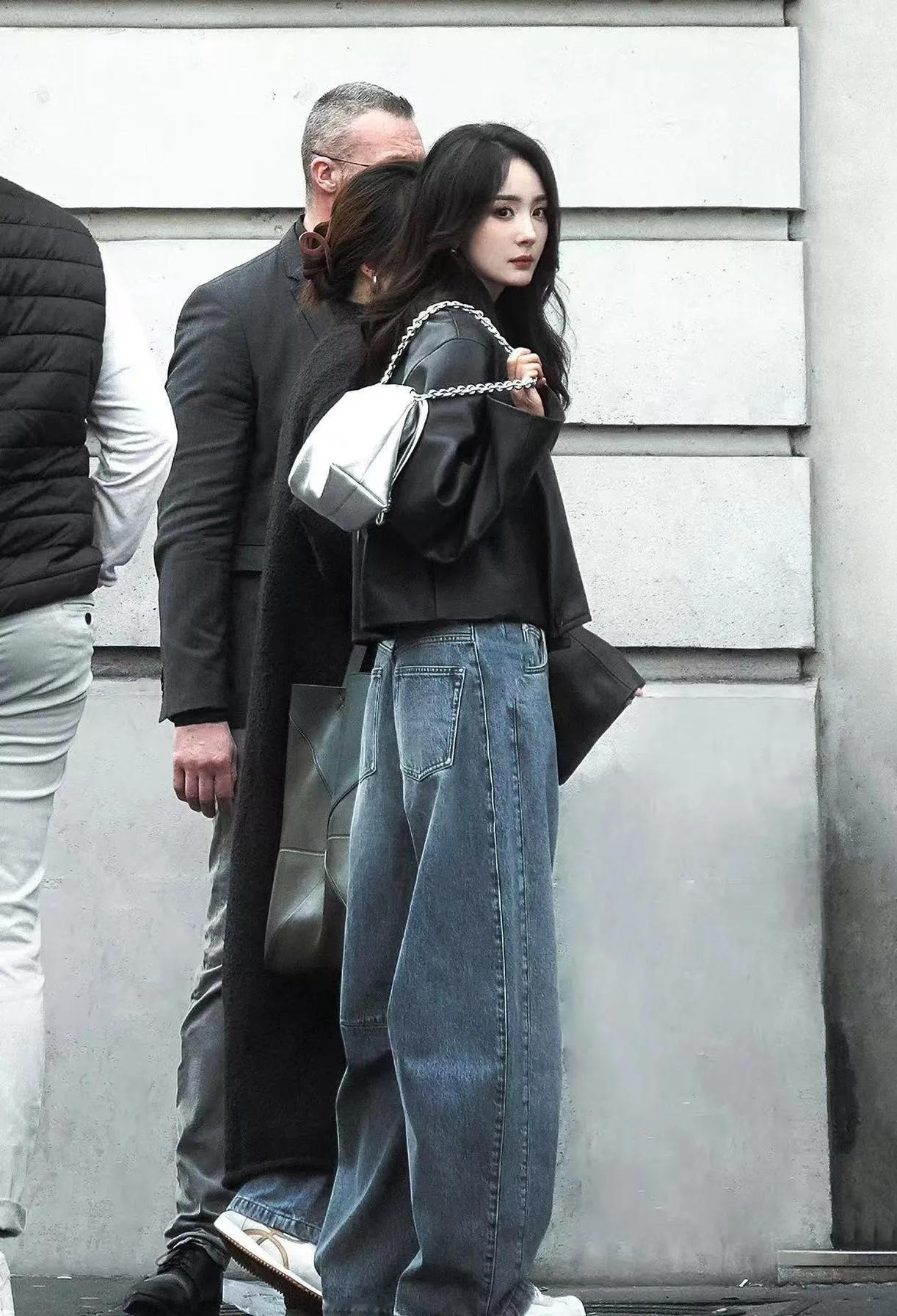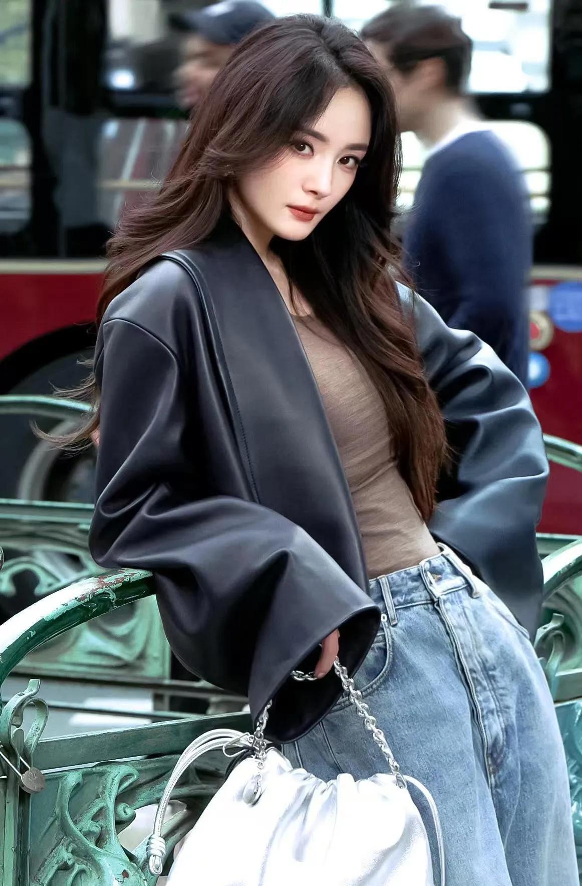 杨幂这“黑皮衣+阔腿裤”,把街拍松弛感焊在身上了 谁能拒绝杨幂的街拍啊! oversize黑皮衣自带飒爽气场,搭浅蓝阔腿牛仔裤瞬间柔化了酷感,银色褶皱包一拎又添了点精致松弛——这哪是“会穿”,明明是把“随性贵气”刻进了日常!