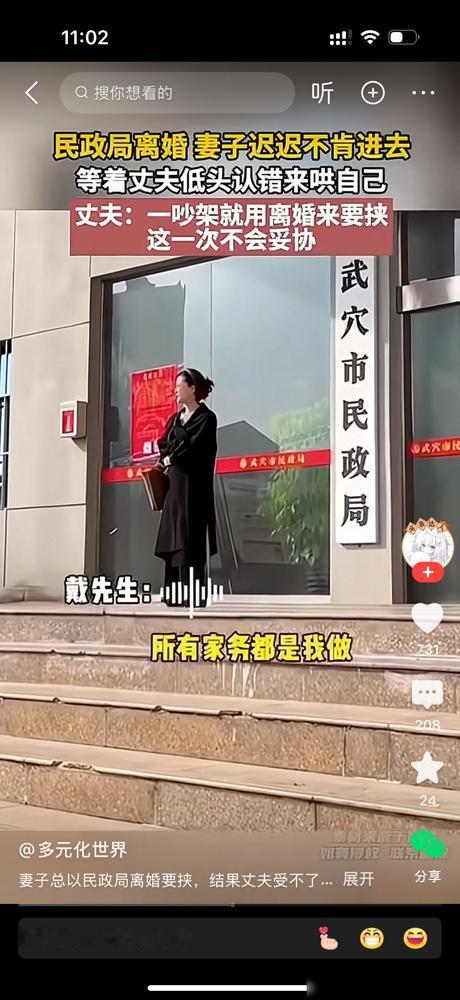 民政局离婚的门口,妻子迟迟不肯进去。丈夫再三催促,她就是不进去。妻子一定是后悔了。但丈夫心意已决,他表示自己不会再妥协了。 这次男人是铁了心。冰冻三尺非一日之寒。 看看这丈夫说的。下班回家还得做饭,家务全包。一吵架,妻子就把离婚挂嘴边。这谁受得了?拿离婚当武器,次数多了,也就吓不住人了。 这场景太典型了。很多家庭里,默默付出的一方,往往是被忽视的那个。丈夫承担了大部分家务,妻子却习以为常,甚至用离婚来威胁。这日子过得确实憋屈。 网上有个说法叫“家务劳动隐形剥削”。虽然这个词有点学术,但道理是通的。凭什么认为家务就该是某一方的责任?夫妻是搭档,是互相扶持。 想想也是。现在双职工家庭是主流,两个人都上班,都累。回到家,家务活理应共同分担。如果总是一方在付出,另一方觉得理所应当,时间长了,心就凉了。 这位丈夫的爆发,不是一时冲动。是日积月累的失望堆成了山。每次妥协,可能换来的不是理解,而是下一次更轻易的威胁。 婚姻不是谁欠谁的。它需要的是双向奔赴。单方面的付出和忍让,撑不起一个家。 最近好多社会新闻都在讨论家庭责任分配。从“丧偶式育儿”到“守寡式婚姻”,核心问题差不多:家庭责任失衡。一个人扛久了,总会累的。 这个男人选择不再妥协,不是不爱了,而是爱得太疲惫了。他的离开,更像是一种自救。 婚姻里最伤人的,往往不是大风大浪,而是这些日复一日的细节消磨。一句伤人的话,一个冷漠的眼神,一次不公平的对待,都在消耗感情。 好的婚姻,应该是个避风港。而不是一个人的战场。 希望这件事能给类似处境的人提个醒。婚姻需要经营,需要看见对方的付出,珍惜对方的包容。别等到失去了,才在民政局门口后悔。 任何关系,尊重和珍惜都是底线。
