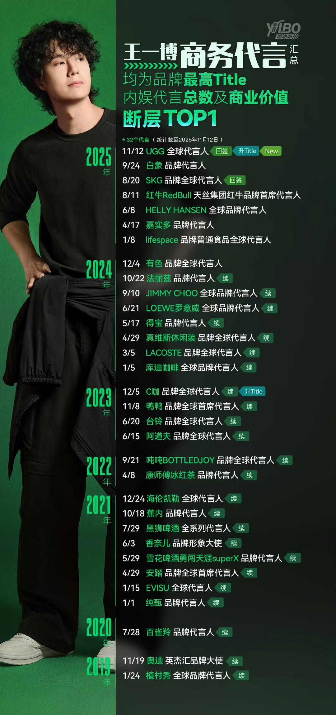 同一天,新代言预热,老代言续约。 C咖官宣和王一博续约——和王一博携手开启第三年。 三年四年五年六年……放眼看去,王一博代言品牌都这么“长情”。究其原因不外乎王一博值得,值得“等待”值得续约再续约。 几年了,来来往往,花开花落,王一博的商务仍然内娱断层top1,数量质量title全部最高。