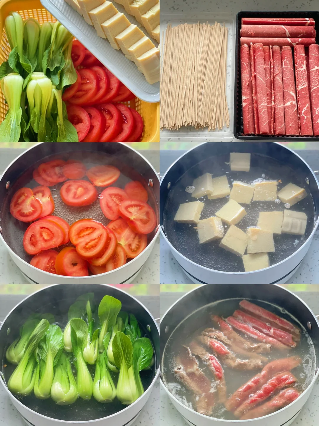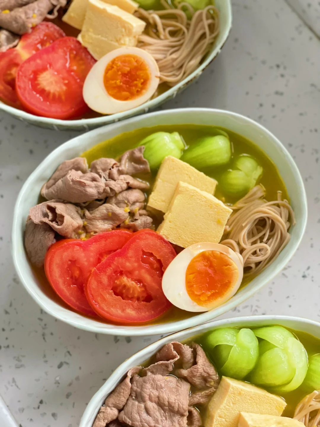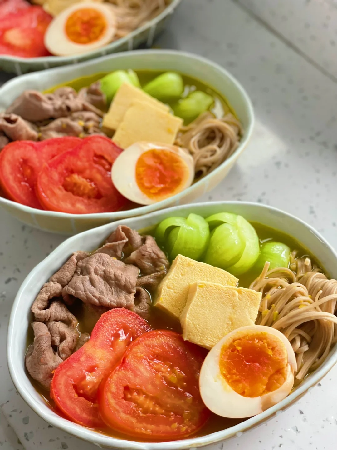 热气腾腾的三餐 🌟酸汤肥牛蔬菜荞麦面 肥牛|荞麦面|西红柿|上海青|冻豆腐|溏心蛋|酸汤包 1️⃣肥牛、荞麦面、西红柿、上海青、冻豆腐(冻豆腐应该在酸汤里面煮这样更加吸味,吃的时候才想起来[失望R])都分别在水中烫熟 2️⃣酸汤包我是网上买的低卡,配料表干净的。直接放到清水里煮沸,浇在之前烫好的食材中就可以开吃 ❤️配了个溏心蛋,补充优质蛋白 ❤️冻豆腐−用普通的嫩豆腐放到冰箱冷冻,吃的时候提前解冻就可以了。冻过的豆腐切开里面的组织非常的吸汤,特别适合用来煮火锅或者配合酸辣汤一起吃😋😋