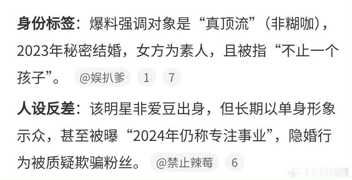 2025年末内娱“瓜田”大爆炸,顶流隐婚生子话题闹得沸沸扬扬,相关话题阅读量破50亿。陈伟霆和何穗6年地下情堪称“隐婚生子”典范,从2019年初遇,到2025年直接官宣生子,精准避开恋爱期舆论,把争议化为祝福。 而另一位真顶流被曝2023年与素人隐婚生子,2024年还立单身人设,甚至被扒孕期出轨。这背后是流量经济下“单身人设=摇钱树”的畸形生态。塌房后,艺人商业价值受损,粉丝情感被践踏。对比任嘉伦巅峰官宣婚姻获好评,可见真诚在娱乐圈多么稀缺。