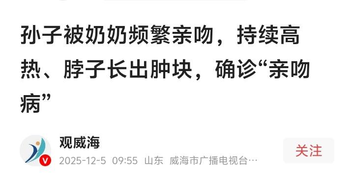 奶奶一个吻,孙子高烧不退脖子长肿块!福州10岁男童确诊“亲吻病”,超九成成人携带的病毒正悄悄威胁每个孩子 当奶奶充满爱意的亲吻,竟成了孙子持续高烧、脖子肿痛的元凶,这并非危言耸听,而是近日发生在福建福州的真实病例。一名10岁男孩因奶奶在口腔溃疡期间频繁亲吻,不幸感染EB病毒,确诊为“传染性单核细胞增多症”,俗称“亲吻病”。这则来自福建省人民医院的案例,犹如一记警钟,敲在了无数疼爱孙辈的祖父母和年轻父母心上。 超过90%的成年人体内都潜伏着EB病毒,它就像一位安静的“房客”,在免疫力正常时相安无事。然而,对于免疫系统尚未发育完善的婴幼儿和儿童,这位“房客”却可能瞬间变成“暴徒”。一次亲密的唾液接触,尤其是通过亲吻、共用餐具,就可能打开病毒的潘多拉魔盒。 爱意浓烈,方式却可能错了位。我们理解隔代亲那份融化一切的热情,那布满皱纹的脸颊贴近稚嫩肌肤时的幸福与满足。但真正的爱,是呵护与责任,而非仅凭本能的情感宣泄。当亲吻可能携带风险,克制便成了更深沉的爱护。 看看新闻下的评论区,已然炸开了锅。有网友痛心疾首:“小孩不能嘴对嘴亲,也不能嚼饭喂孩子!”这背后是对幽门螺杆菌等常见传染病的普遍担忧。也有网友深感后怕,分享自己因频繁亲吻孩子脸蛋,导致孩子皮肤出现问题的经历。更有理性声音呼吁:“注意卫生有必要,但不必过度紧张。” 然而,争议之中更需清醒。事件的核心并非制造家庭矛盾或指责长辈,而是唤起科学的育儿认知。大人的口腔环境复杂,感冒、发烧、口腔溃疡、疱疹期间,唾液中的病原体浓度更高,此时与孩子的亲密接触无异于一场“细菌病毒”的直接输送。 孩子不是试验品,他们的健康防线远比我们想象中脆弱。持续高烧、颈部淋巴结肿大、精神萎靡、咽喉剧痛……这些“亲吻病”的典型症状,一旦出现,必须立即就医。目前对此病并无特效药物,主要依靠对症支持和自身免疫系统克服,过程可能长达两周,孩子备受煎熬。 我们倡导的表达爱的方式,可以有很多种。一个温暖的拥抱,一次有趣的亲子游戏,一段耐心的睡前故事,同样能传递深厚的情感。保持个人卫生,使用公筷公勺,避免唾液直接接触孩子的口、眼、鼻和伤口,这些细微之举,才是构建孩子健康屏障的砖瓦。 这个发生在福州的事件,是一个缩影。它照见了传统育儿习惯与现代健康知识之间的碰撞。改变固有的亲密表达方式或许需要时间,但为了孩子灿烂的笑脸与健康的未来,这场关于“爱的分寸”的思考与调整,值得每一个家庭认真对待。爱,请用更安全的方式打开。 (来源:根据福建省人民医院专家介绍、大象新闻、第一帮帮团等媒体报道综合整理) 亲吻病警示 育儿健康