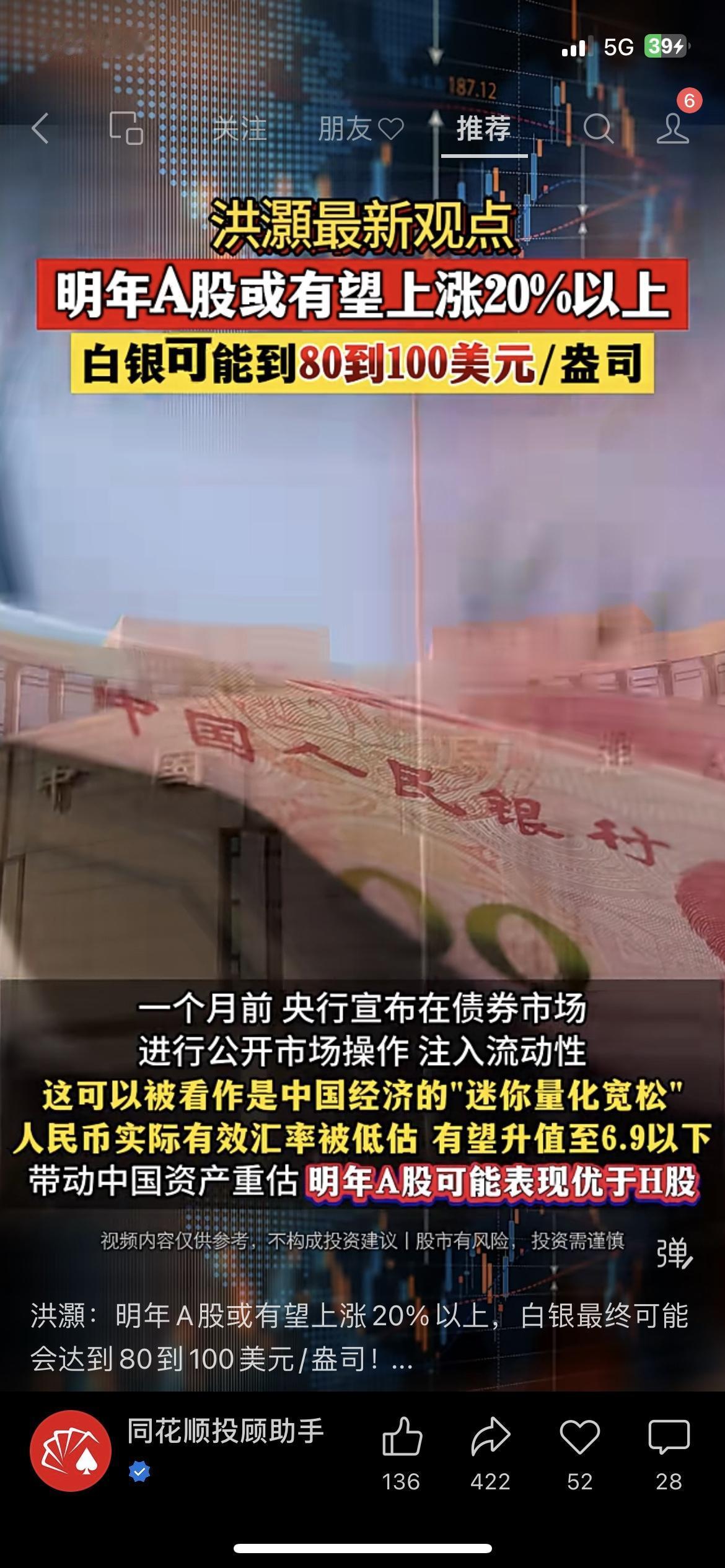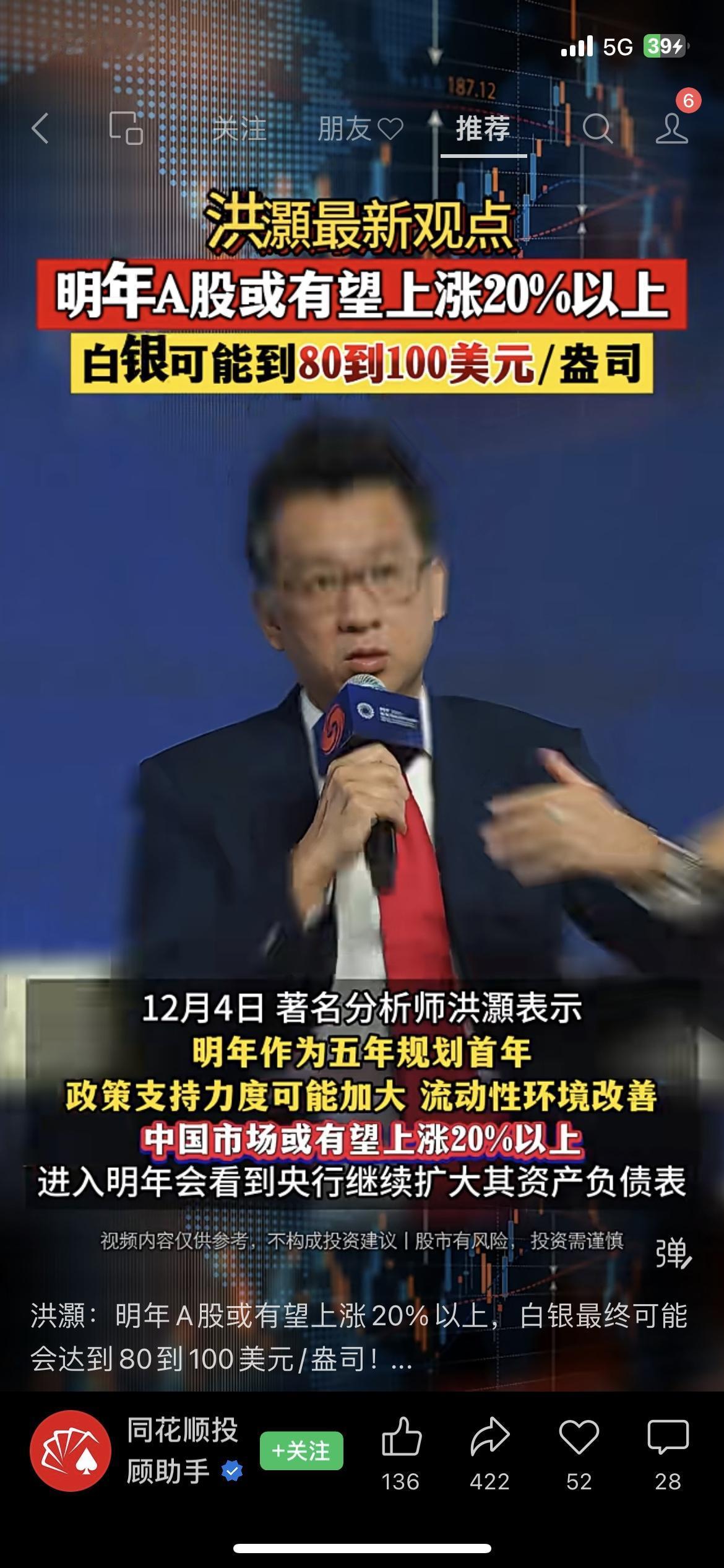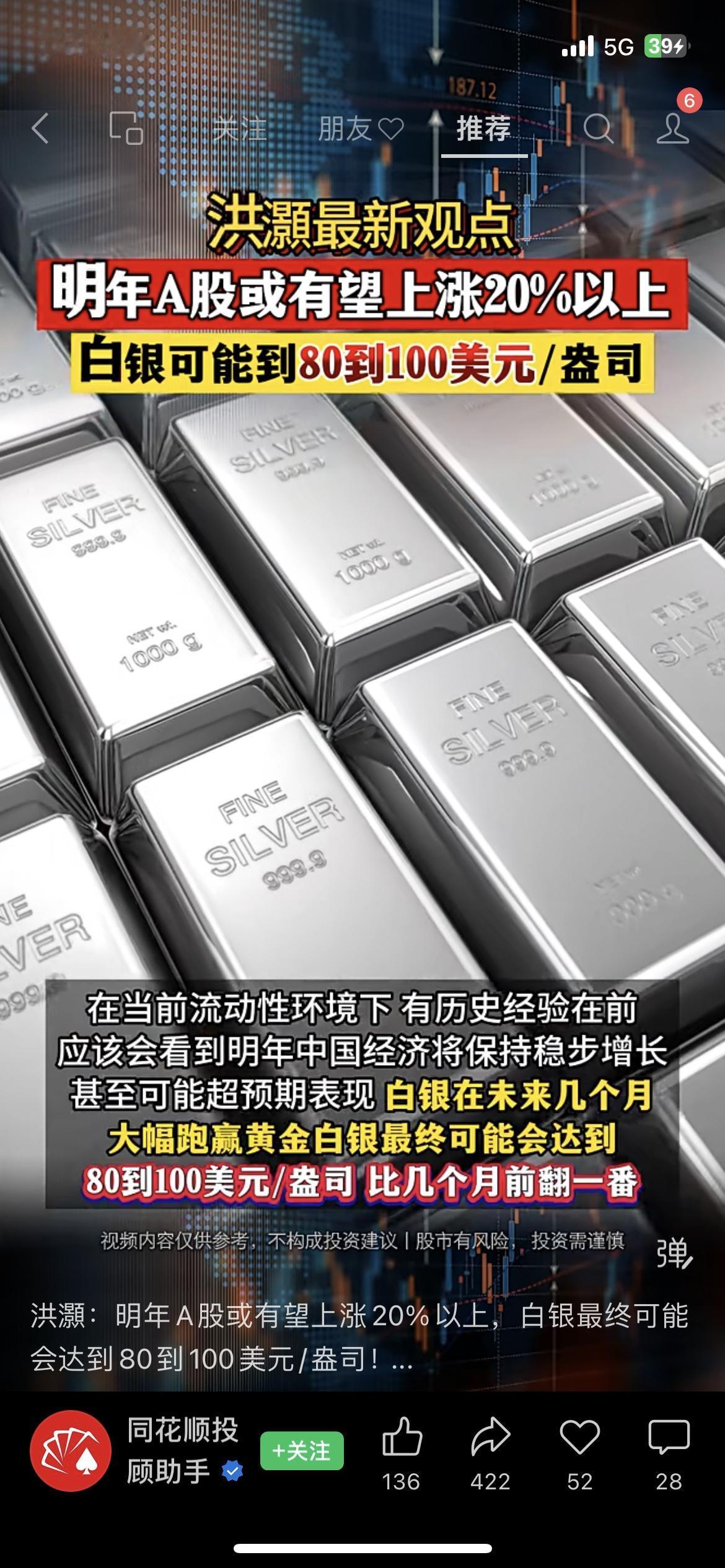 洪灏重磅预测:A股第五浪要涨20%+,白银能破80美元? 最近股民圈炸了!首席投资官洪灏在12月3日的演讲里说,中国股市的“第五浪”才刚开始,涨幅可能“涨到你不信”,还明确预测白银价格能冲到80美元(当前约25美元/盎司)! 他可不是瞎吹,给出的逻辑挺实在:现在经济基本面变了,房地产对GDP贡献从30%降到10%,新能源、半导体、高端制造这些新兴产业才是核心支撑,中国制造业增加值占全球三分之一,这就是牛市的底气。而且9-10月工业企业利润涨了20%+,上游通缩压力在缓解,消费意愿也会慢慢回升。 另外贵金属也疯了,黄金今年涨了70%,白银涨了90%,洪灏说这是因为全球纸币信用出问题了,美国国债快破40万亿美元,接下来工业金属还会接力涨。 (信源:12月4日财联社《洪灏:A股第五浪行情开启,白银价格或翻倍》) 现在A股已经重回4000点,你觉得这波牛市能持续吗?会跟着买白银、工业金属相关股票吗?有没有套牢的朋友,来评论区交流下操作~黄金白银价格 白银价格疯涨 白银市场行情