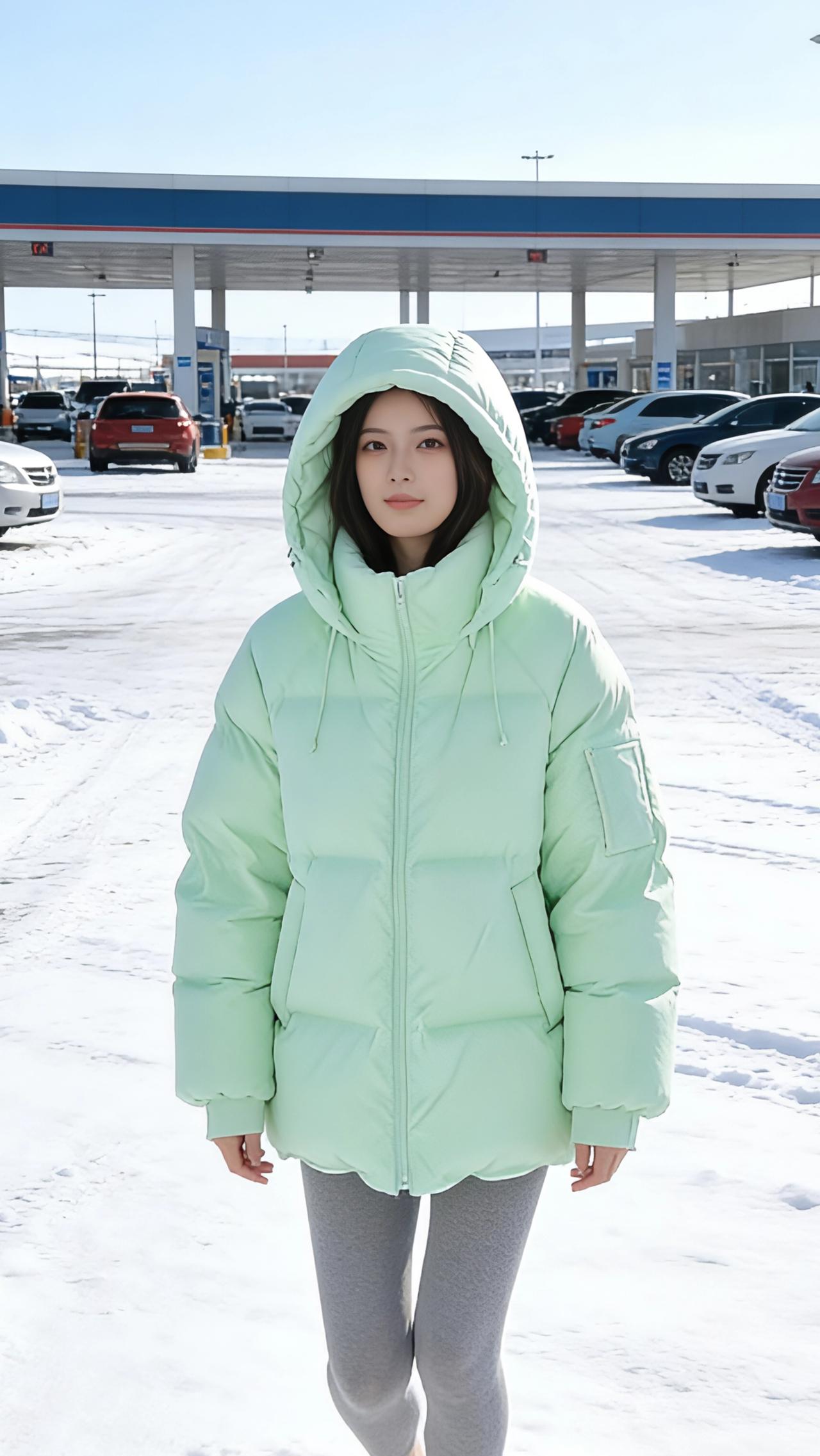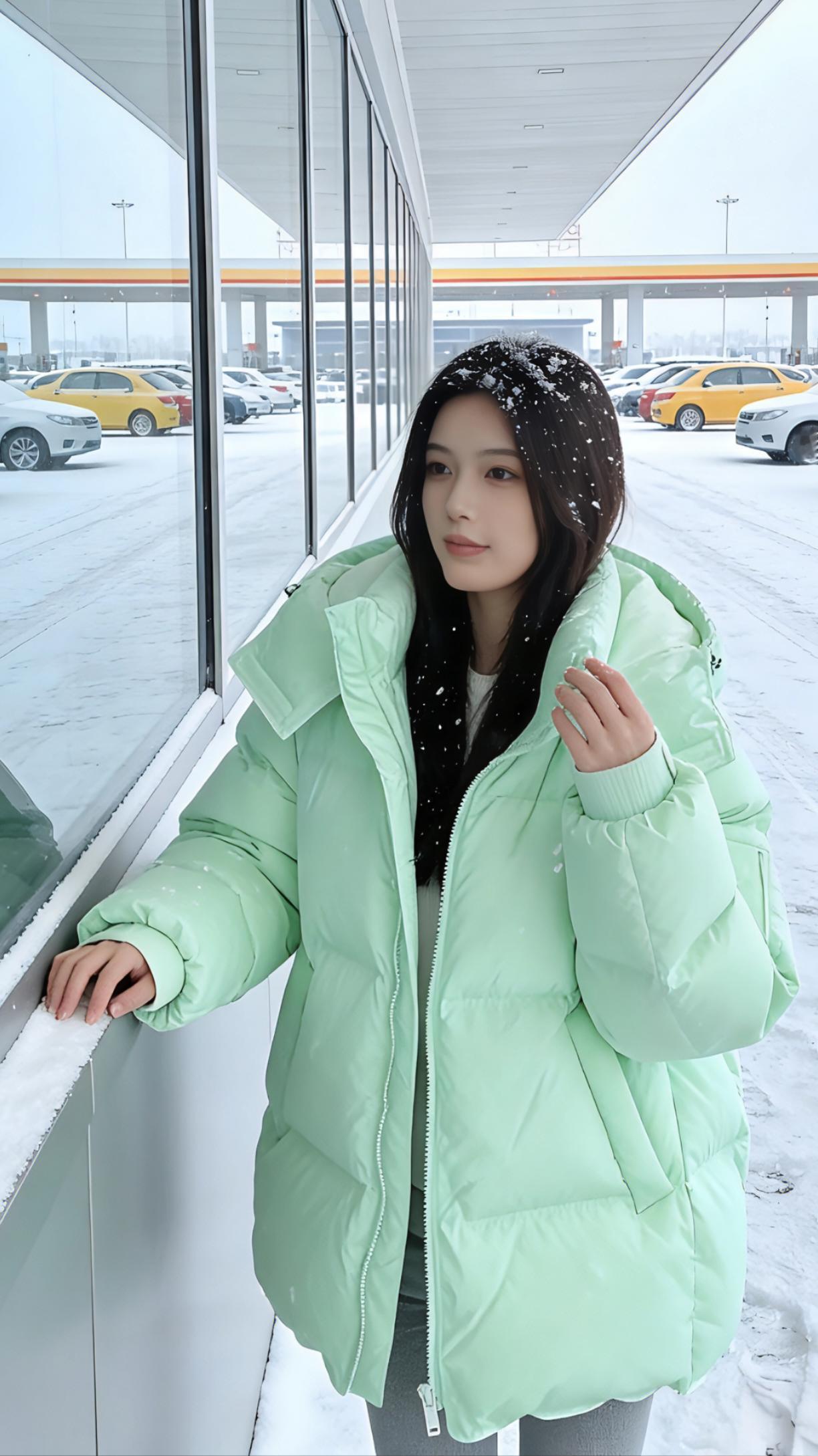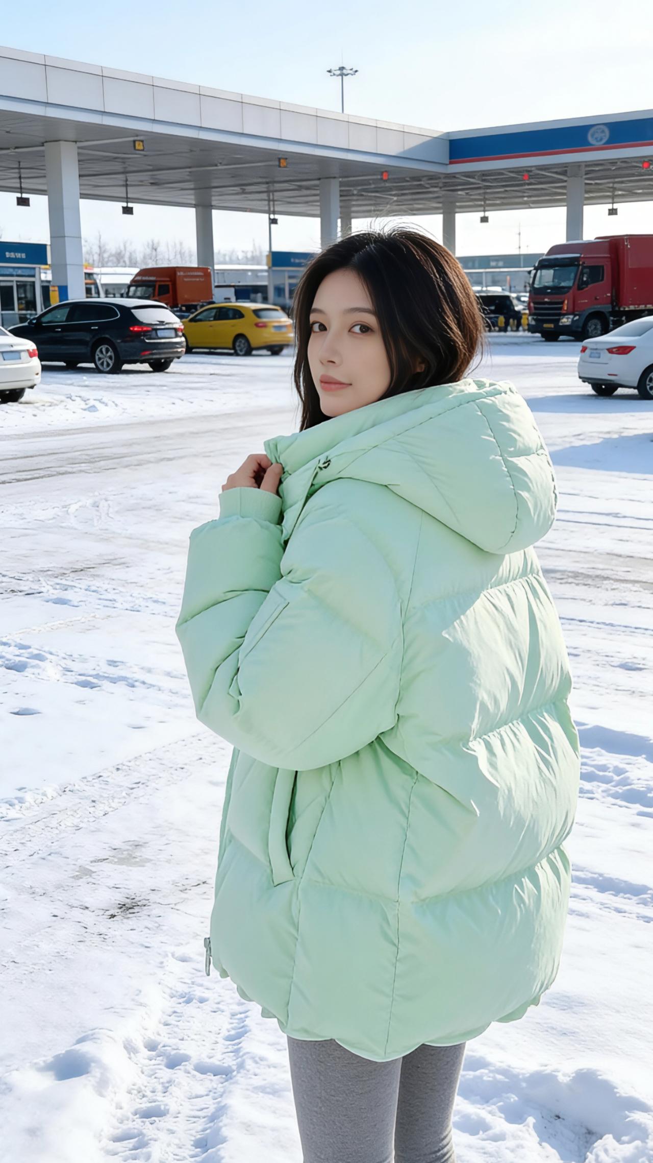 雪是冬日最妥帖的绒毯,裹住了加油站的柏油地,也把车辆的轮廓晕成软乎乎的色块。 她裹着那件浅绿色的羽绒服站在雪里,像把春的芽苞偷揣进了冬的口袋——不是扎眼的鲜绿,是被雪浸软的浅薄荷色,松松软软地笼着肩背。指尖碰雪的时候,凉意顺着指节往上窜,她却弯着眼笑,掌心那捧白就跟着颤,碎成星星点点的凉。拢衣领时,连帽的绒边蹭过发梢,落进去的雪粒化得慢,沾在发尾像细碎的糖霜。 加油站的顶篷支着淡蓝的边,阳光斜斜铺下来,把雪晒得发亮,也把她羽绒服的褶皱染得暖融融的。她抬脸望的时候,眼尾盛着碎光,连带着周遭的车辙、远处卡车的红,都成了这抹轻绿的背景——不是喧嚣的站台,是冬日光景里,一段松松的、软和的停顿。 风过的时候,雪又落了些在她肩头,那件浅绿的衣摆轻轻晃,像把整个冬天的温柔,都揉进了这寸小小的、明亮的角落。 高级感穿搭 小个子穿搭 冬季穿搭 棉服