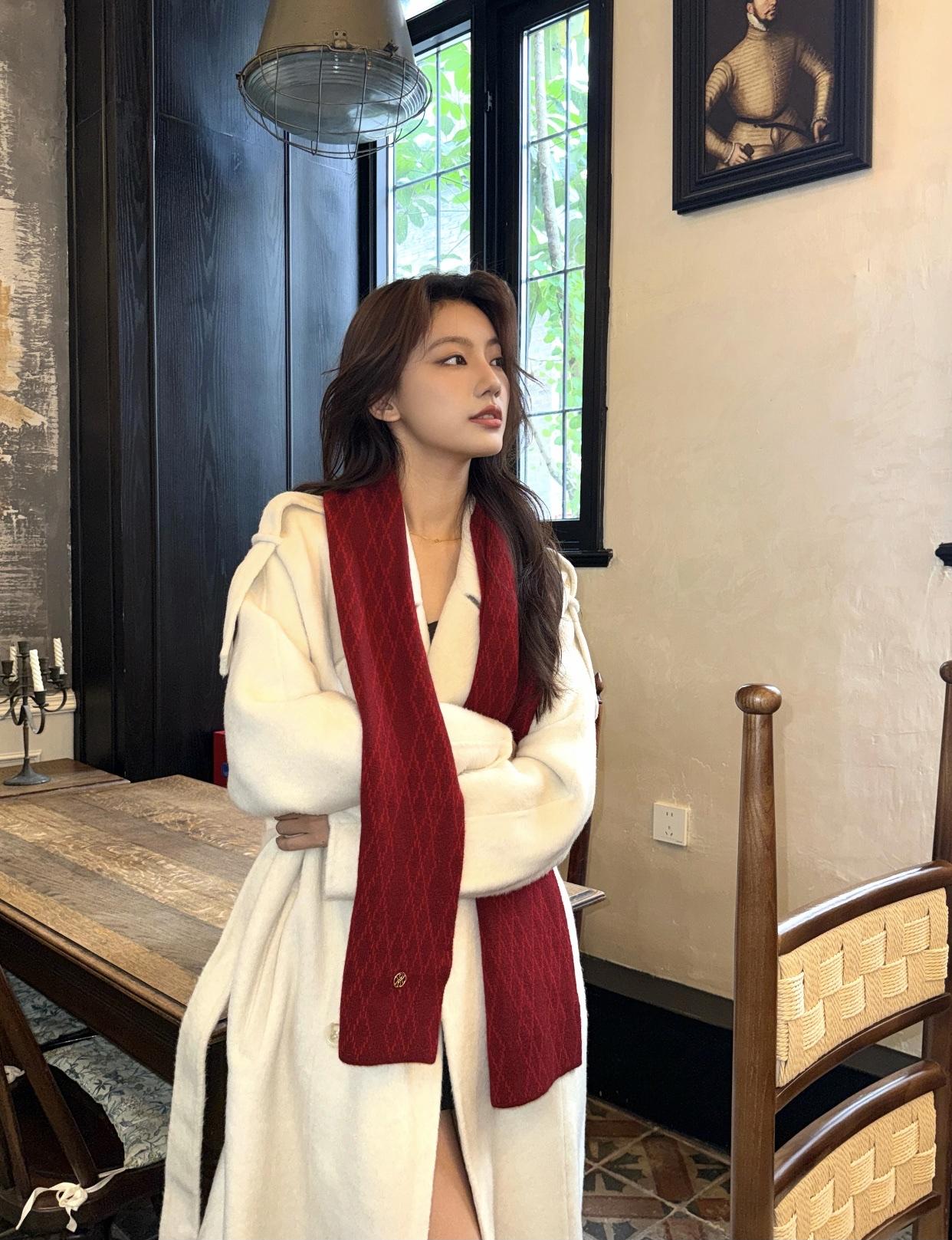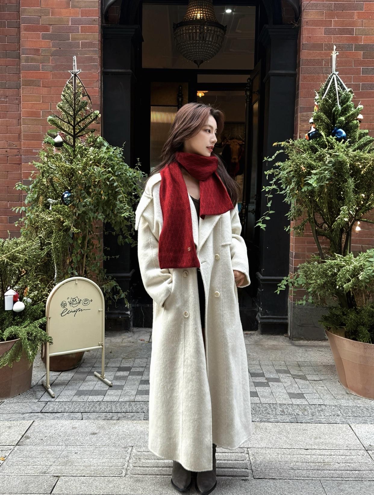 冬日暖阳下,红围巾与米色大衣的完美搭配,尽显优雅与温暖。米色大衣搭配