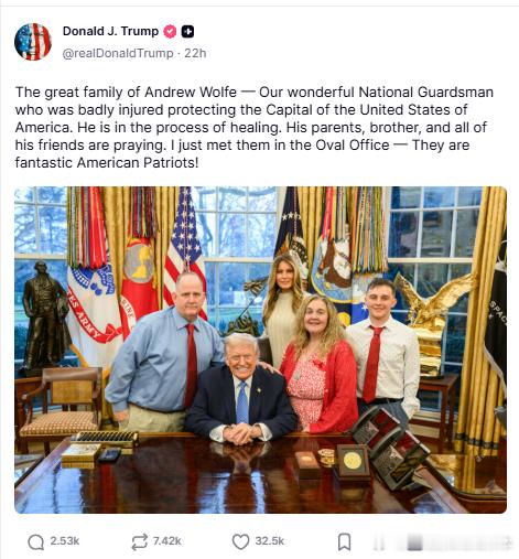 【黄金时代】川普和被阿富汗难民射击重伤的沃尔夫一家在一起安德鲁·沃尔夫的家人非常了不起——我们这位杰出的国民警卫队员在保卫美国首都时身负重伤。他正在康复中。他的父母、兄弟和所有朋友都在为他祈祷。我刚刚在椭圆形办公室见到了他们——他们都是了不起的美国爱国者!美国和欧洲当代史川普主义研究热点现场海外新鲜事
