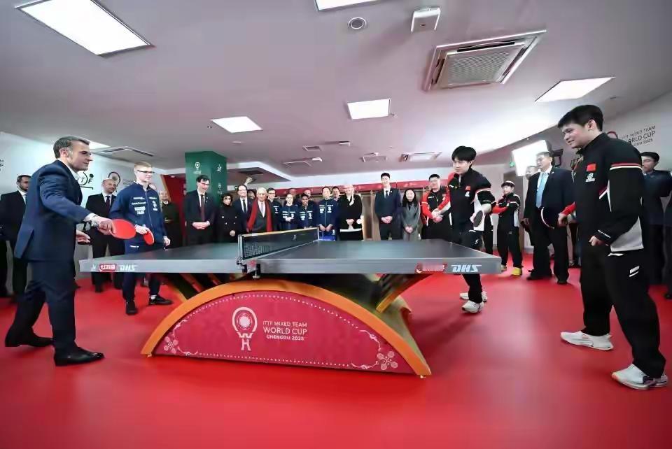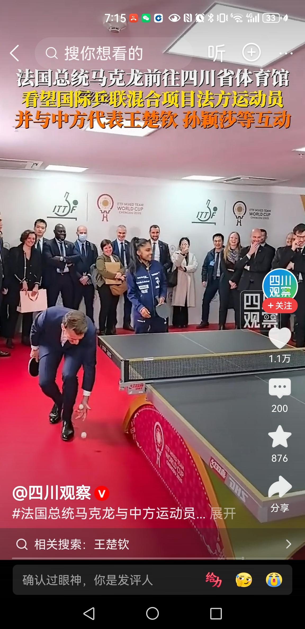 “莎莎”,马克龙总统喊你打球 12月5日,马克龙总统来到四川省体育馆与国乒选手会面 当国际乒联主席索林提议打混双时,马克龙有些迫不及待。直接用中文喊出“莎莎”,那份亲切劲儿瞬间点燃全场。 孙颖莎机智回应:“是mix double(混双)。”一句话逗得大家前仰后合。 接下来,马克龙和法国女选手搭档,对阵巴黎奥运会混双冠军“莎头组合”。 总统一身笔挺的西装,手握球拍开打。他握着球拍,聚精会神地盯着发球,认真接球… 似乎这球有点不听话,一会儿跑得太快出台,一会儿淘气地掉在地上…总统先生弯腰拾起… 场上四个人打得贼开心,观众们笑声掌声欢呼声不断! 这是莎头组合的名场面,也是中国乒乓外交的魅力! 瞧瞧咱莎莎,人见人爱,花见花开,世界第一,实至名归[赞]