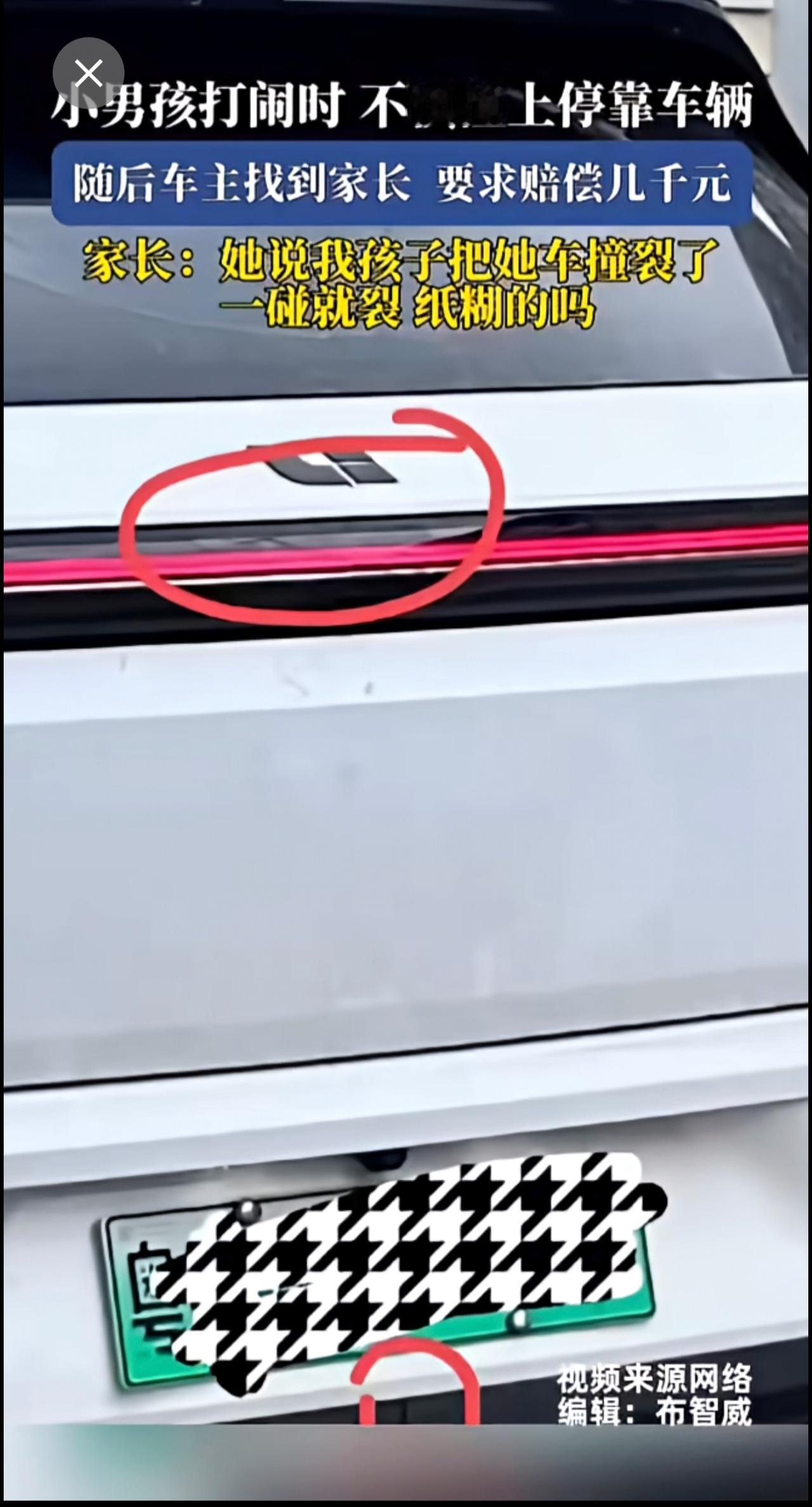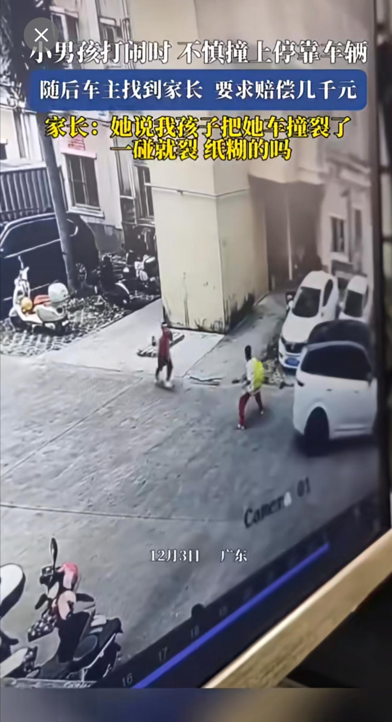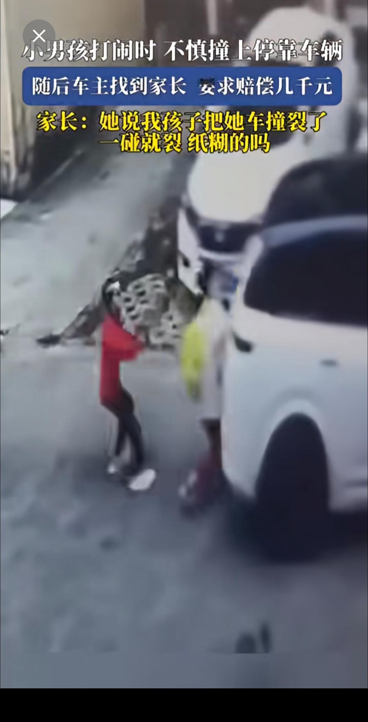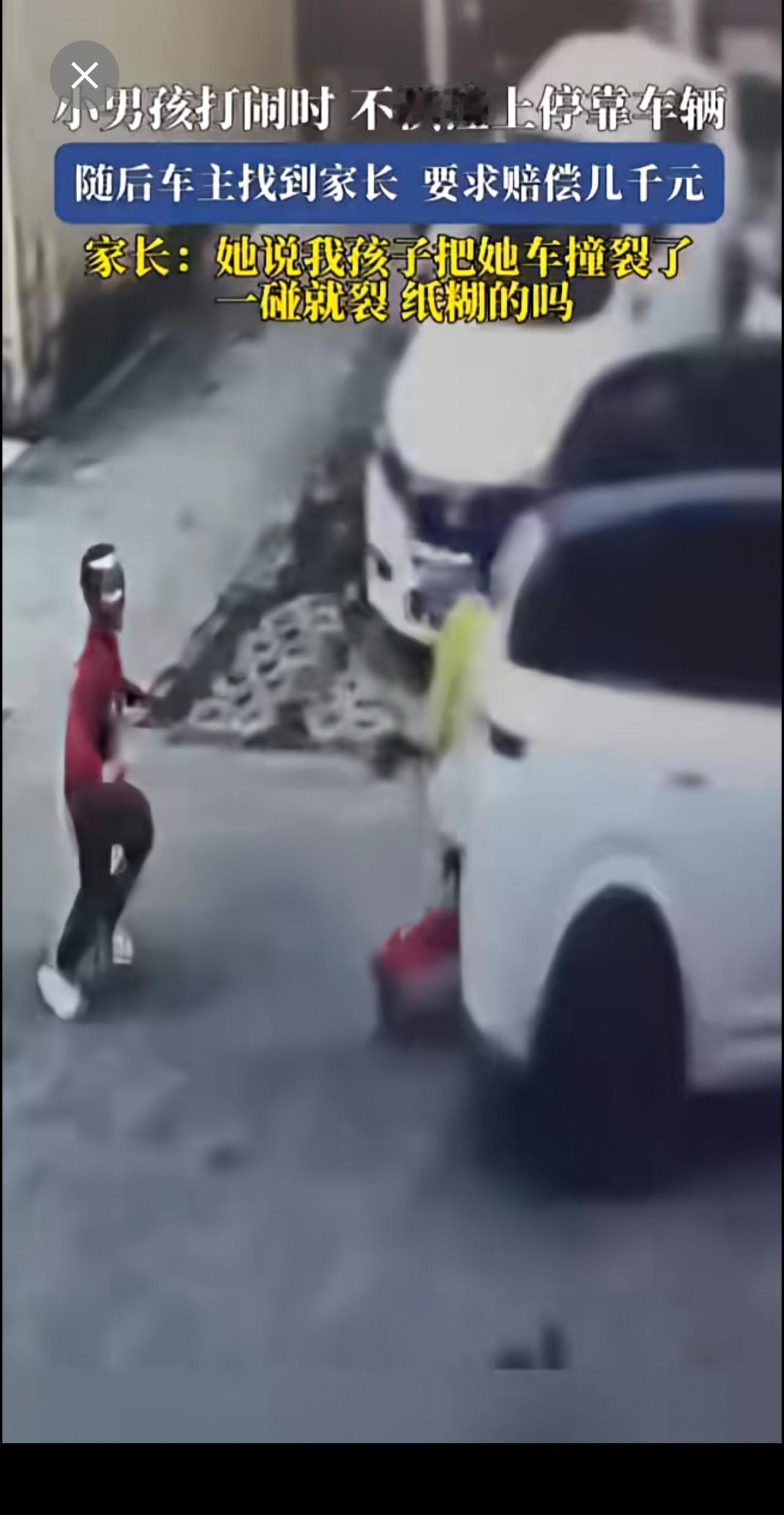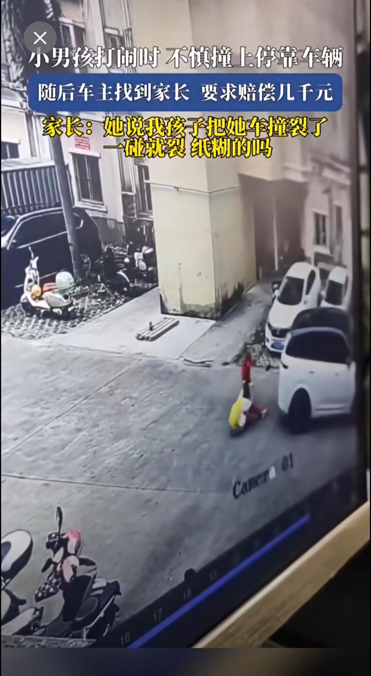 小男孩打闹时不慎撞上停靠车辆,随后车主找到家长,要求赔偿几千元,家长:她说我孩子把她车撞裂了,一碰就裂纸糊的吗?