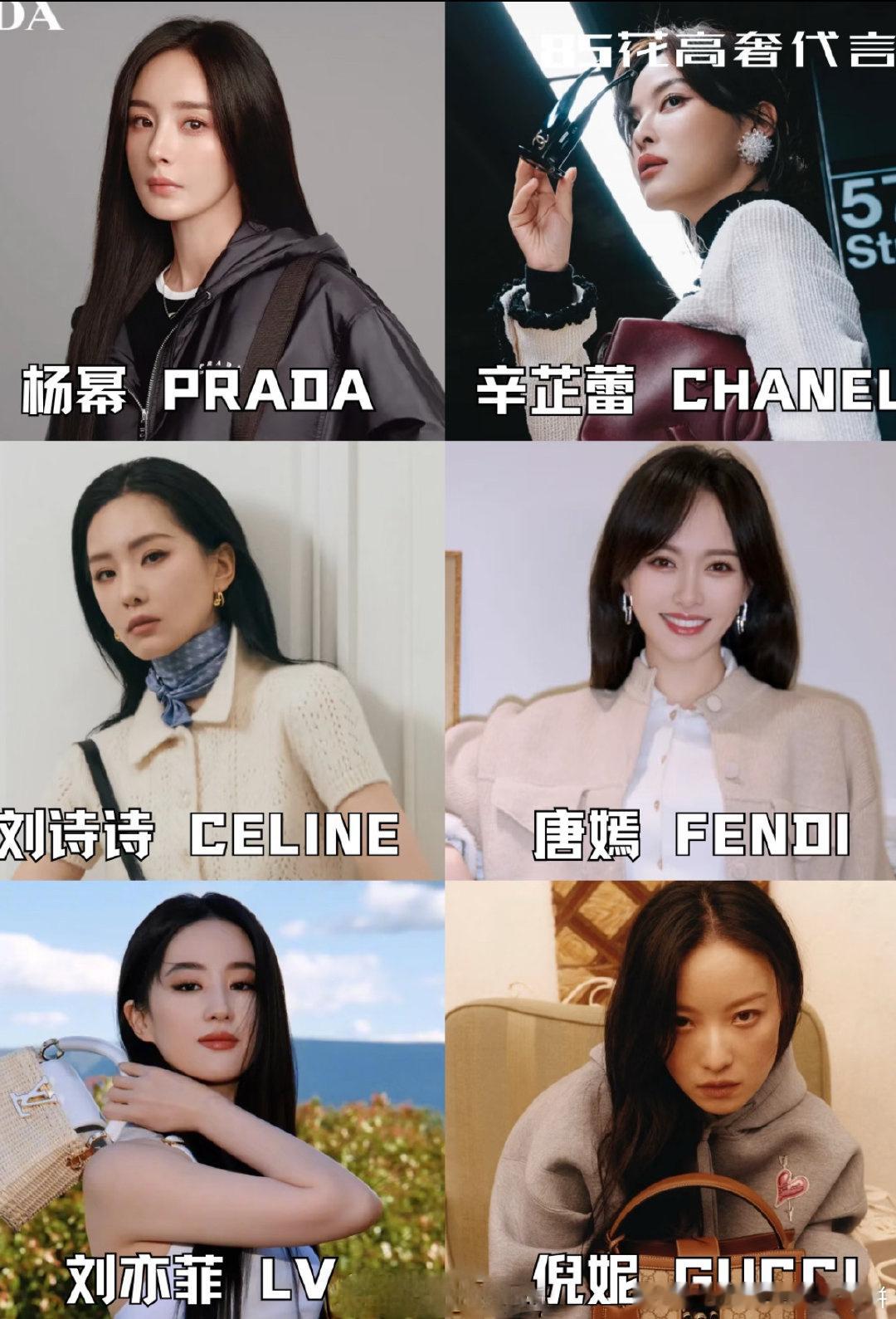 85花各自的奢牌代言:杨幂:prada辛芷蕾:chanel刘亦菲:LV倪妮:gucci 刘诗诗:celine唐嫣:fendi张小斐:巴黎世家