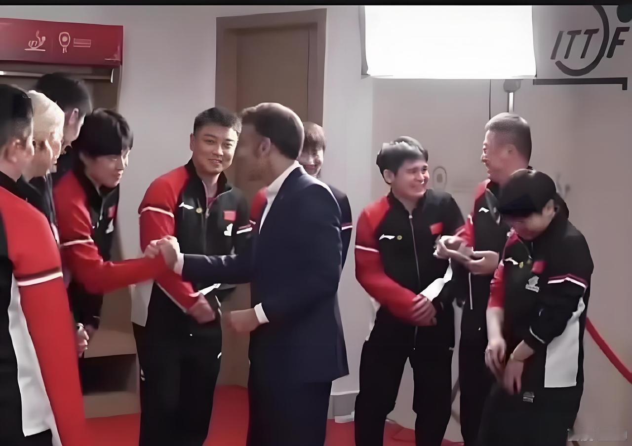 【法国总统来访,国乒彬彬有礼,非常松弛】国乒队伍,谦恭大方,接待法国总统,法国总统马克龙事先了解到每位成员的情况。完成球台上的切磋,总统再次与国乒王皓、王楚钦等握手一一寒暄。马克龙访华同日德英高调互动 握完手后的马导、小石头和莎莎,三人凑一块看手机,会心窃笑。王曼昱也忍不住侧身来看。现场没有出现安保人员,人群中洋溢着轻松活泼的气氛。总统在旁边继续与教练聊几句,场面毫不违和。姐姐弟弟哈哈大笑,马导也跟着笑。想必在分享刚才王楚钦夸张发球的英武之姿吧,有人说是功夫熊猫。