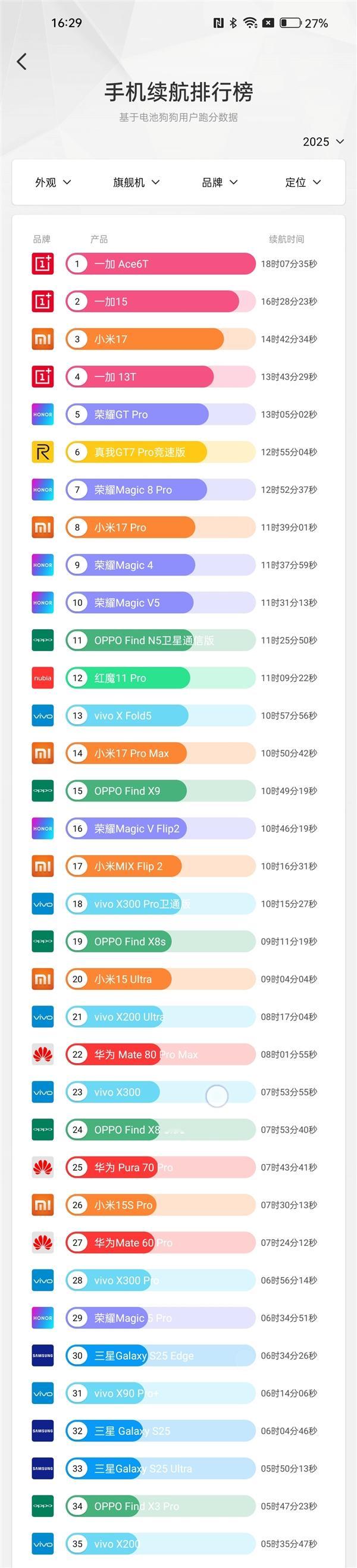 续航焦虑,这次真的被终结了吗?一加最新发布Ace 6T,全球首发骁龙8 Gen5并配备8300mAh巨无霸电池。根据快科技“电池狗狗”专业实测,其续航达到惊人的18小时07分,在旗舰机中实现断层式领先。排名第二的是一加15(16小时28分),第三名小米17(14小时42分)则成为小屏续航冠军。