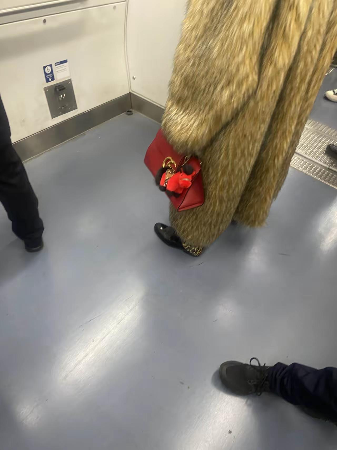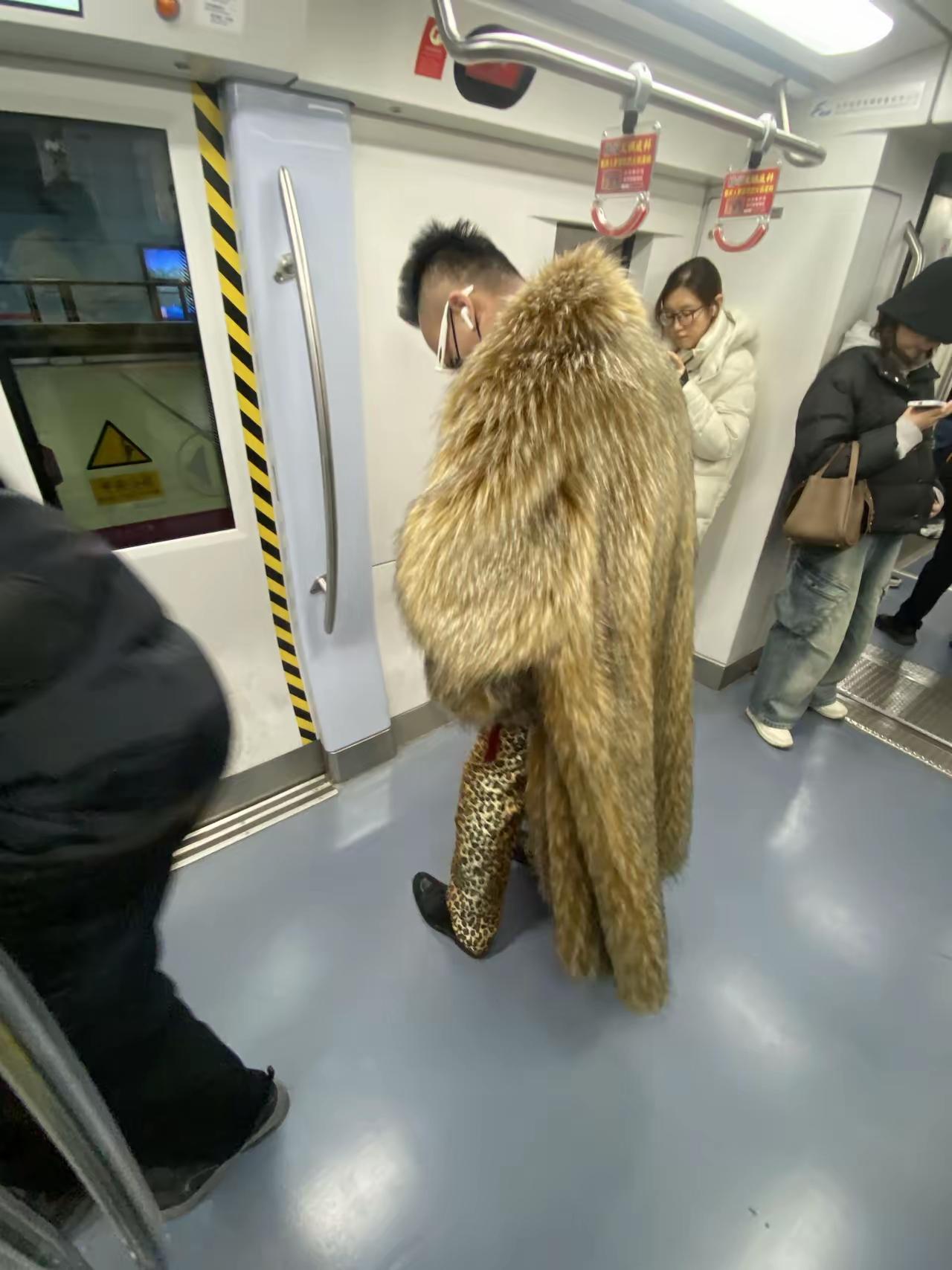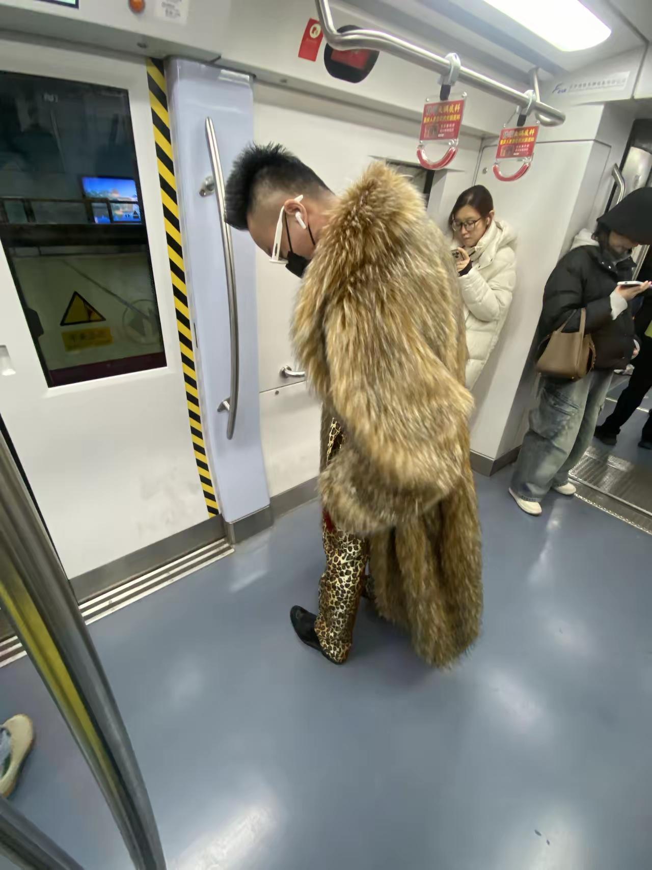 今儿在北京地铁2号线,算是开眼了。 车厢里,一位大哥的造型,直接让周围空气都安静了几秒。他裹着一件快到脚面的长毛大外套,看着就暖和(或者说,看着就热)。下半身,一条狂野的豹纹裤,配上一双锃亮的黑皮鞋。 这还没完。他手里,挎着一个红得极其扎眼的大牌包包,颜色正到晃眼。再往上看,一头炸毛的寸头,脸上墨镜口罩捂得严严实实,主打一个“你看不透我,但你必须看我”。 好家伙,这一身行头,东北的寒冬、热带的丛林、国际的秀场元素,在北京地铁车厢里完成了一次史诗级碰撞。 周围乘客反应各异:有的一本正经低头看手机,有的假装看窗外,还有的已经悄悄举起手机。 这混搭风格,属实给我看不会了。这是哪位时尚弄潮儿,把T台直接搬到了早高峰的地铁上?是“野生潮男流派”的即兴发挥,还是单纯的“我爱怎么穿就怎么穿”? 不得不承认,北京地铁的时尚阈值,今天是被这位大哥单枪匹马、狠狠拉高了。北京地铁