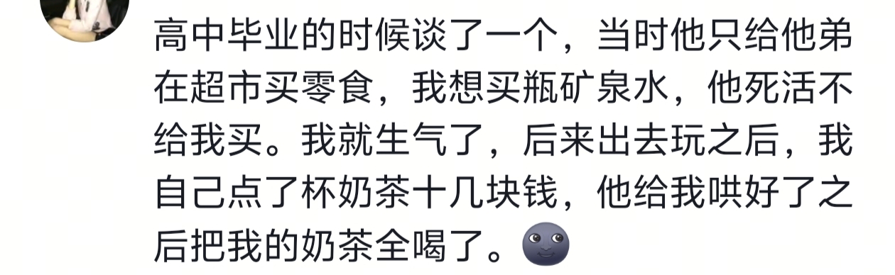 我想买瓶矿泉水,他死活不给我买,我就生气了,后来出去玩之后,我自己点了杯奶茶十几块钱,他给我哄好了之后,把我的奶茶全喝了