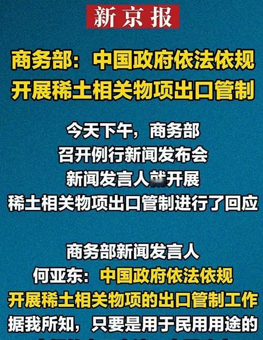 中国也要开始反制了!特朗普刚刚签署涉台法案,我们就对美国的稀土进行出口管制。 我们也不是一刀切,只要是民用的我们都审批,但是如果不是民用的就另寻高明吧,但是美国的军工却等不起。 美国不管是导弹还是军舰,都需要稀土,而自己本身稀土产量就很少,而且就算进口稀土也没有加工的条件。 因为美国自从去工业化后,稀土加工行业就比不上中国了,而且这个现在要重新建设产业链要几年的时间,上亿美元的投入。 而且中国还让规定了用中国技术提取出来的稀土也要经过中国的审批,美国想要偷梁换柱都不行了。 中国还不是一棒子打死,而且区别对待,这样美国民间的对中国的意见也没那么大,属于既得民心,也给美国沉重的一击。 不知道大家是怎么看待的,评论区聊聊。