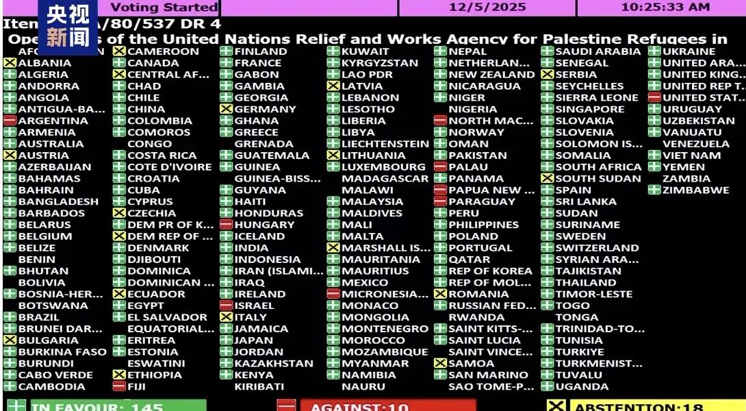 看吧,寥寥无几的反对!被孤立的是美以自己 12月6日央视新闻客户端消息,美国当地时间12月5日,第80届联大通过了特别政治和非殖民化委员会多份涉巴勒斯坦及中东的决议。 看电子屏幕,这是一次压倒性通过!包括美国和以色列在内的反对票仅仅10个。 这次通过的决议内容包括:联合国近东救济和工程处的运作、向巴勒斯坦提供援助、巴勒斯坦被占领土等。 这里提到“巴勒斯坦被占领土”,“被占”二字说明以色列强占的超出“两国方案”的巴勒斯坦土地从来不被联合国和绝大多数会员国所承认! 东方大国在此次会议中强调,除了确保加沙地带全面持久停火、人道援助和“巴人治巴”外,要直面问题根源,那就是“两国方案”。 以色列和美国当然反对,但追随者已经寥寥无几。美以把自己孤立了。 (来自央视新闻客户端)