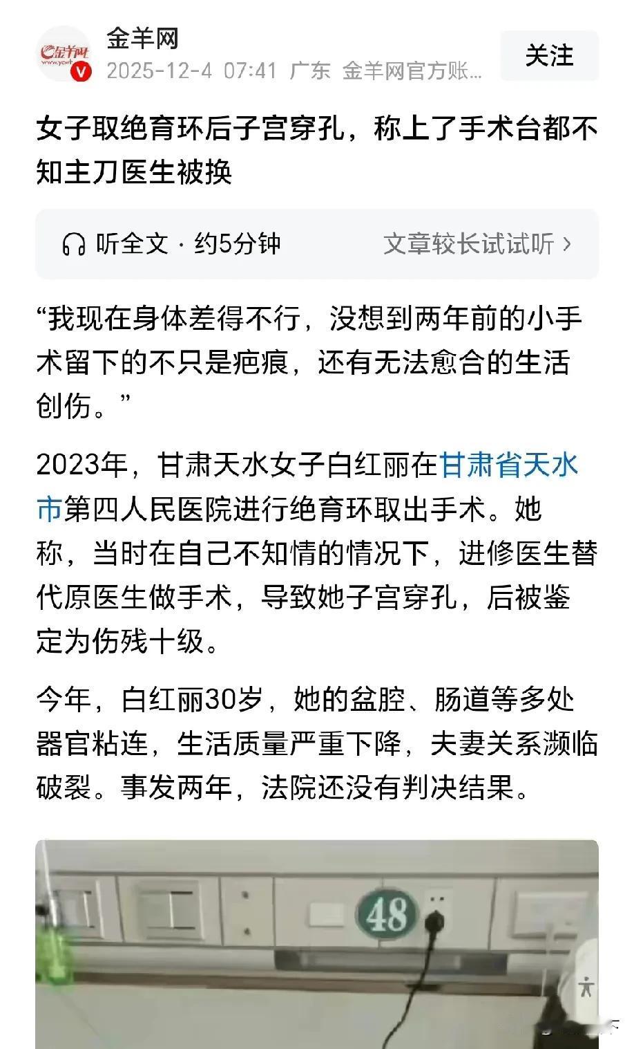 绝育环取出术变“夺命劫”:偷换医生的背后,藏着多少患者的隐忧? 甘肃天水这位30岁女子的遭遇,读来让人脊背发凉,更戳中了无数人就医时的深层恐惧——把生命托付给医院,换来的却是赤裸裸的敷衍与伤害。明明特意敲定经验丰富的妇科主任,上了手术台却换成毫无实操经验的进修医生,这场未经告知的“偷梁换柱”,偷的是患者的信任,换的是她后半辈子的健康。 手术台上的第一钩,不仅钩穿了子宫,更击碎了医患间最基本的契约精神。腹痛难忍时求药被拒,医生一句“疼痛敏感”轻飘飘带过,直到患者痛到休克才紧急送ICU,这般冷漠与漠视,哪里还有医者仁心的影子?患者要的从不是特殊优待,只是一份应有的严谨与负责:手术医生的更换该如实告知,术中风险该提前预判,术后疼痛该及时缓解,这些本是医疗流程里的基本准则,却在利益与侥幸面前,被医院抛到了脑后。 术后两年,肠道、子宫、盆腔多处粘连,日复一日的疼痛折磨,让她再也回不到正常生活,维权之路更是布满荆棘。可她的遭遇,从来不是个例。多少人就医时,怕遇到“练手”的新手,怕流程不透明藏隐患,怕出了问题医院推诿扯皮。患者把健康甚至生命交出去,图的是安心与治愈,而非成为他人晋升路上的“试验品”,更不是医院漠视规则下的受害者。 这场官司,打的不只是一个人的公道,更是在为所有患者发声:医疗的底线是敬畏生命,医者的初心是守护健康,任何以患者利益为代价的投机取巧,都该被严惩;任何漠视患者权益的行为,都该被曝光追责。 医者仁心从不是挂在嘴边的口号,而是每一次手术的严谨、每一次沟通的坦诚、每一次应急的负责。希望这场风波能敲响警钟,让更多医院守住底线,让每个患者就医时都能被真诚对待,不必再担心“托付错人”的噩梦成真。你怎么看待医院偷换手术医生的行为?如果是你遭遇这种事,会选择妥协还是维权? 医患关系 医疗事故