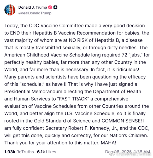 【黄金时代】美国终止对新生儿接种乙肝疫苗的建议川普:今天,美国疾病控制与预防中心(CDC)疫苗委员会做出了一个非常明智的决定,终止了对婴儿接种乙肝疫苗的建议。绝大多数婴儿根本没有感染乙肝的风险,乙肝主要通过性传播或使用不洁针头传播。长期以来,美国的儿童疫苗接种计划要求健康婴儿接种72针疫苗,远远超过世界上任何其他国家,也远远超过实际所需。事实上,这简直荒谬!许多家长和科学家,包括我本人,都对这一“接种计划”的有效性提出了质疑!因此,我刚刚签署了一份总统备忘录,指示卫生与公众服务部“加快”对世界其他国家的疫苗接种计划进行全面评估,并更好地调整美国的疫苗接种计划,使其最终建立在科学和常识的黄金标准之上!我完全相信,罗伯特·F·肯尼迪部长和美国疾病控制与预防中心能够迅速、正确地完成这项工作,造福我们国家的儿童。感谢您对此事的关注。MAHA!美国和欧洲当代史川普主义研究热点现场海外新鲜事